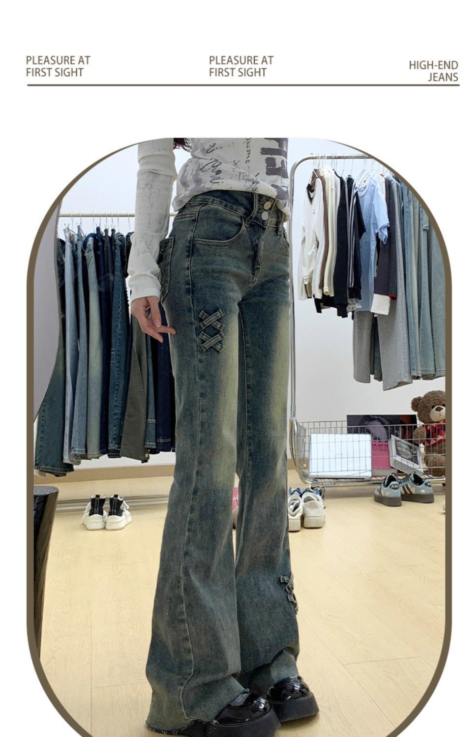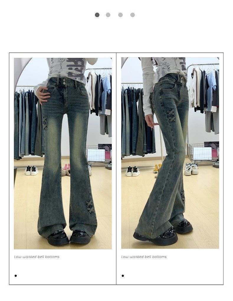 여성을위한 레트로 하이 웨이스트 부츠 청바지 2025 봄, 가을 새로운 슬림 피트 보우 탄성 말굽 플레어 바지스토어 가기