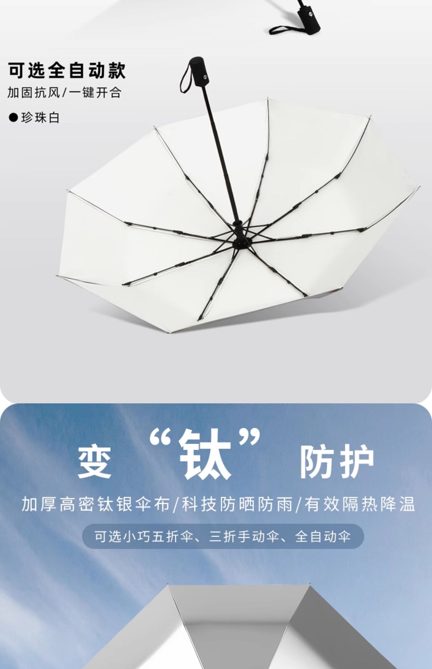 • 수동 모델 - 두꺼운 티타늄 실버 - 펄 화이트 - 자외선 차단 강화 및 확장된 4섹션 폴 - 비가 오나 눈이 오나 사용 가능