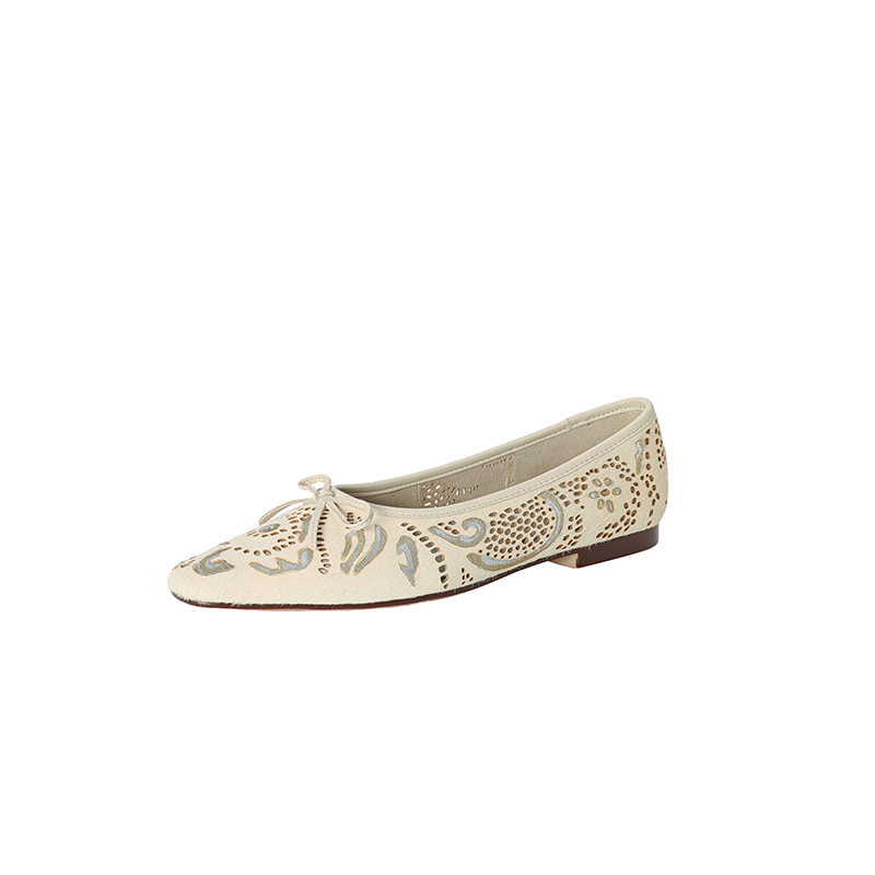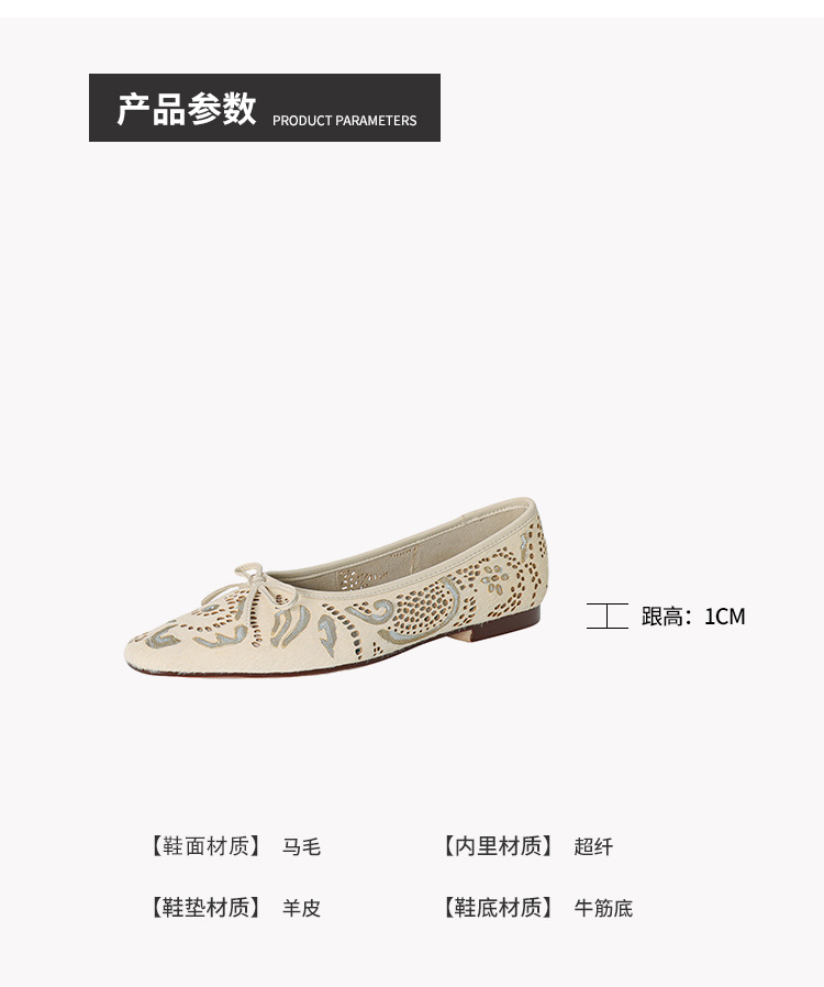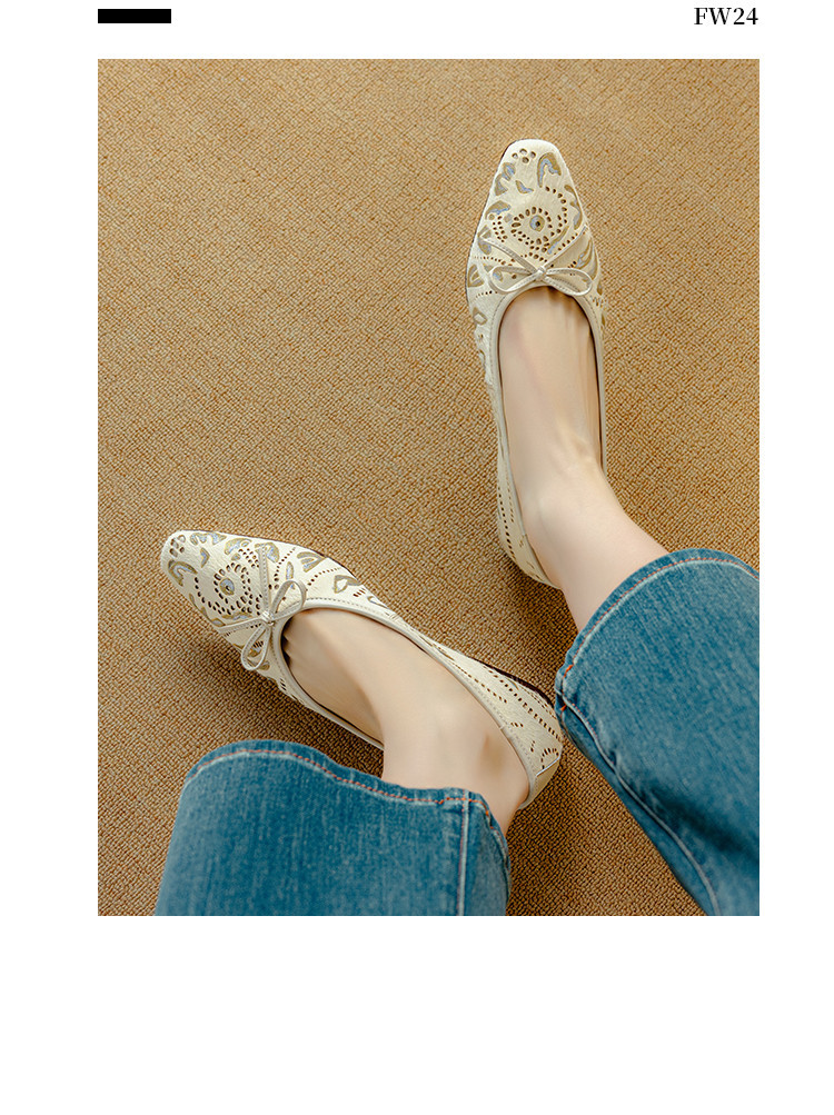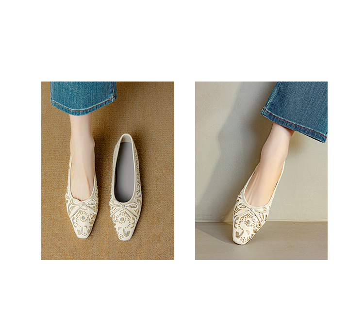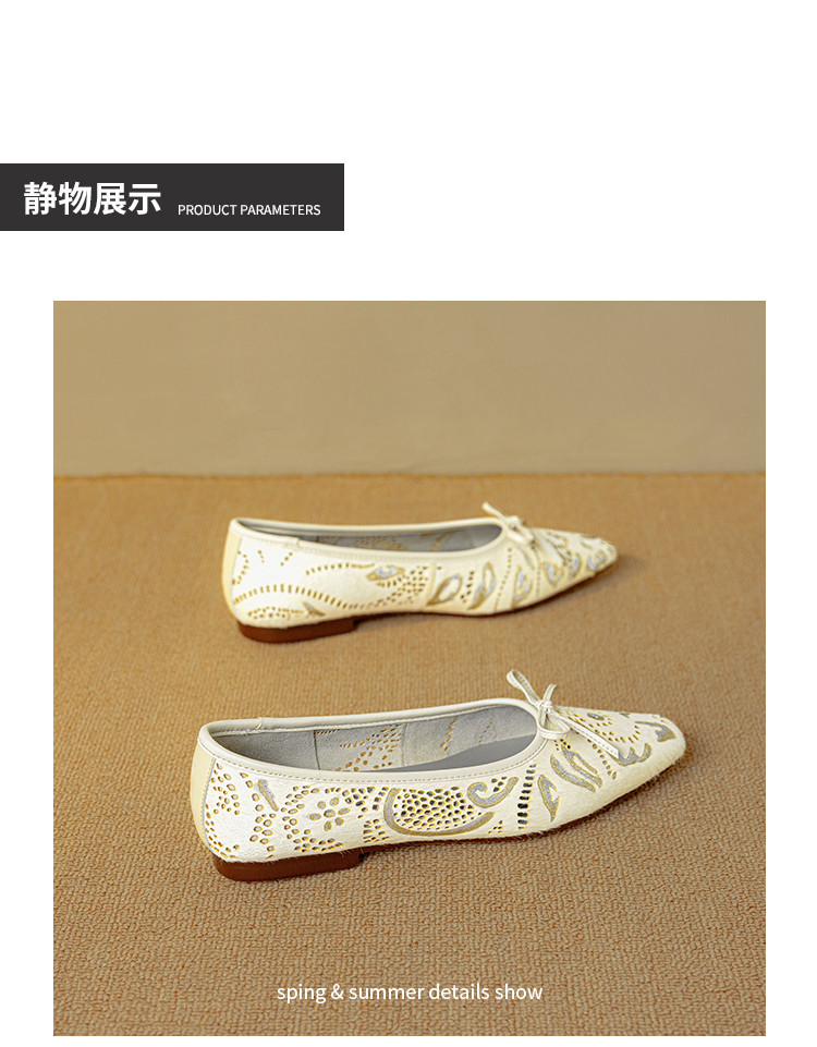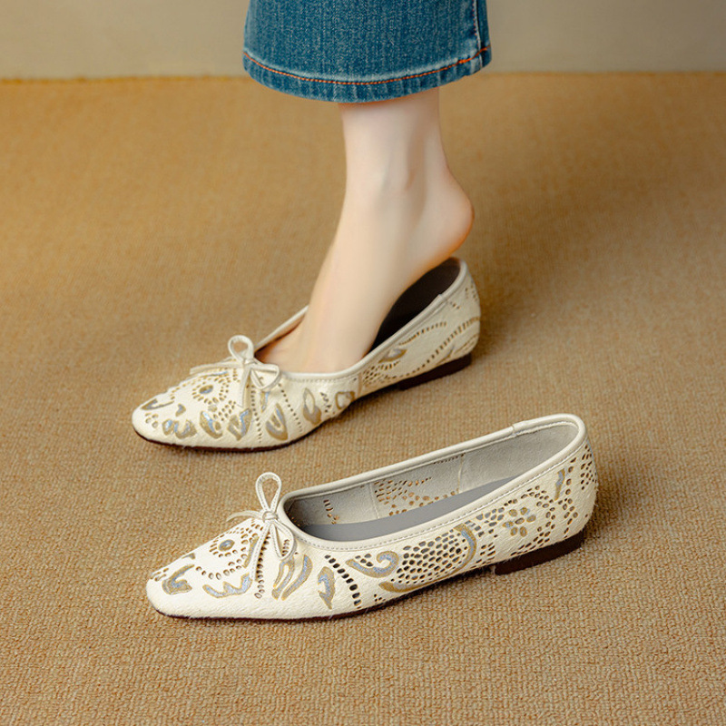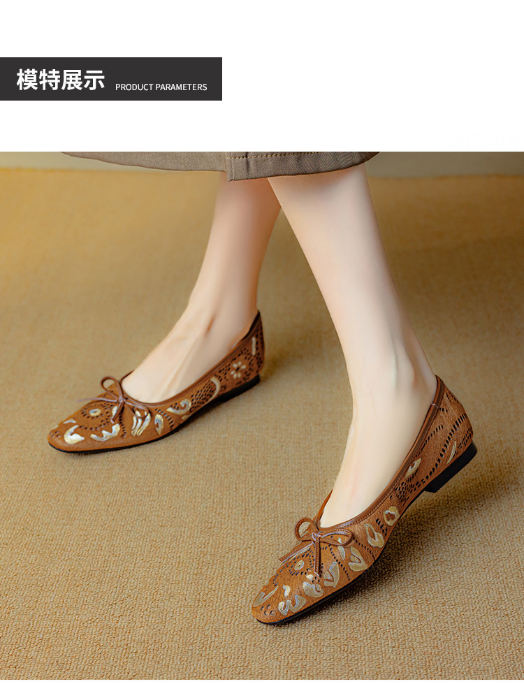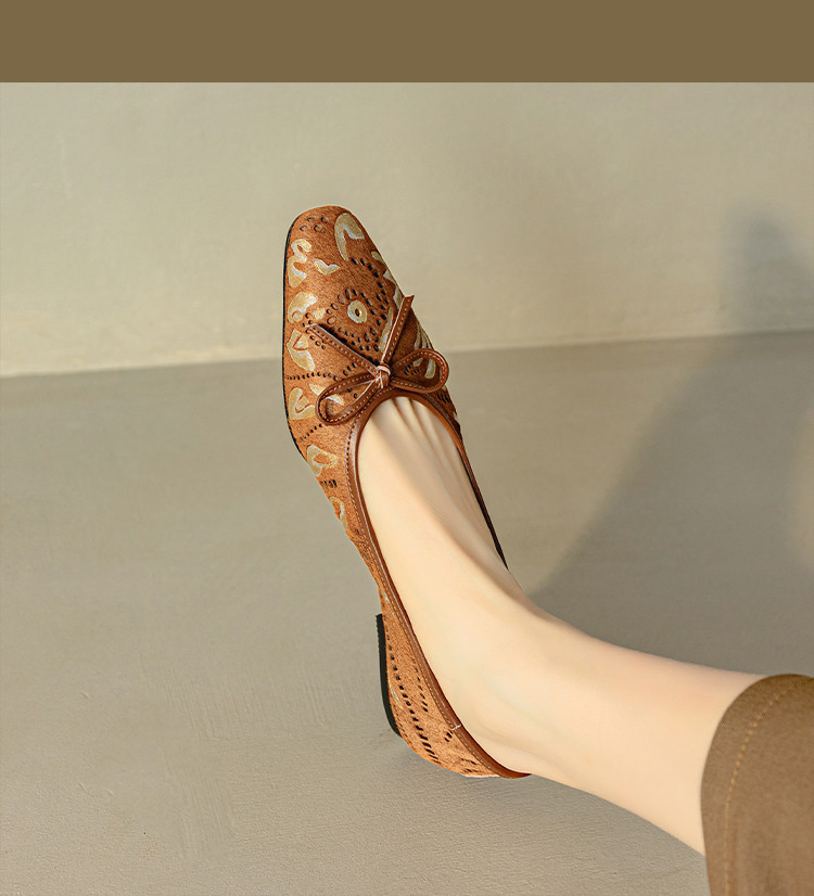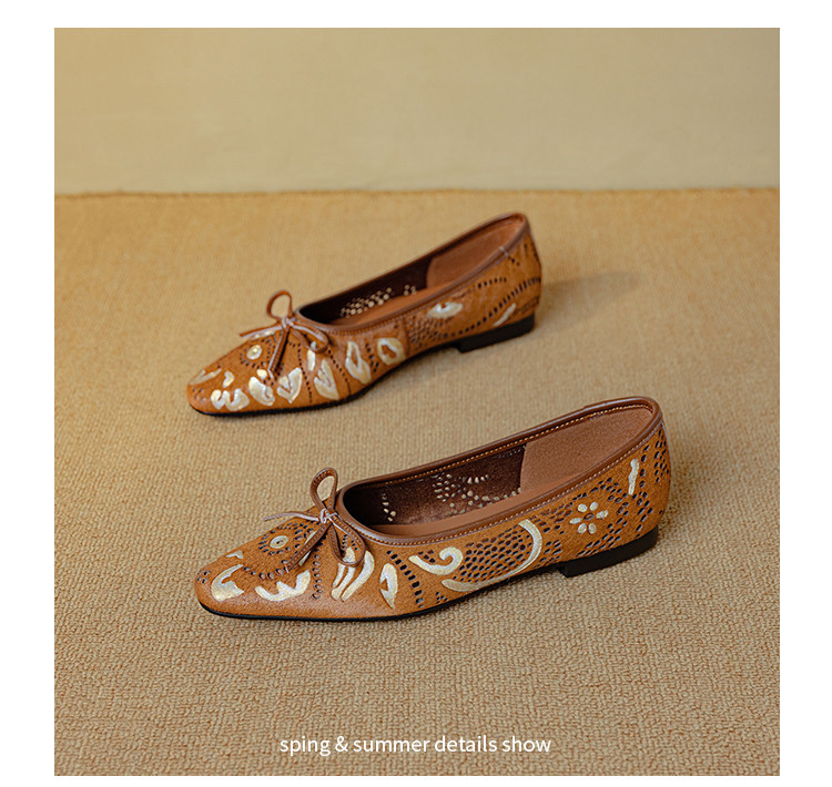 레트로 스퀘어 토 말털 조각 여성용 플랫 슈즈, 리본매듭 플랫 슈즈, 중공 에스닉 스타일 통근용 소형 가죽 신발