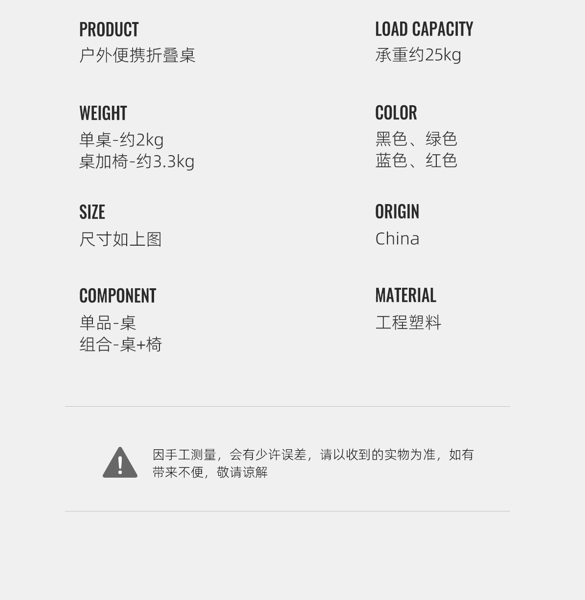 颜 量:单桌- 约2kg、桌+椅-约3.3 kg