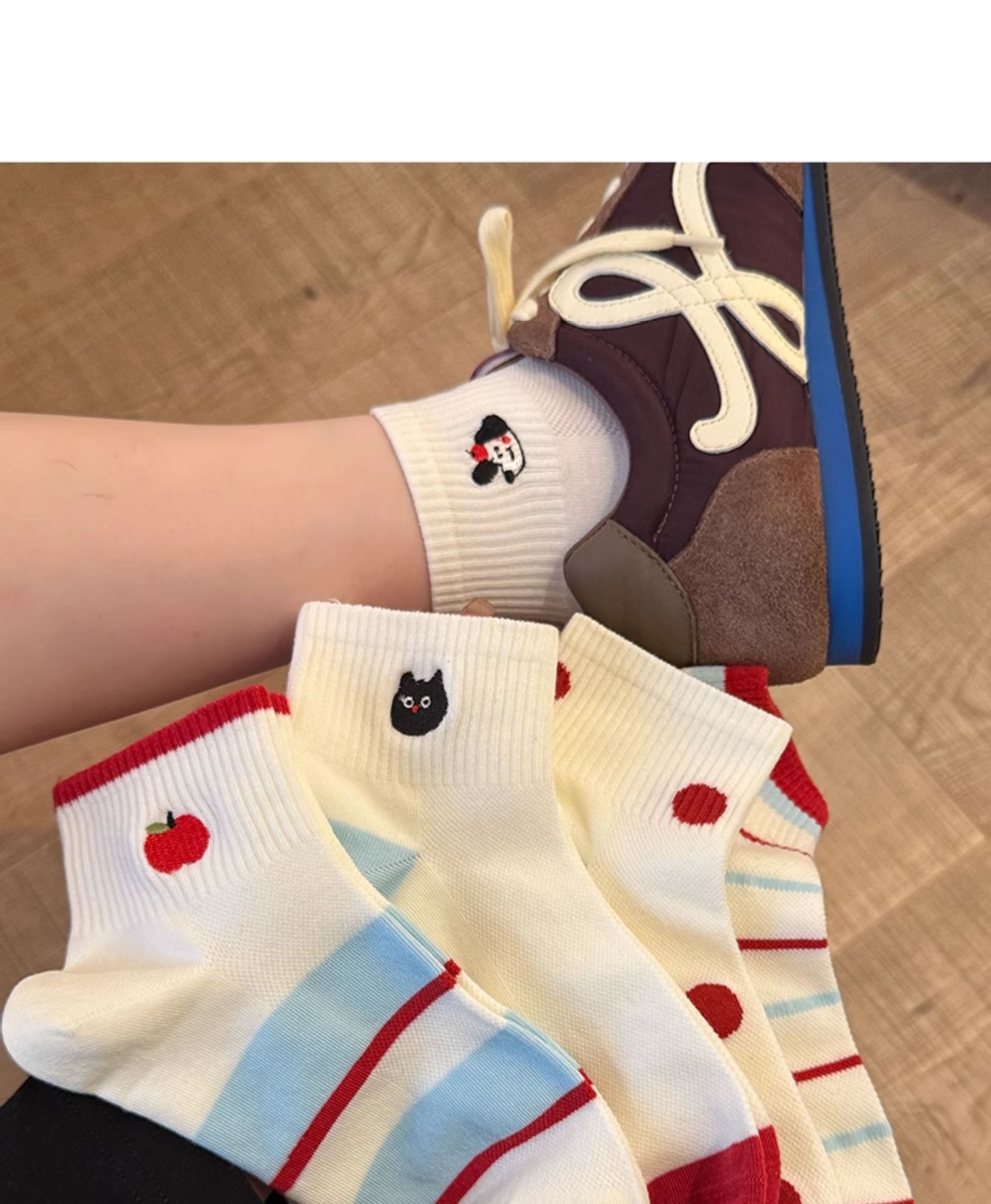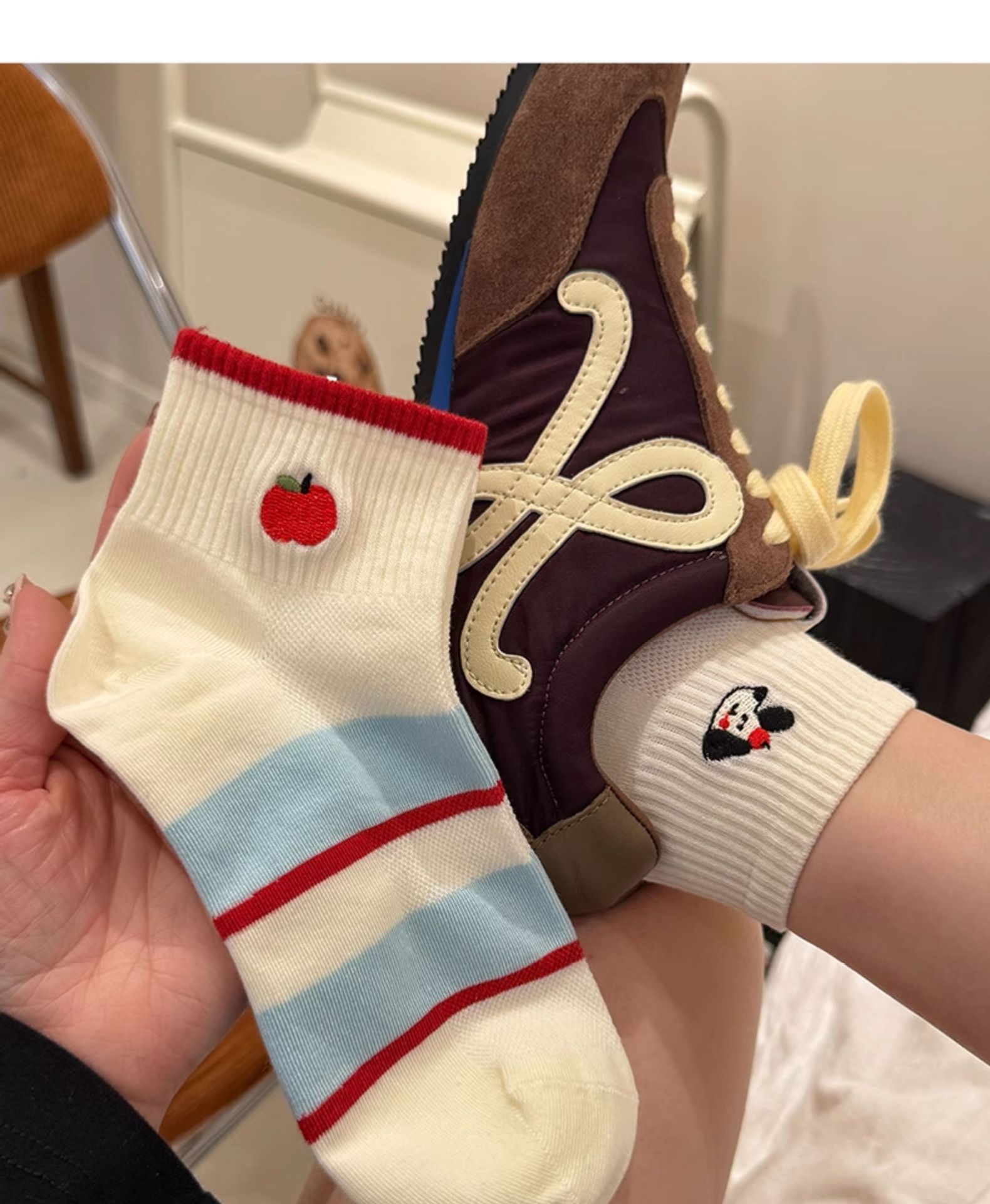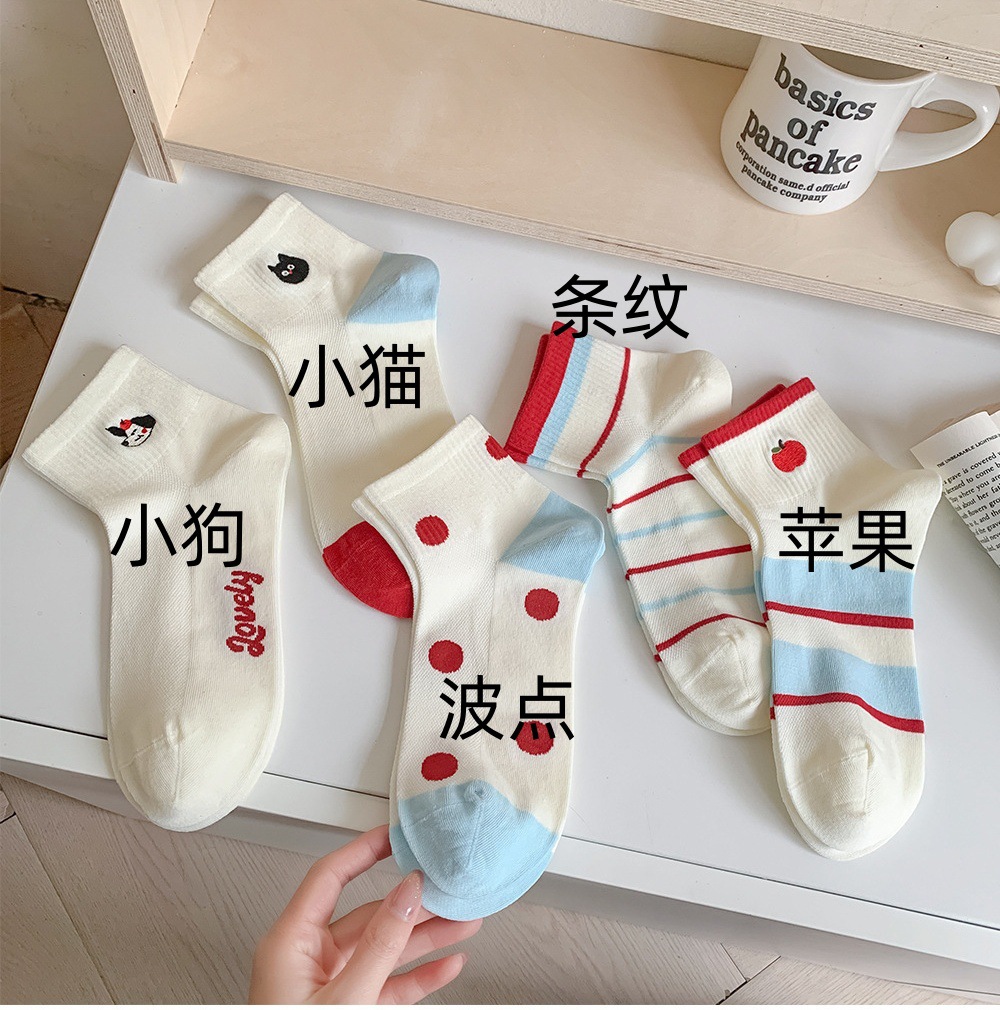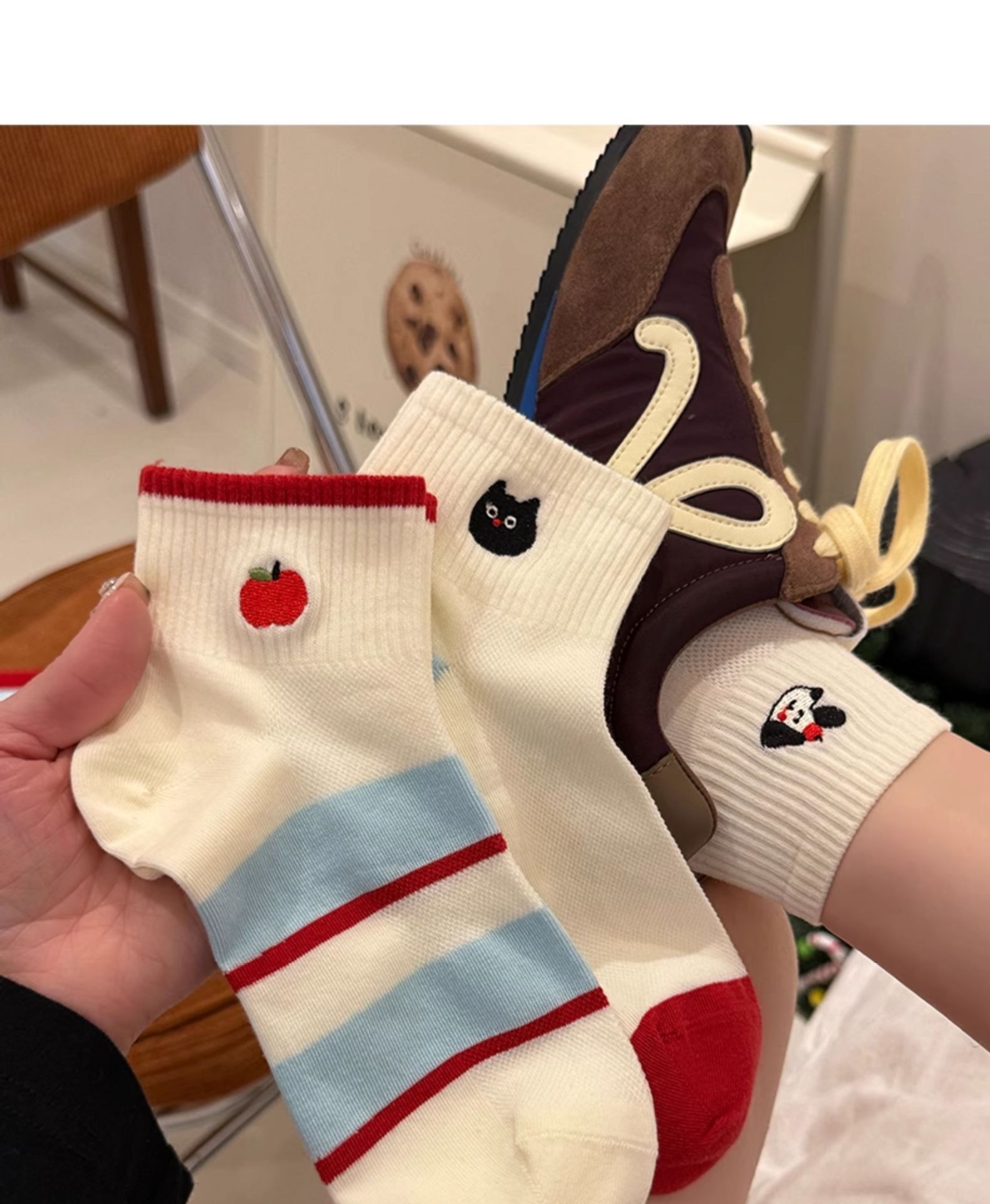 여름 얇은 양말 여성 통기성 INS 스타일 만화 수 놓은 면 양말 줄무늬 폴카 도트 중간 튜브 양말 도매