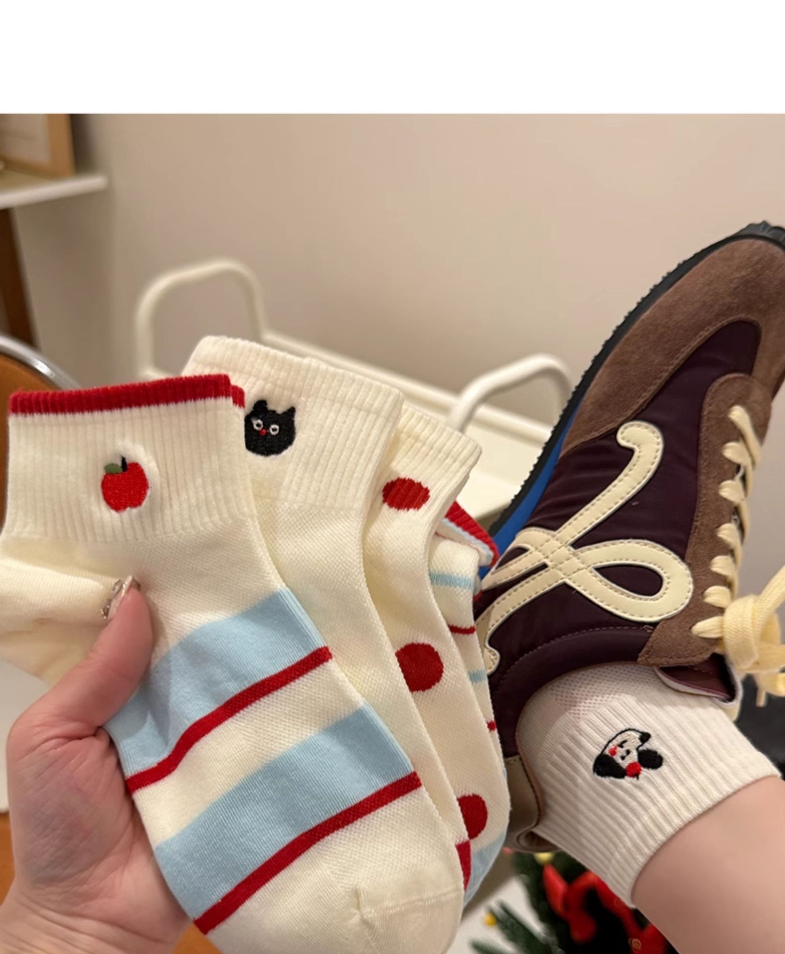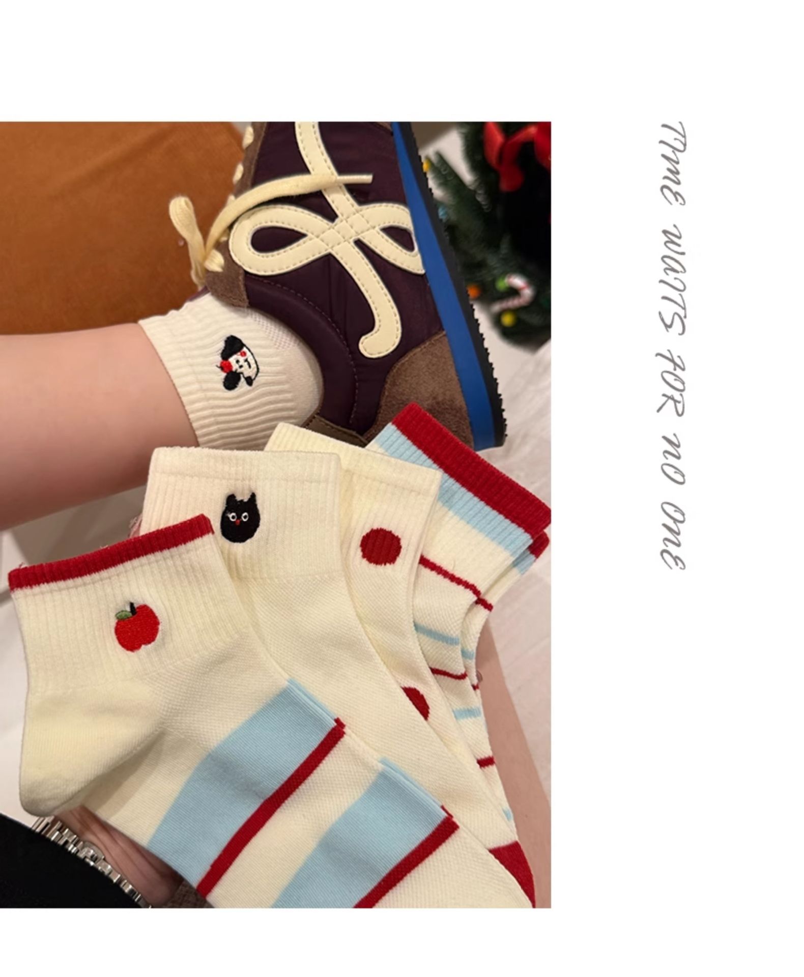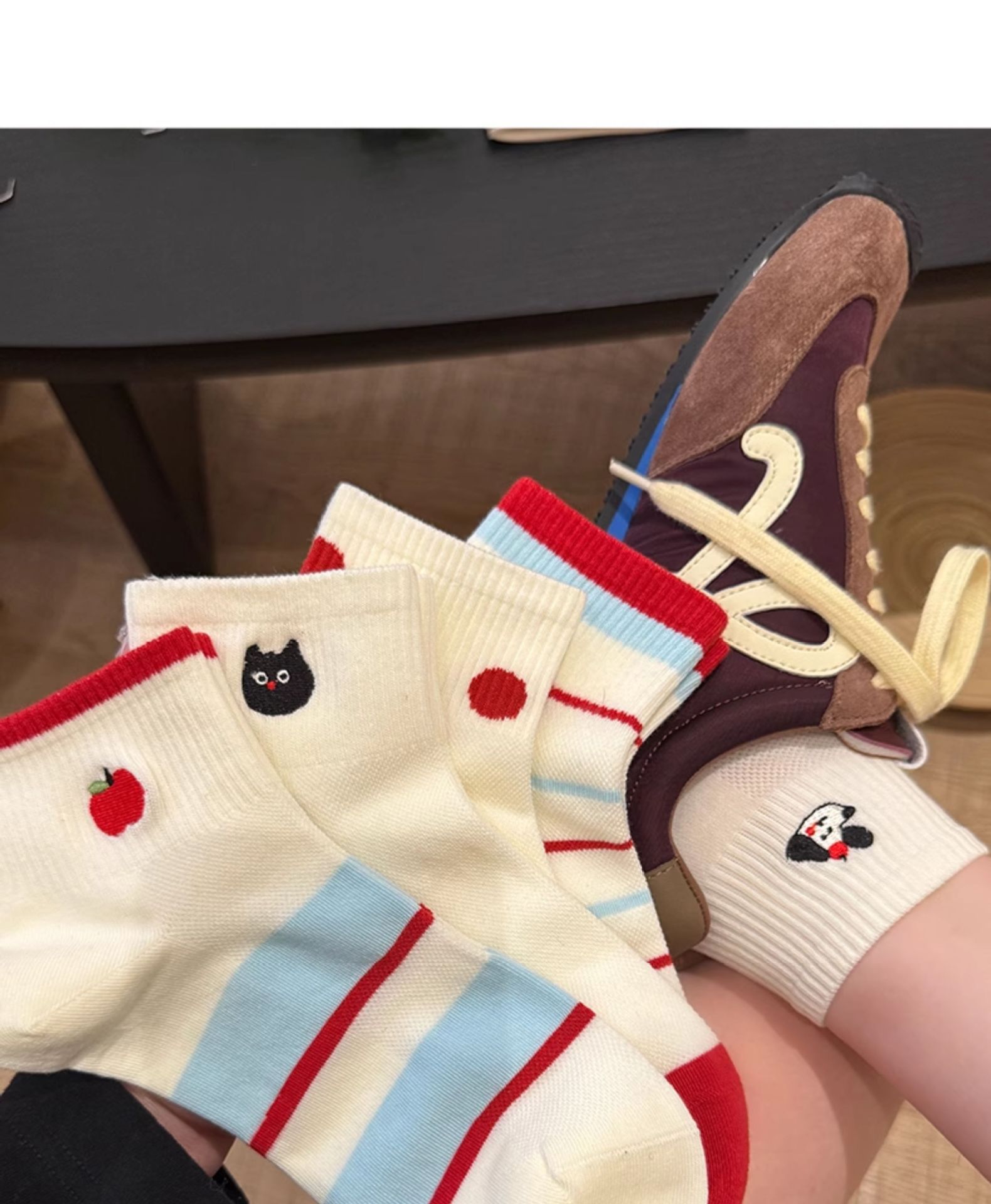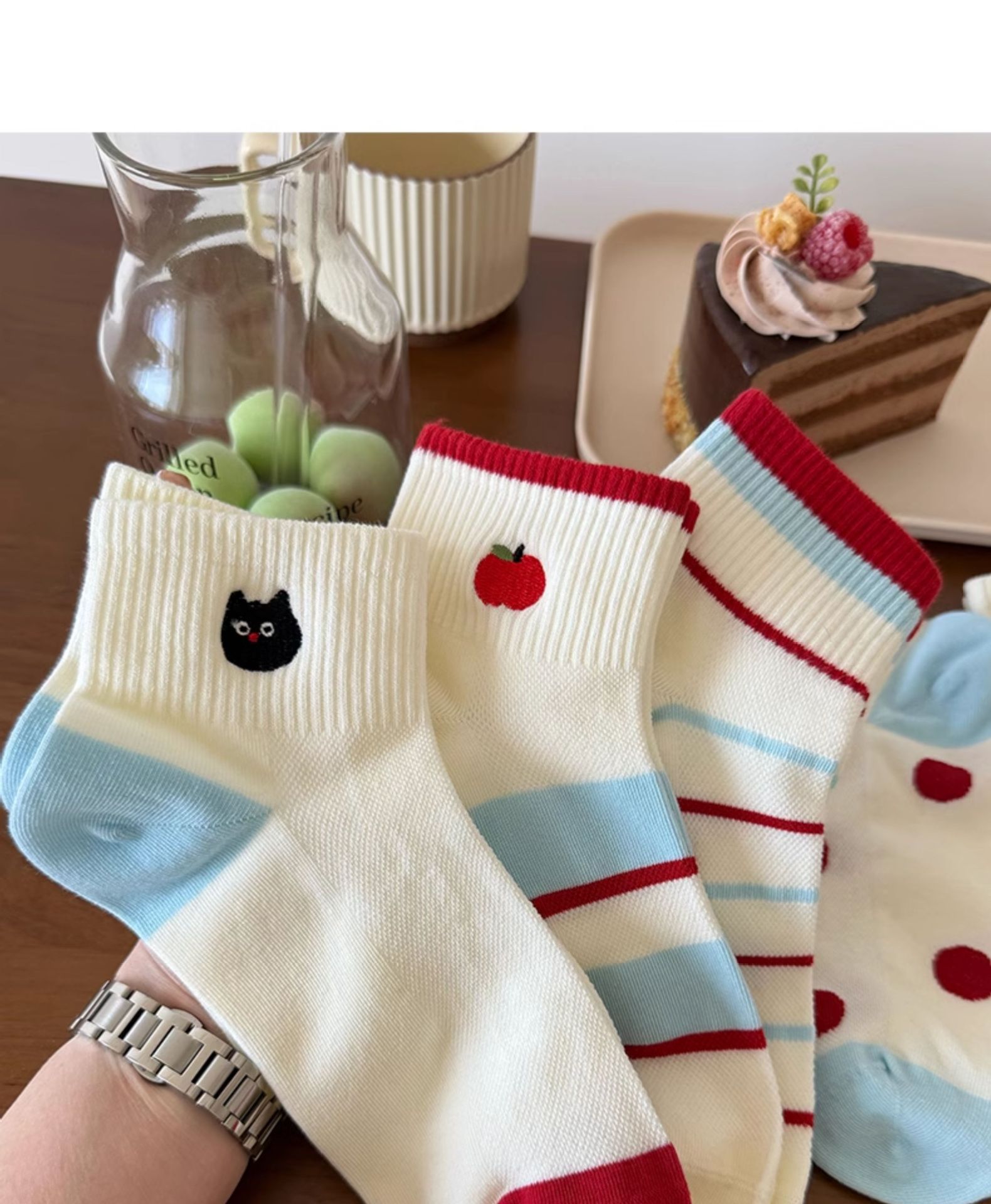 여름 얇은 양말 여성 통기성 INS 스타일 만화 수 놓은 면 양말 줄무늬 폴카 도트 중간 튜브 양말 도매
