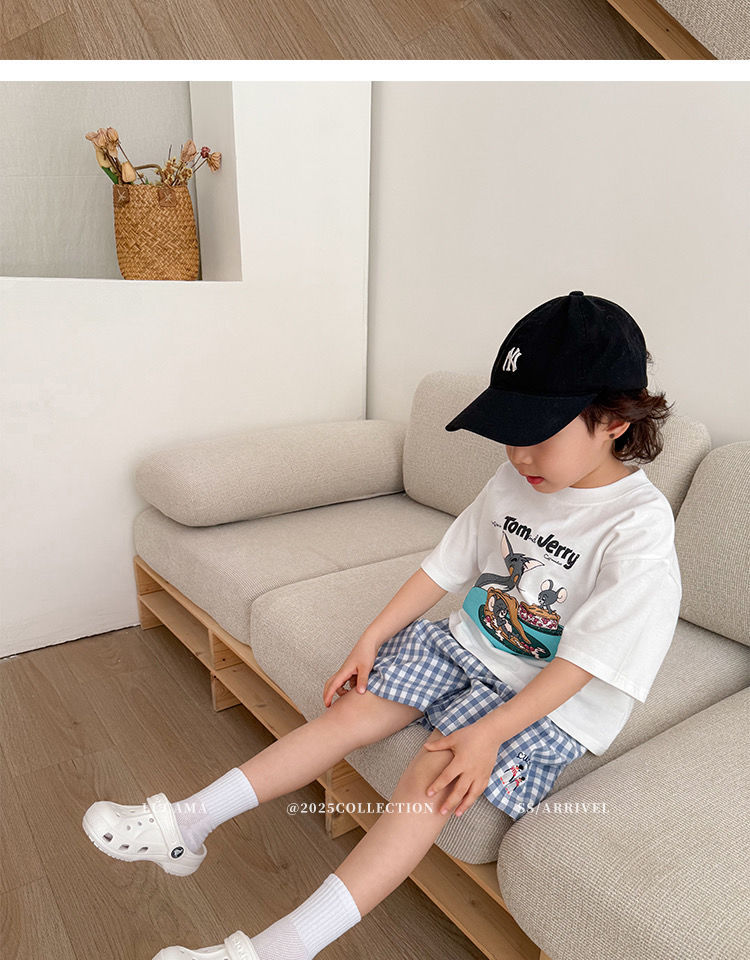 남성과 여성을 위한 여름 정장, 맞춤형 애니메이션 순면 흰색 반팔 캐주얼 격자 무늬 바지, 아동용 투피스 세트스토어 가기