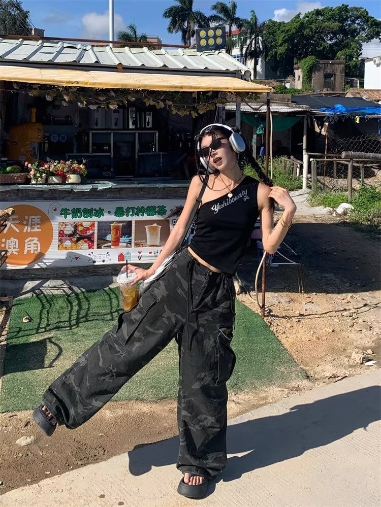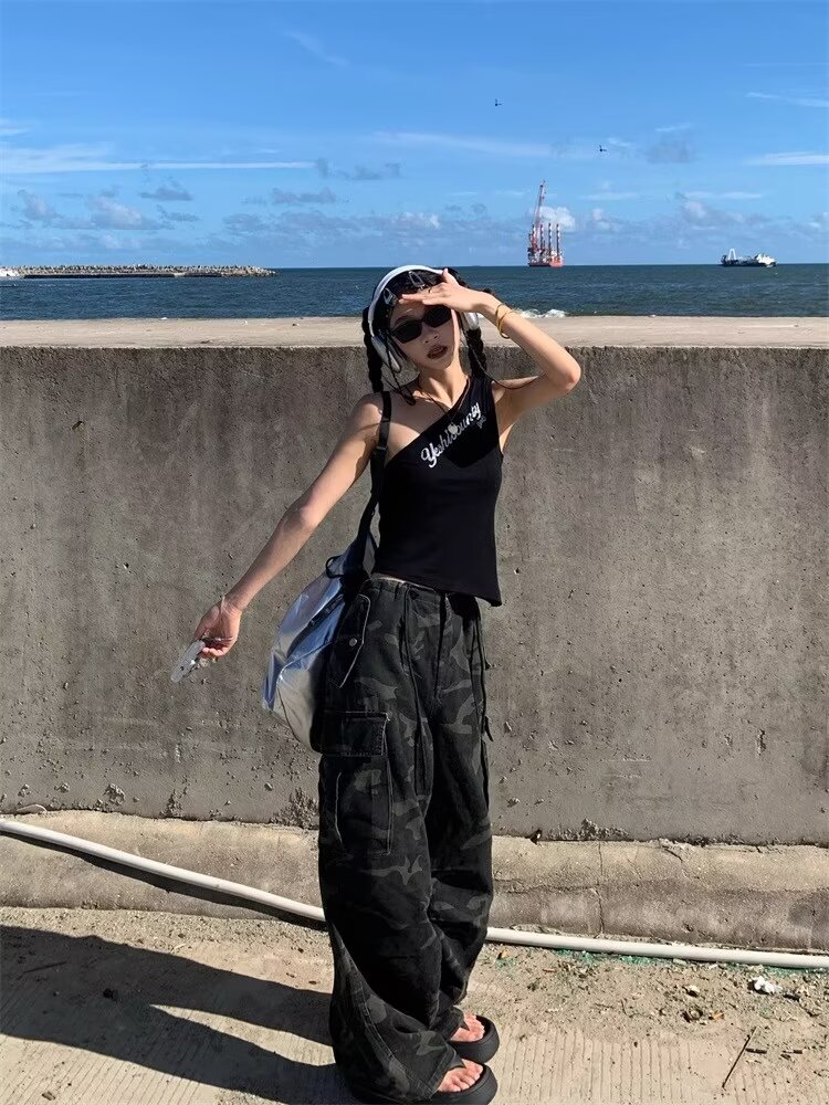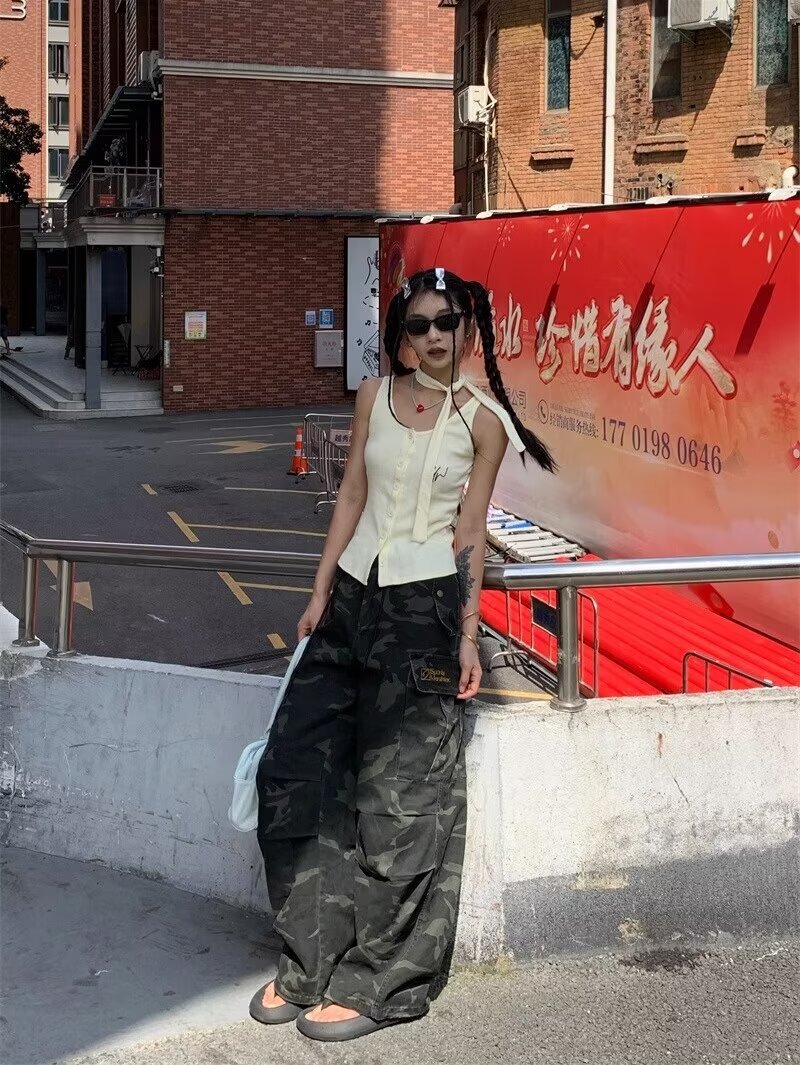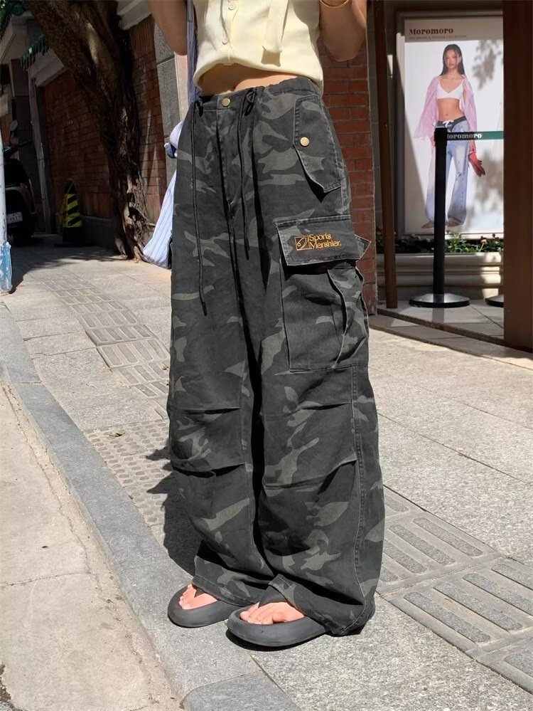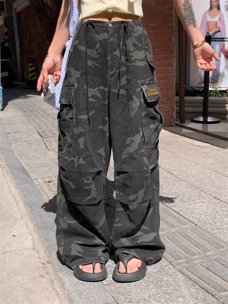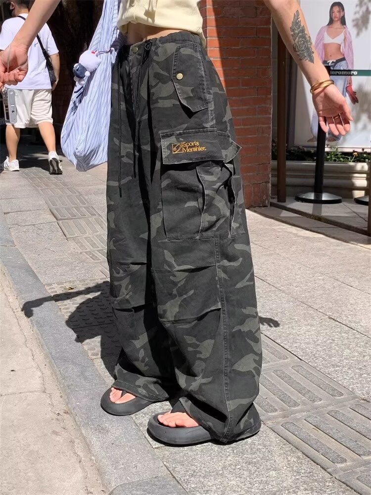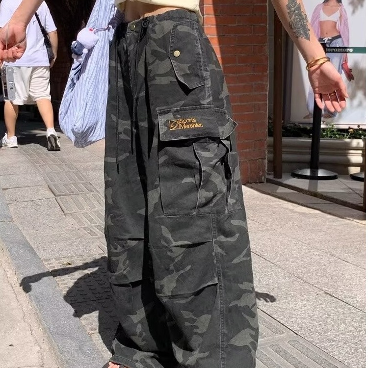 남성용 육군 녹색 위장 청바지 2025 여름 새로운 주름 낙하산 바지 잘 생긴 느슨한 통근 바지 크로스 보더스토어 가기