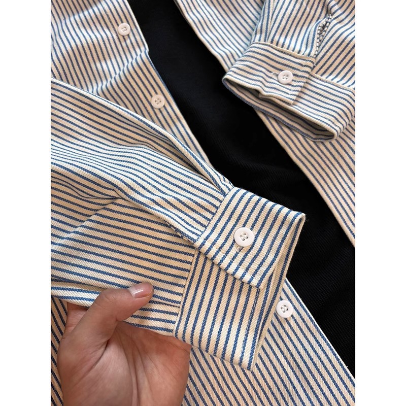파란색과 흰색 줄무늬 셔츠 봄과 가을 남성 일본 복고풍 레이어드 셔츠 루즈하고 다재다능한 커플 라펠 재킷스토어 가기