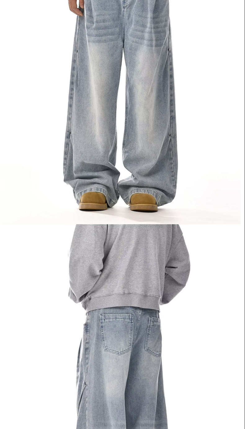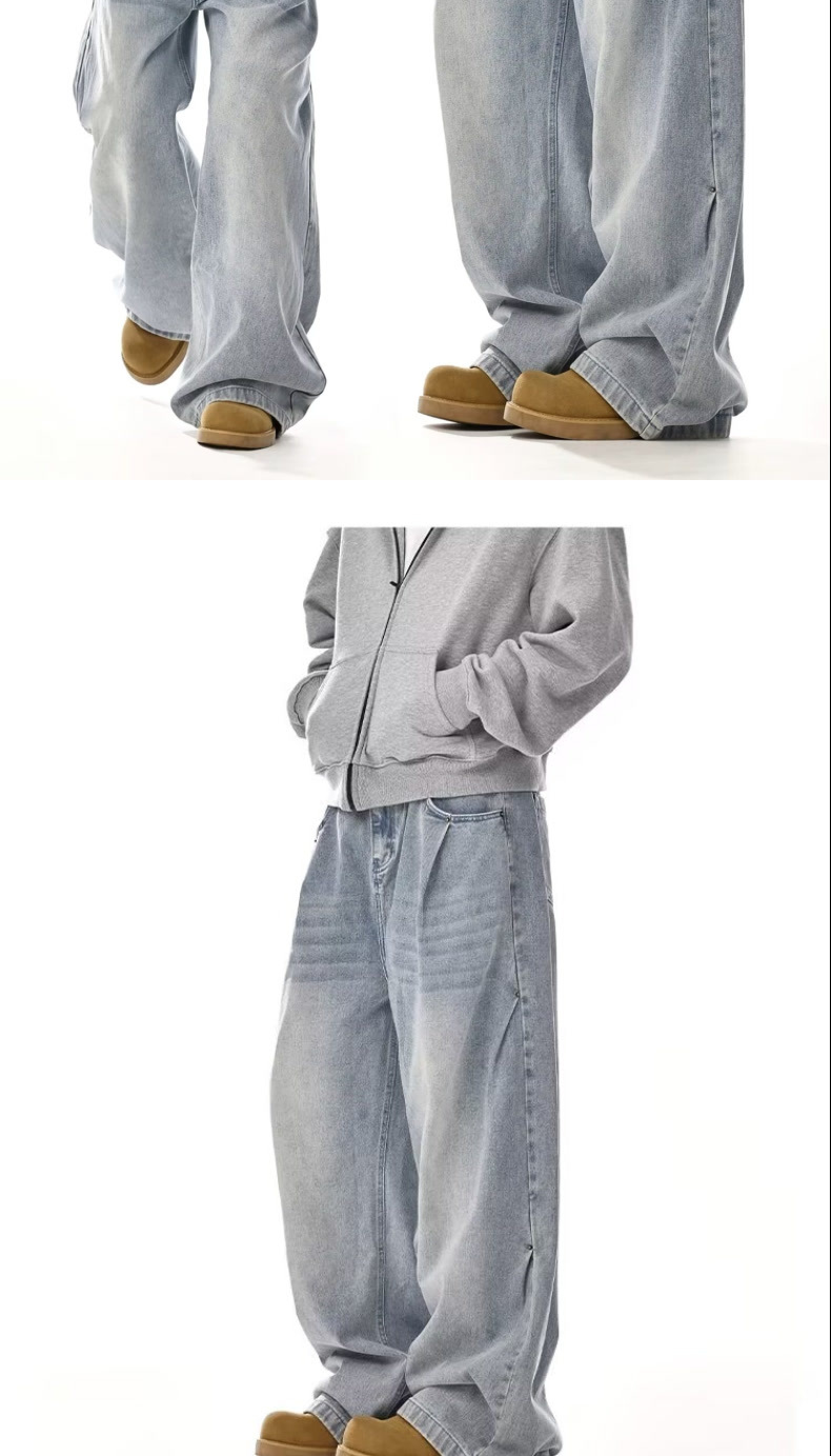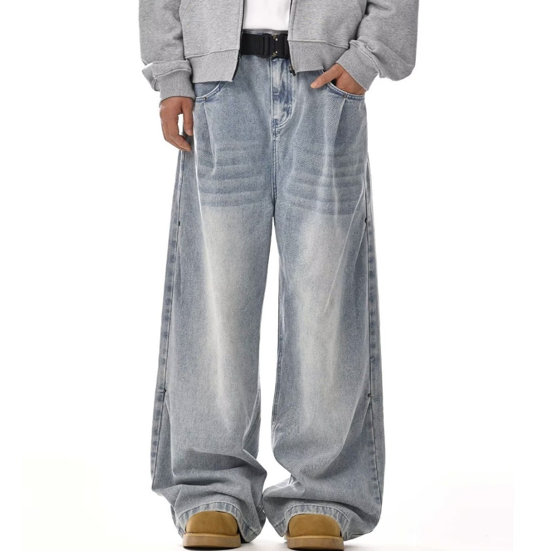 워싱 블루 청바지 남성용 아메리칸 레트로 플리츠 디자인 트렌디 루즈 스트레이트 커플 캐주얼 바지