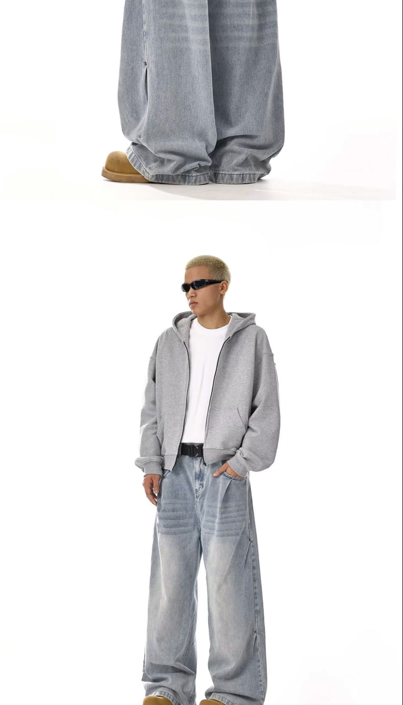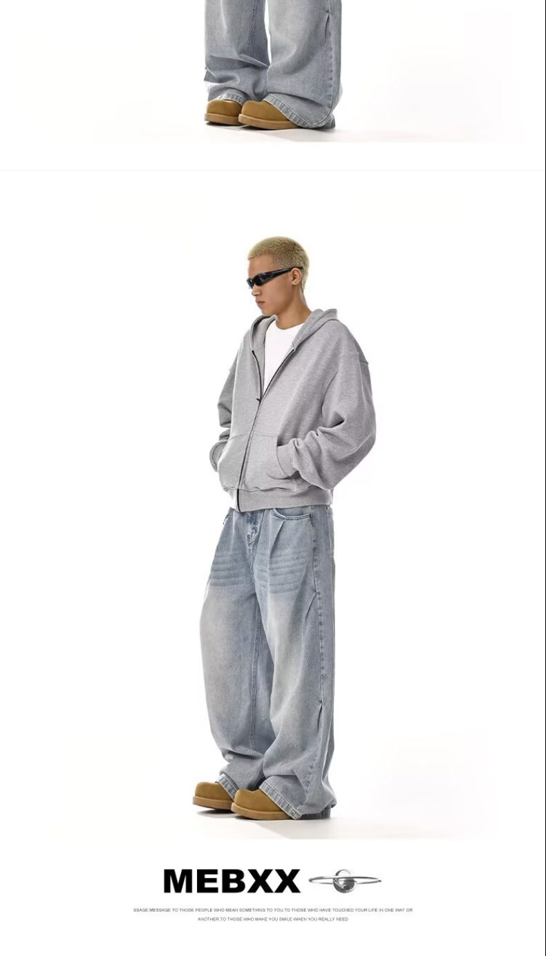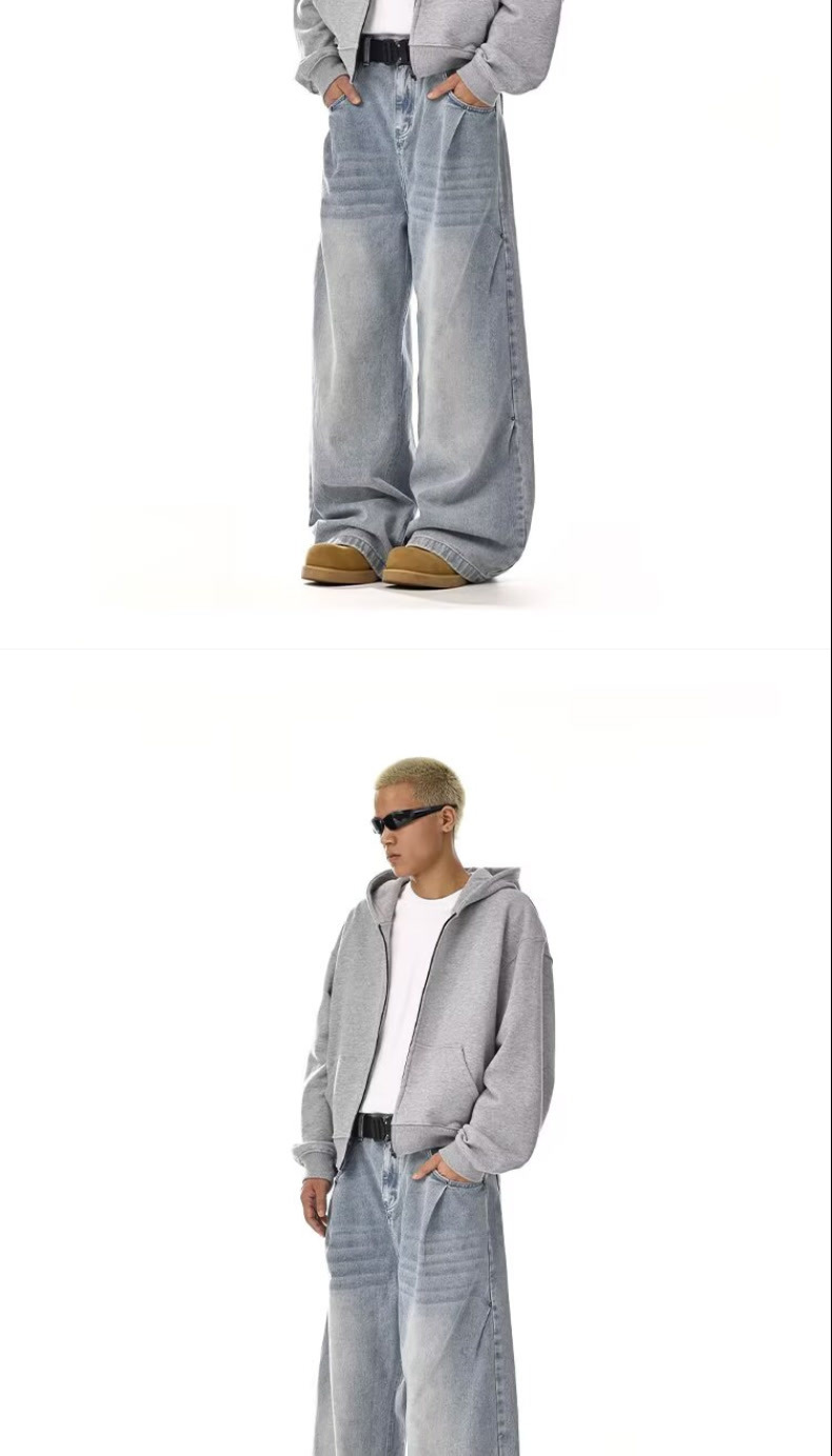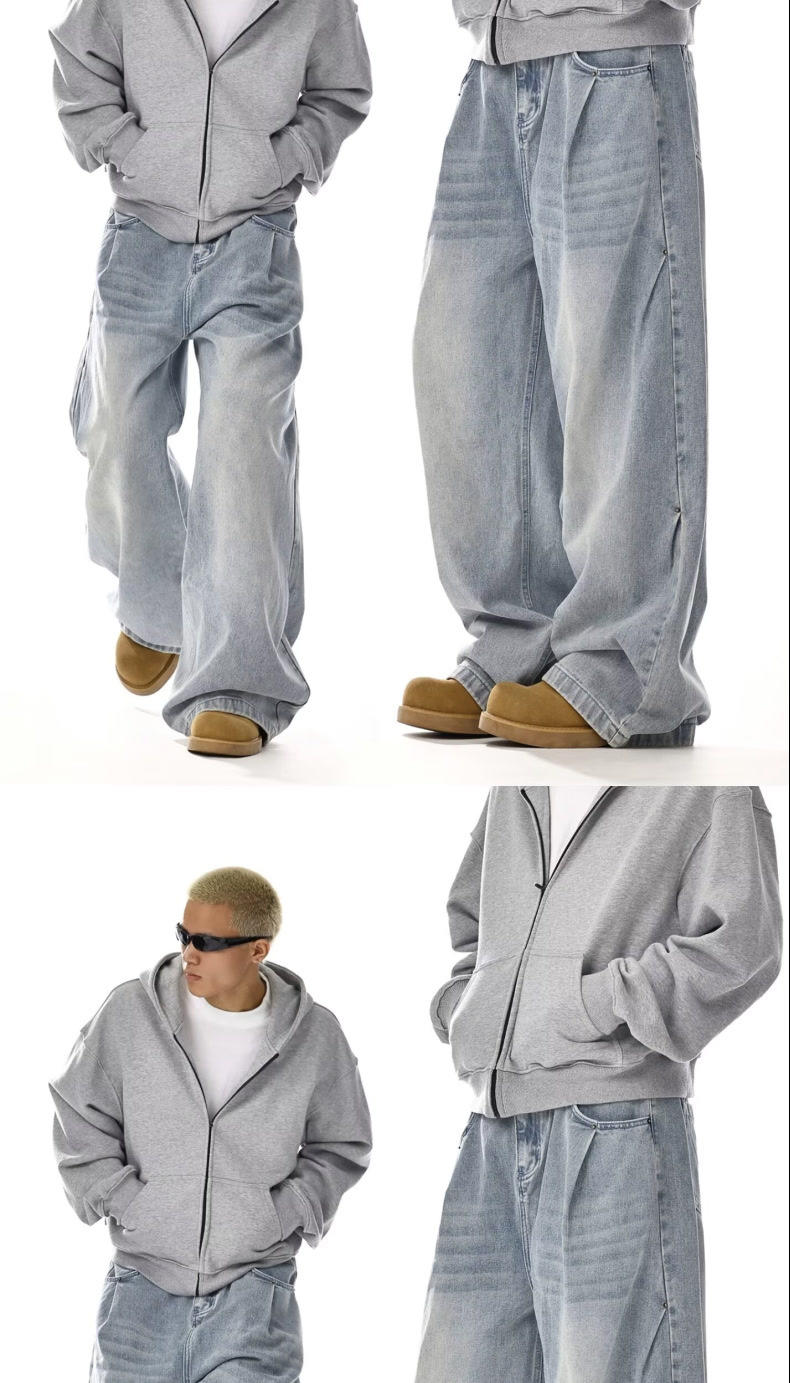워싱 블루 청바지 남성용 아메리칸 레트로 플리츠 디자인 트렌디 루즈 스트레이트 커플 캐주얼 바지