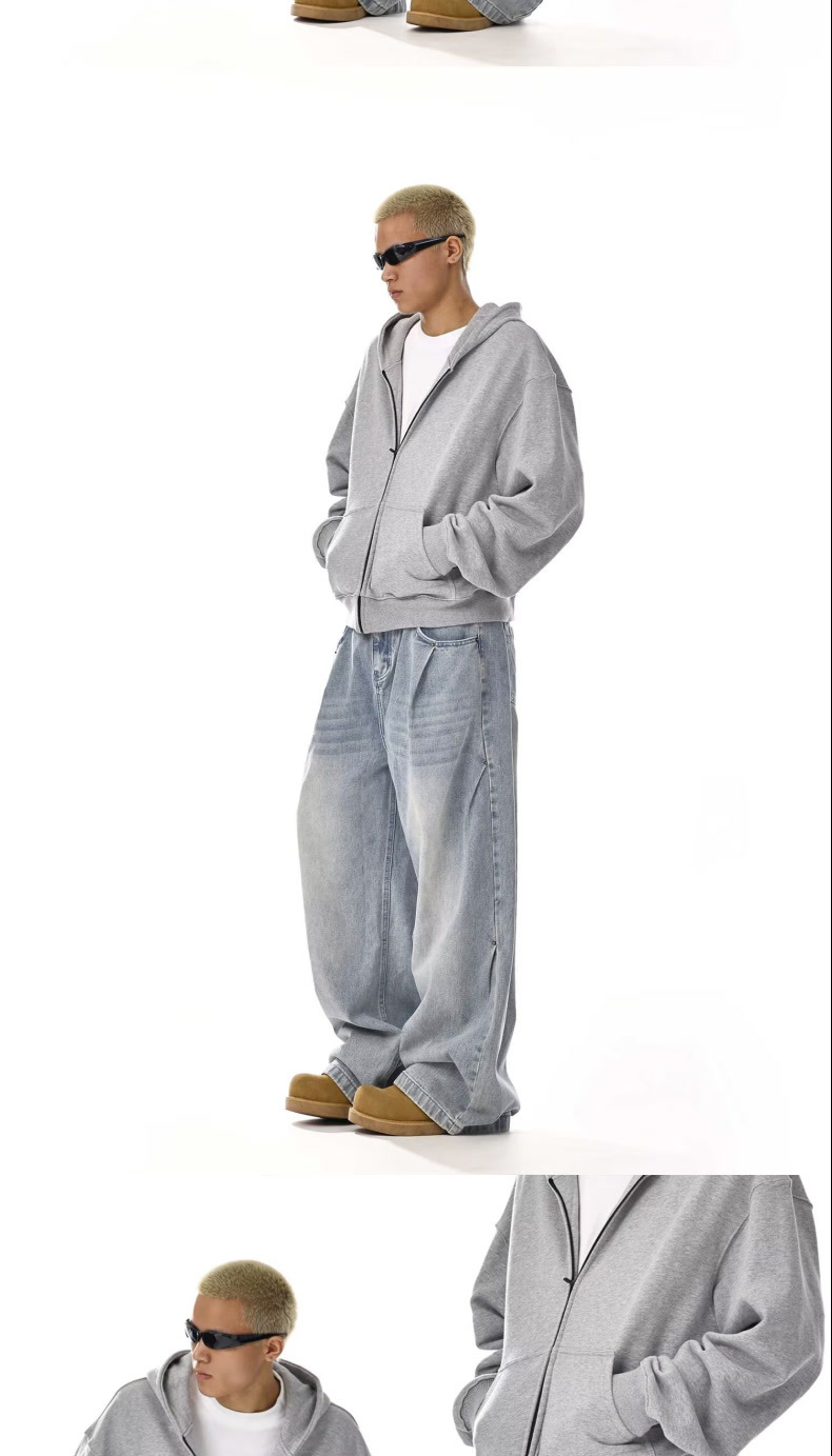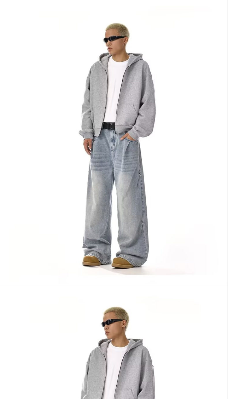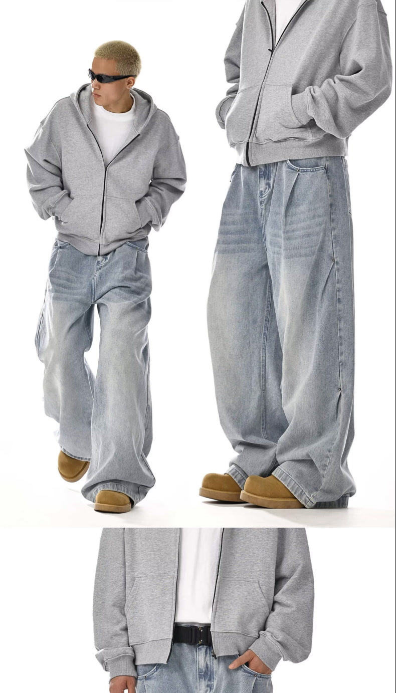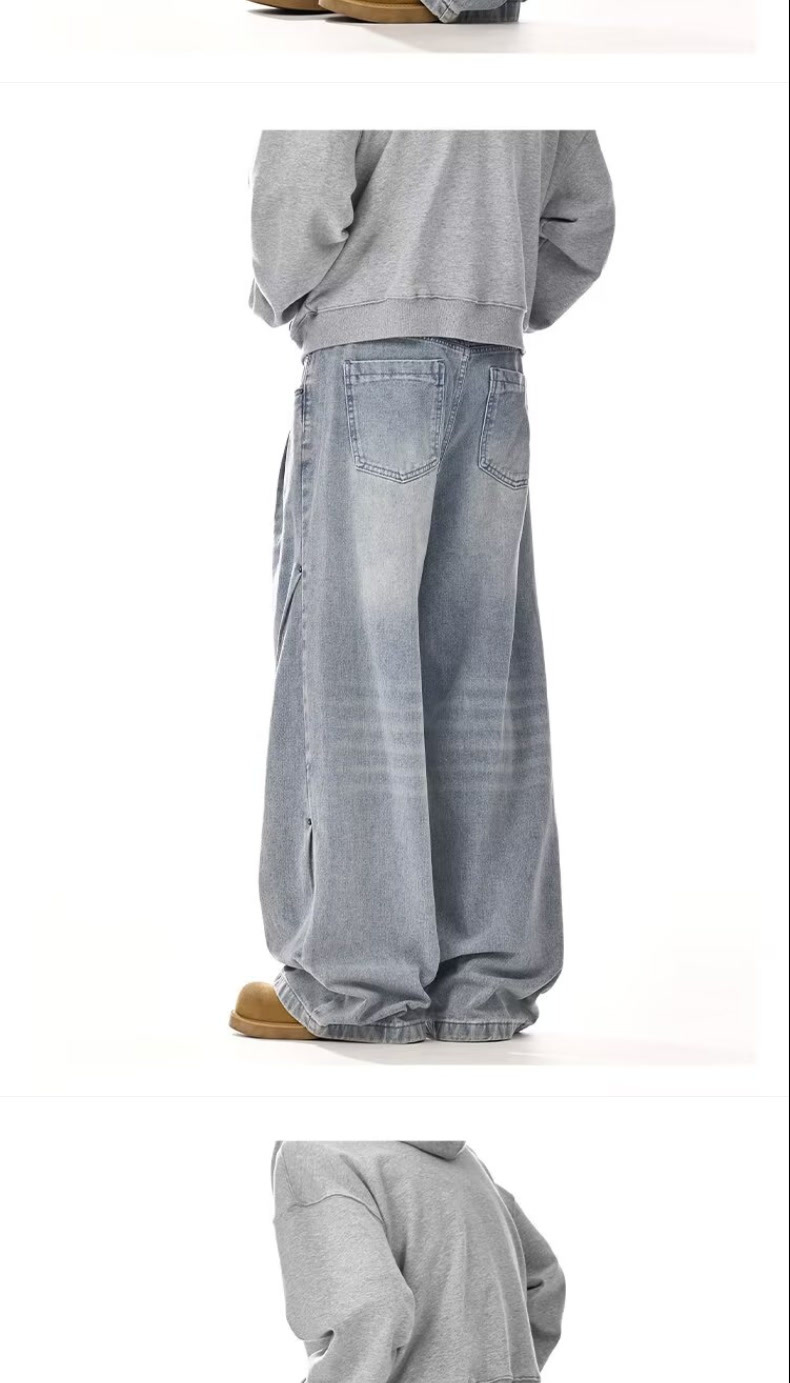워싱 블루 청바지 남성용 아메리칸 레트로 플리츠 디자인 트렌디 루즈 스트레이트 커플 캐주얼 바지스토어 가기