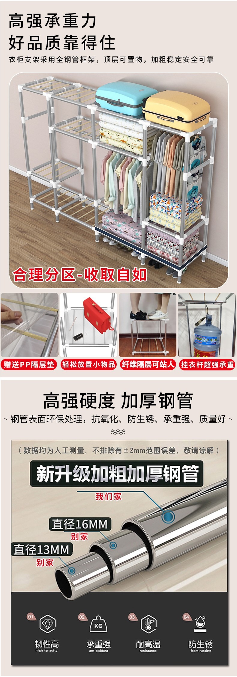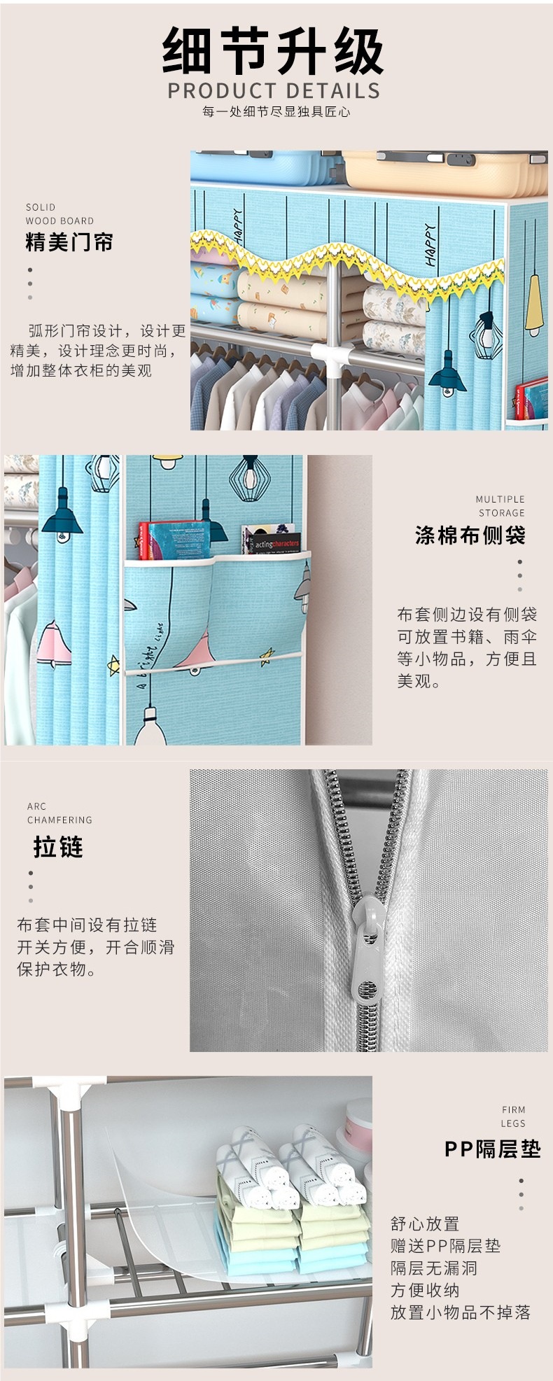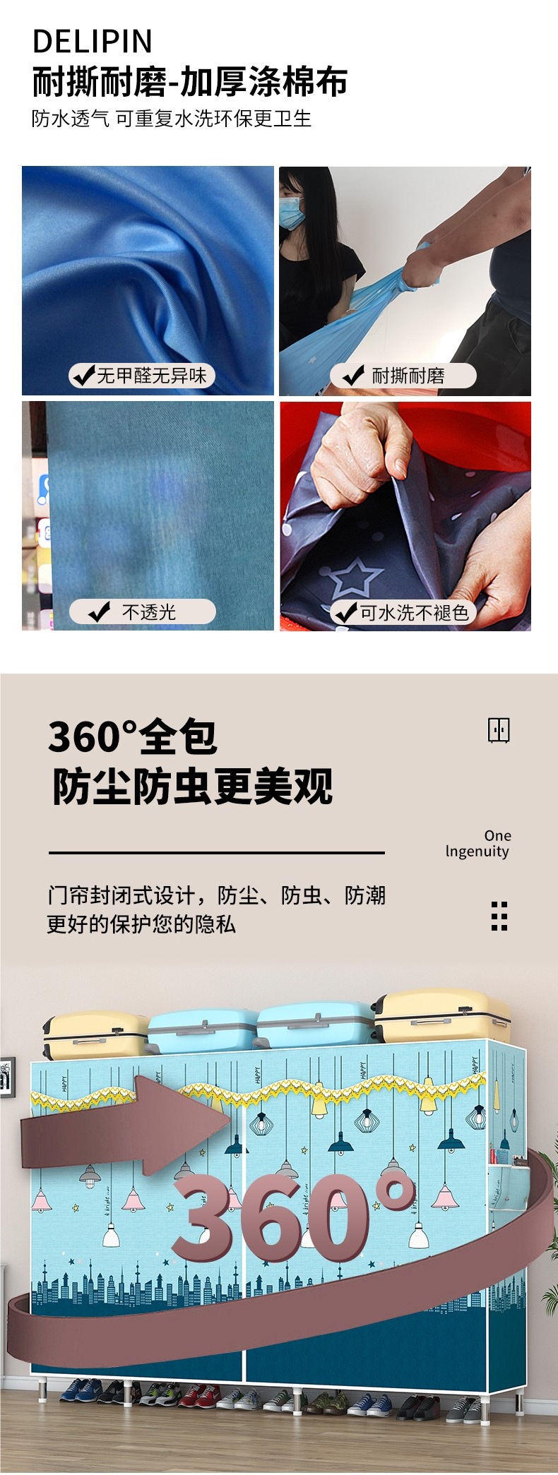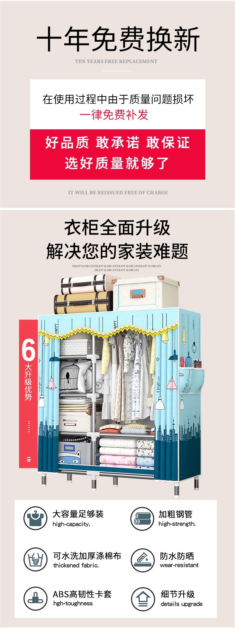 가정용 견고한 조립 임대 주택 천 옷장 전체 강철 프레임 구조 내구성 침실 간단한 옷장 두꺼운스토어 가기