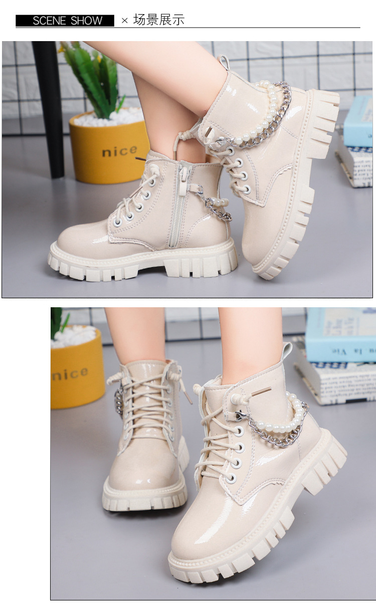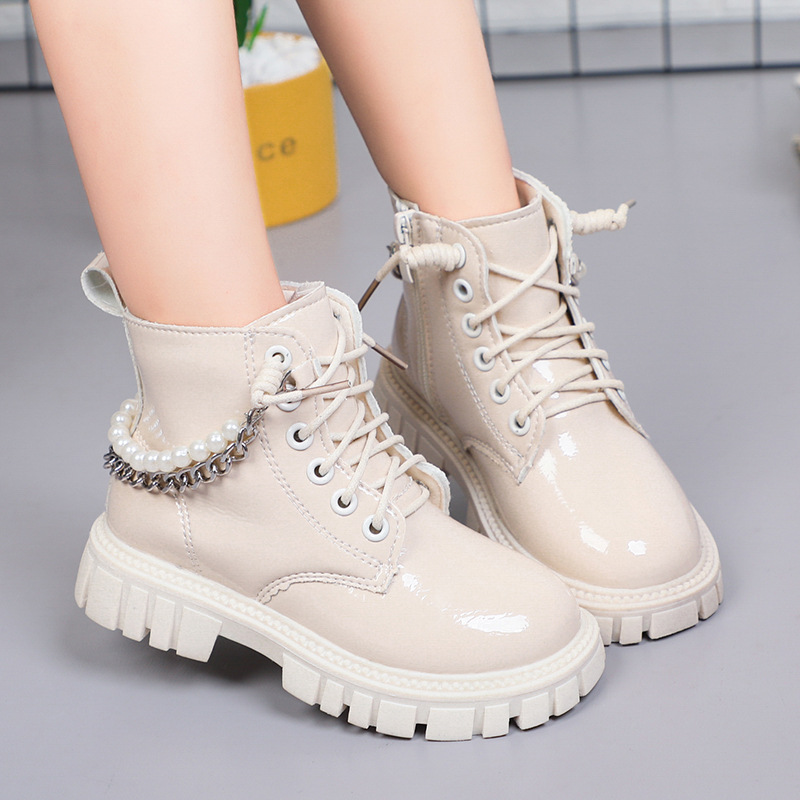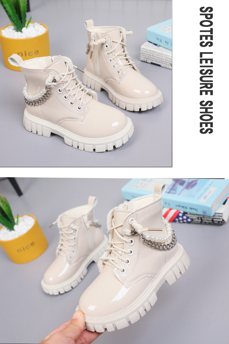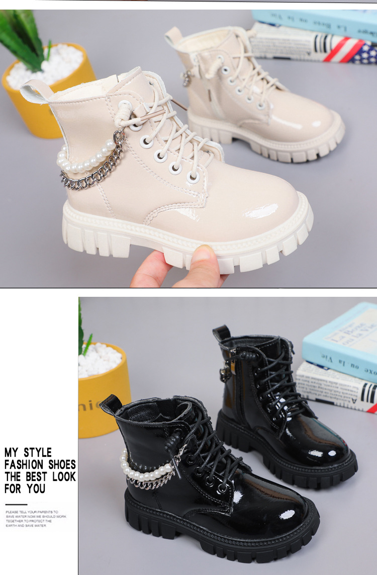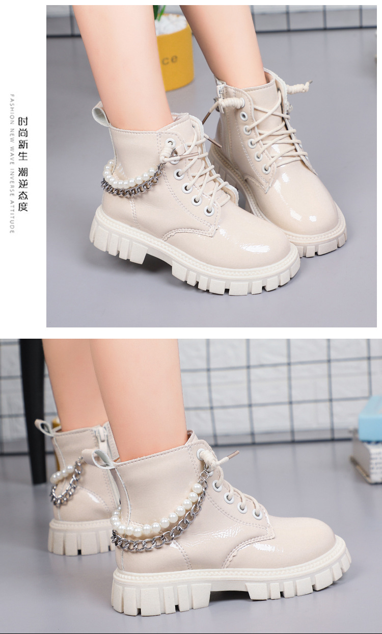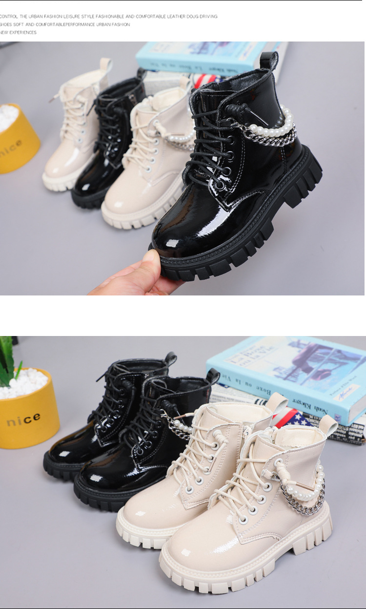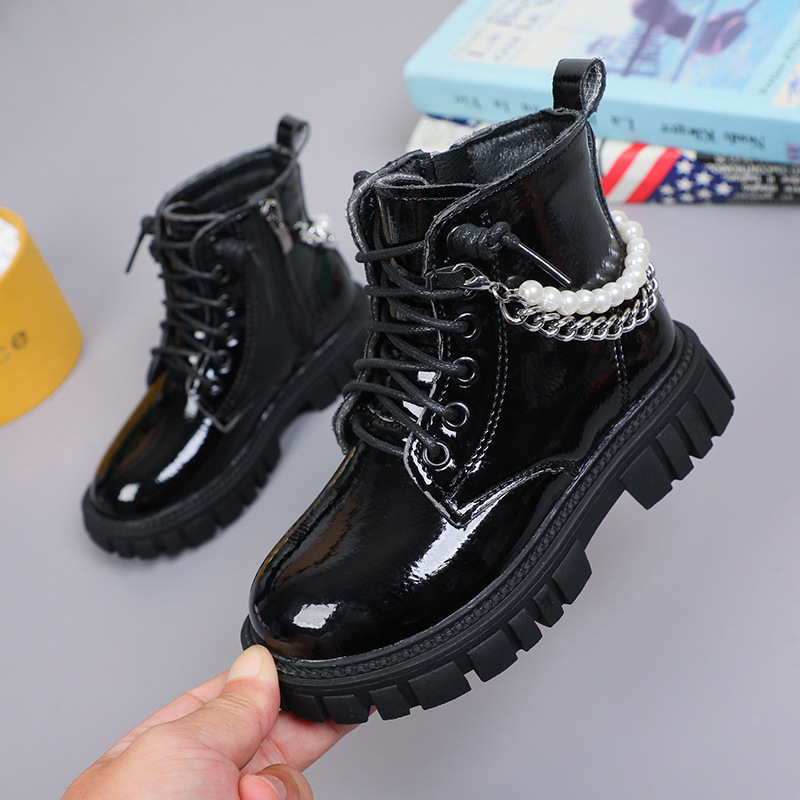 진주 체인 소녀 마틴 부츠 2025 가을, 겨울 새로운 어린이 싱글 부츠 공주 가죽 신발 부드러운 밑창 검은 색 짧은 부츠 유행스토어 가기