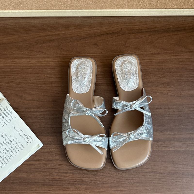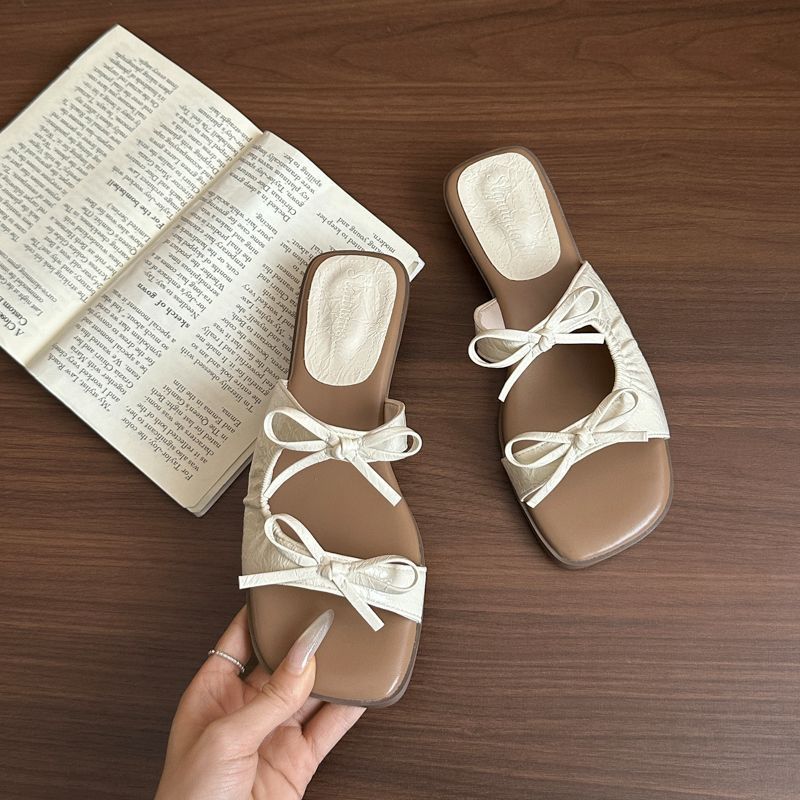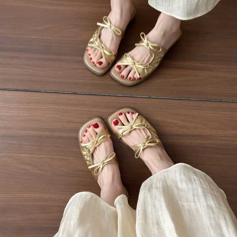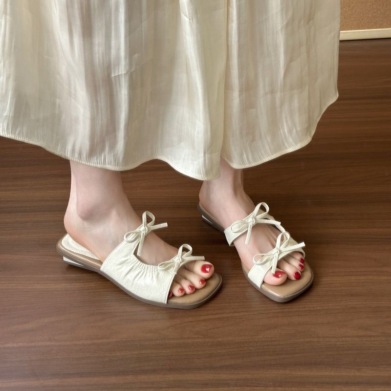 여름 아우터용 여성용 프렌치 스퀘어 토 다용도 요정 스타일 샌들 2025 여름 신작 보우 플랫 슬리퍼스토어 가기