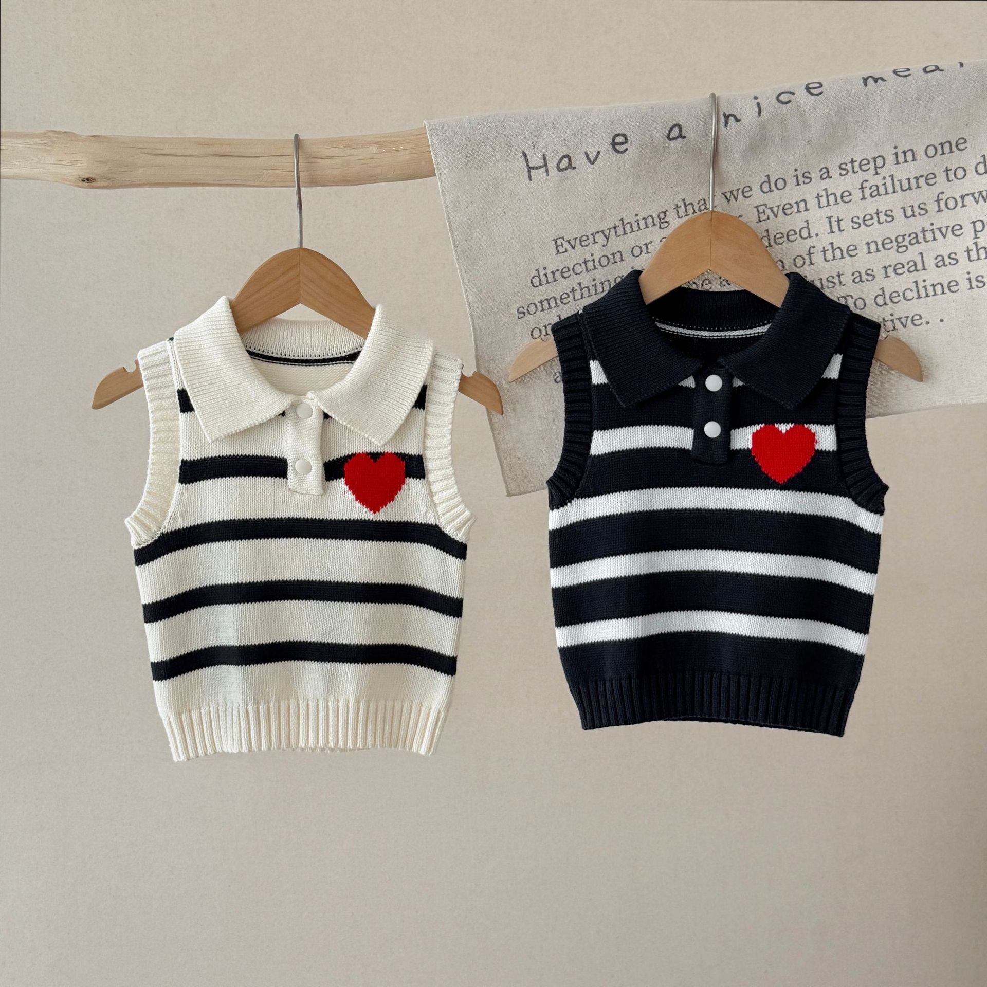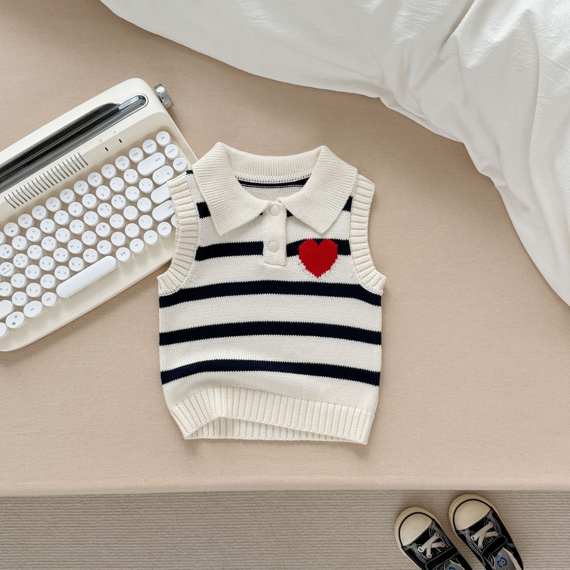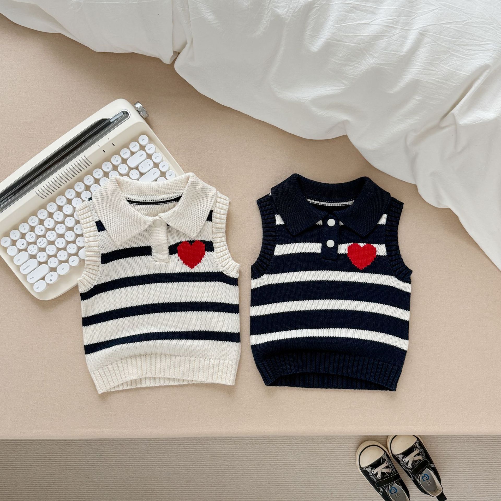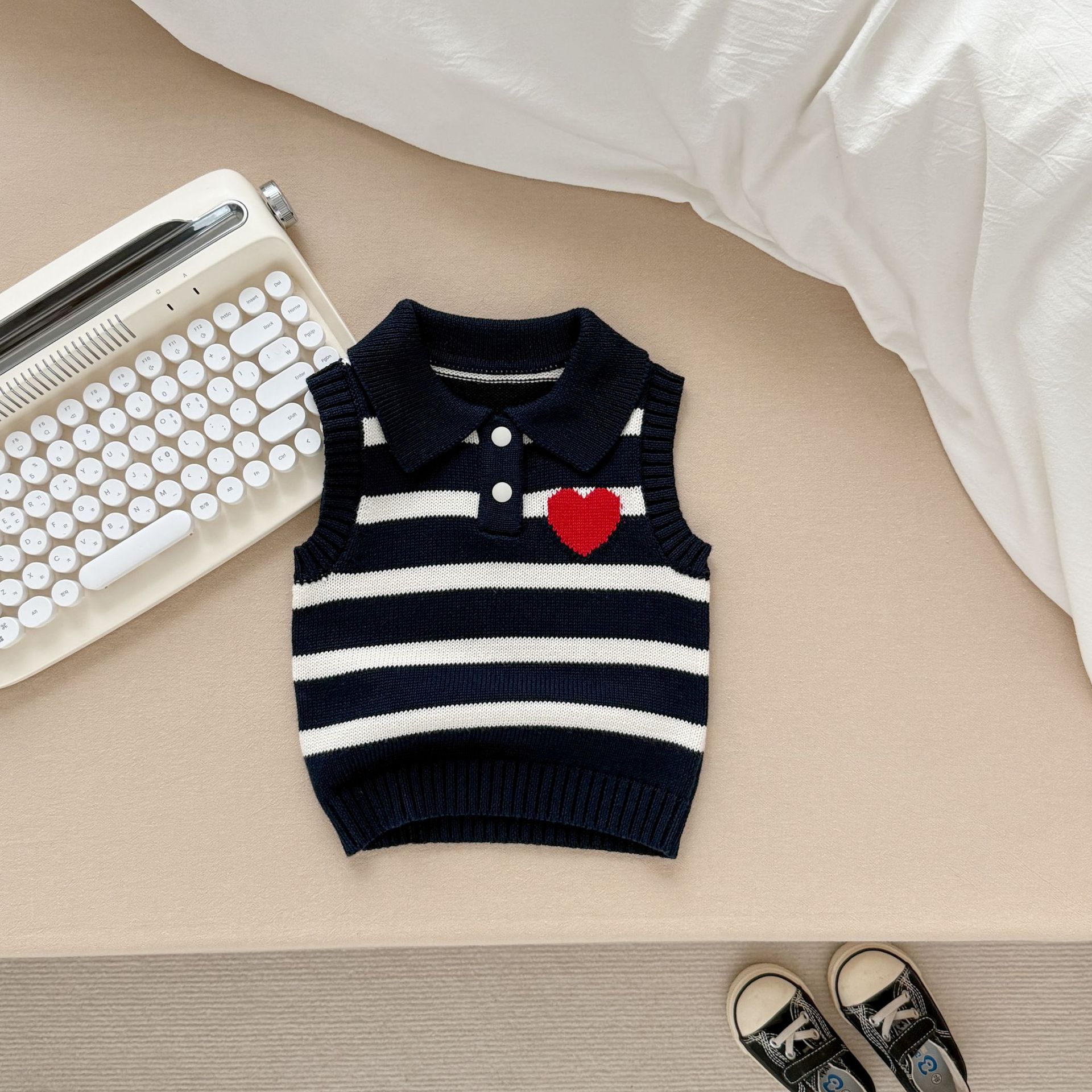 남녀 아기 조끼 봄 가을 작은 하트 폴로 칼라 니트 스트라이프 외투 조끼 스웨터