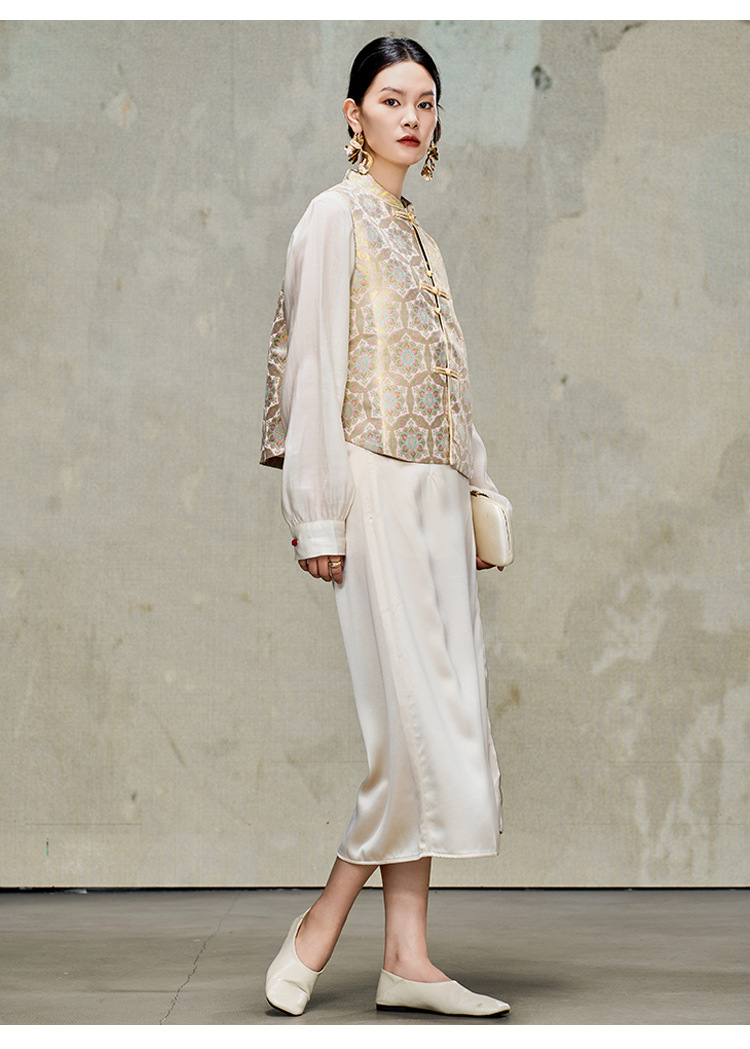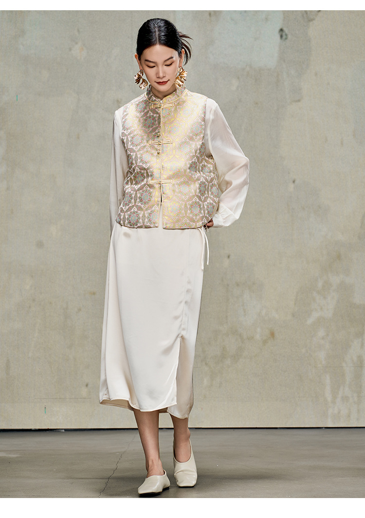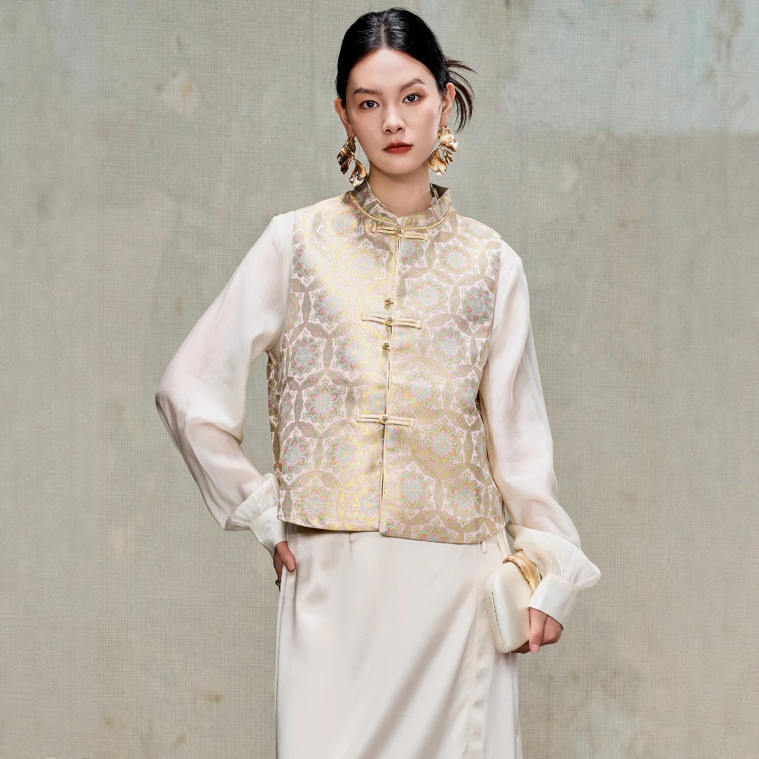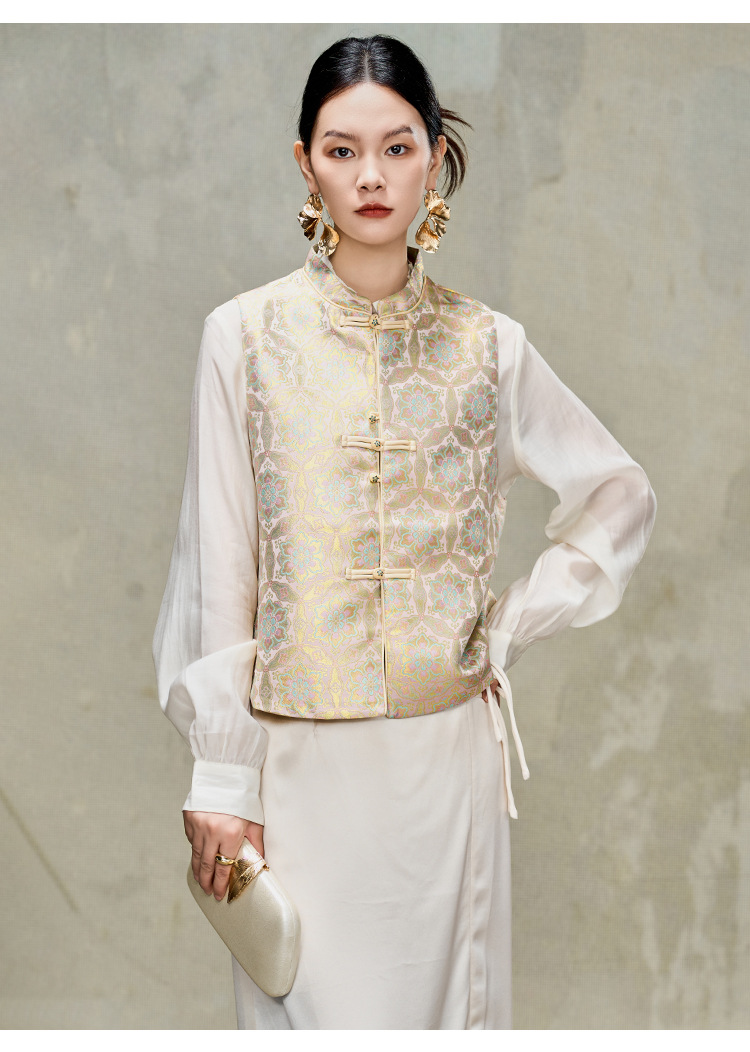 여성을위한 중국 스타일 실크 골드 조끼 2025 새로운 중국 스타일 뽕나무 실크 자카드 Hanfu Song Brocade 탑 양복 조끼