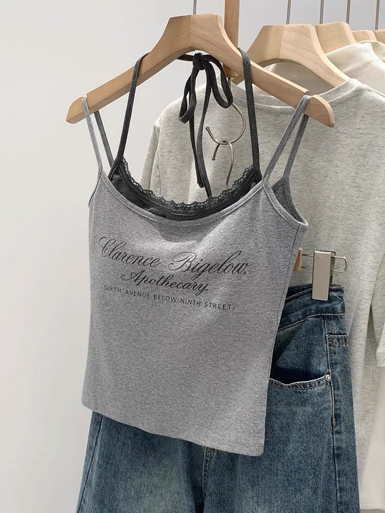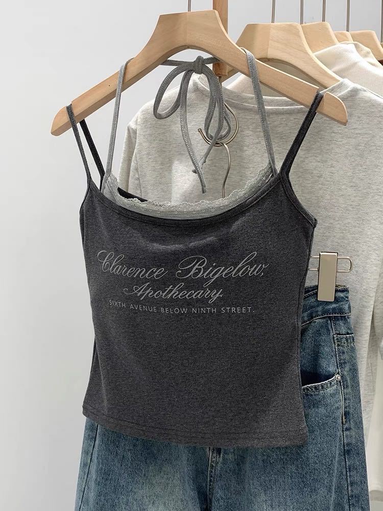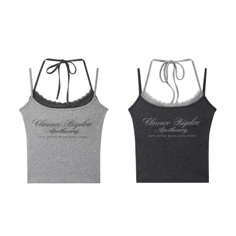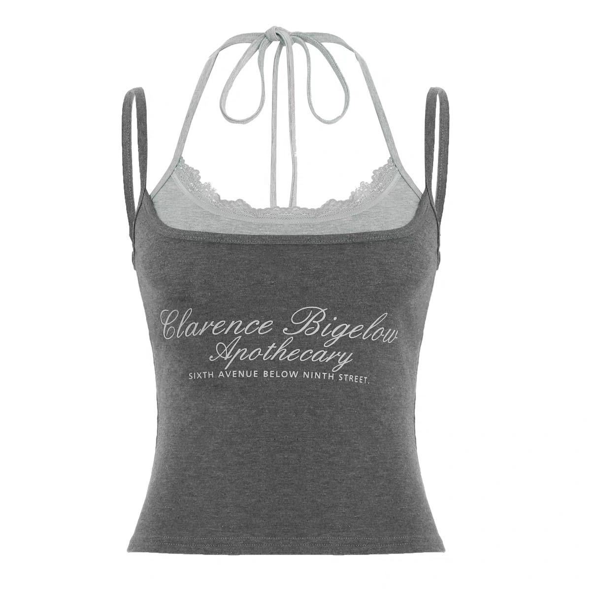 2025 새로운 문자 인쇄 대비 색상 레이스 업 홀터넥 캐미솔 여름 복고풍 디자인 가짜 투피스 탑