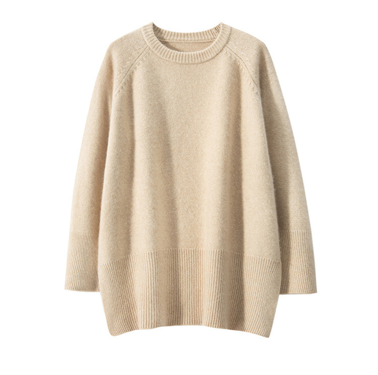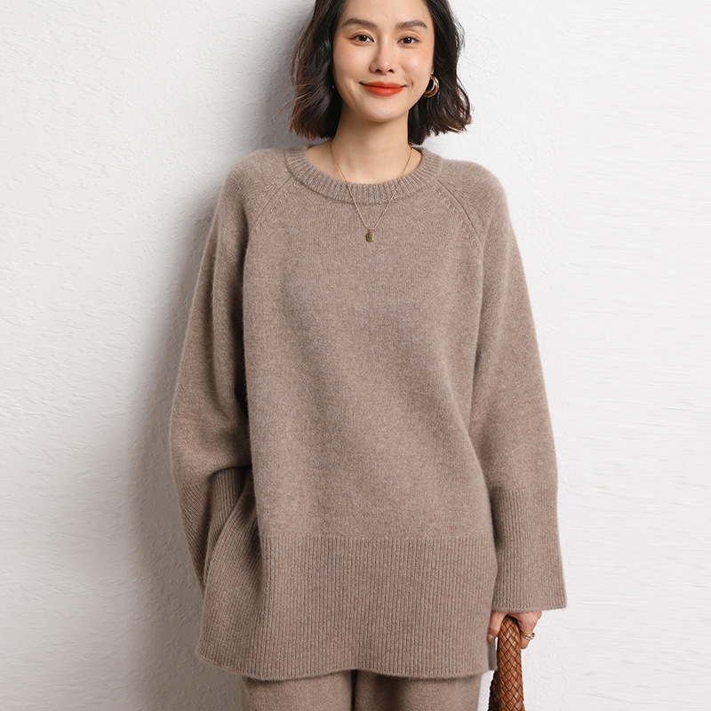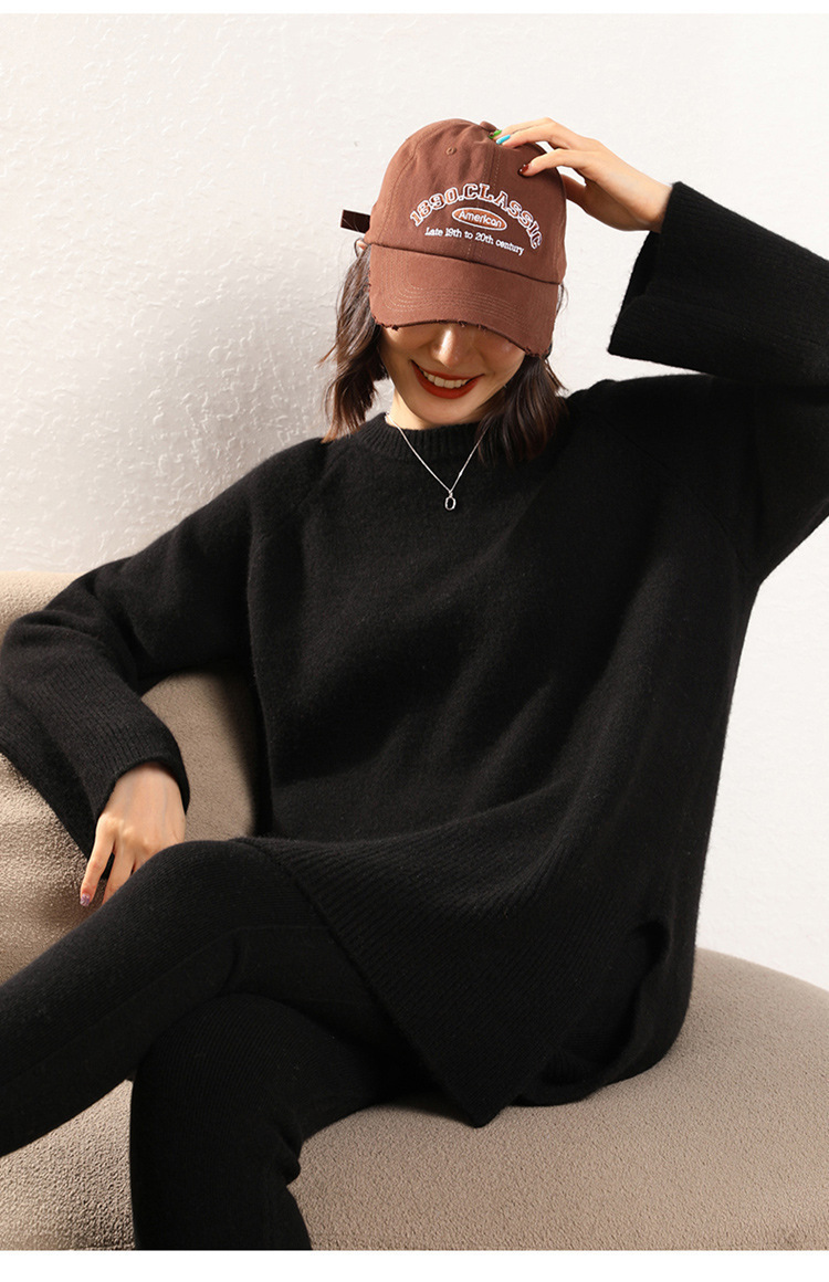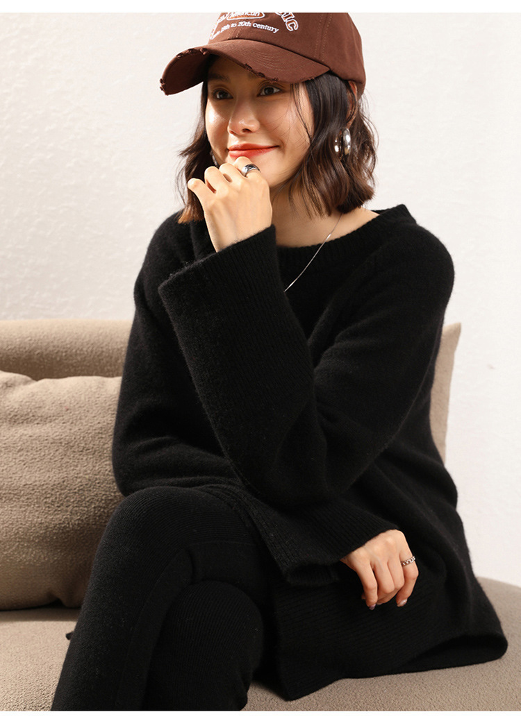여성을위한 크로스 보더 게으른 스타일 라운드 넥 느슨한 대형 스웨터 2025 가을, 겨울 여성을위한 새로운 캐주얼 밑단 슬릿 스웨터스토어 가기