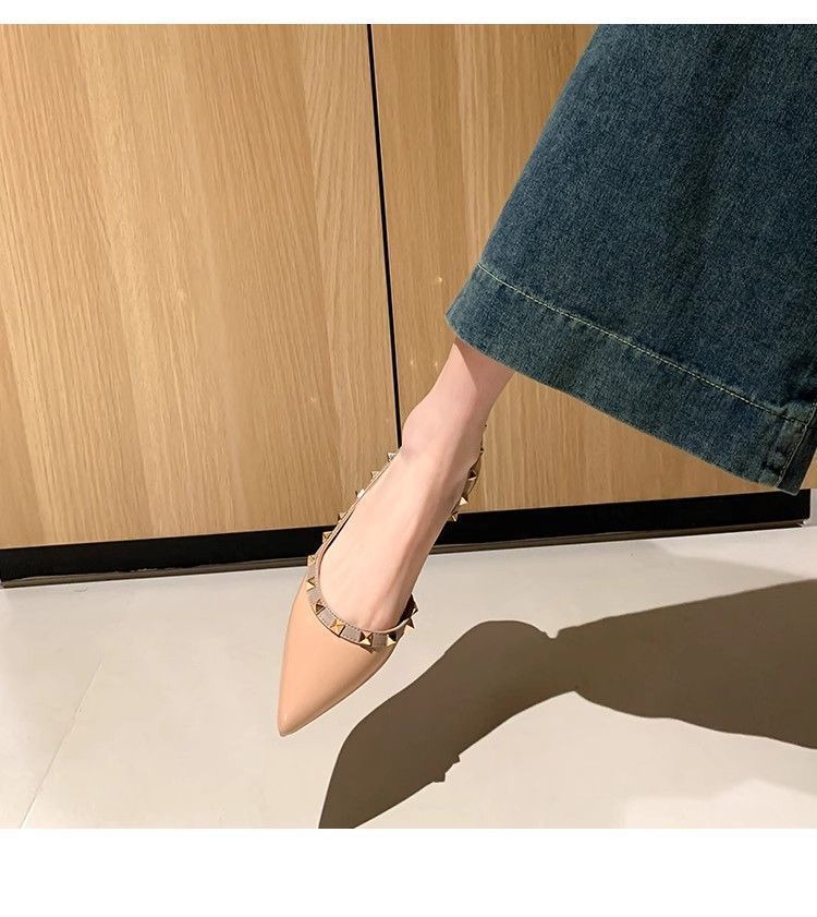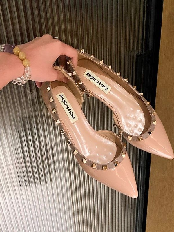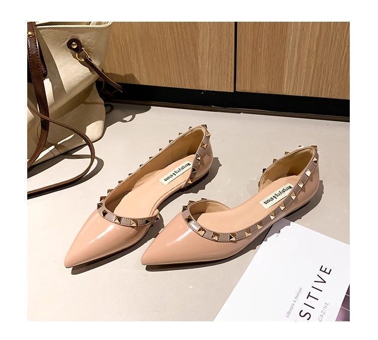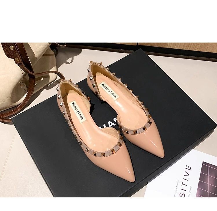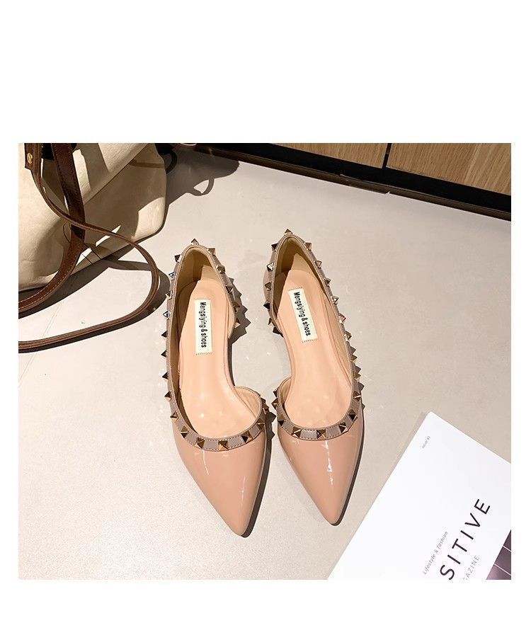 프렌치 리벳 포인티드 토 플랫 슈즈 2025 봄 여름 신상품 여성용 에나멜 소프트 솔 펌프스 통근 슈즈스토어 가기