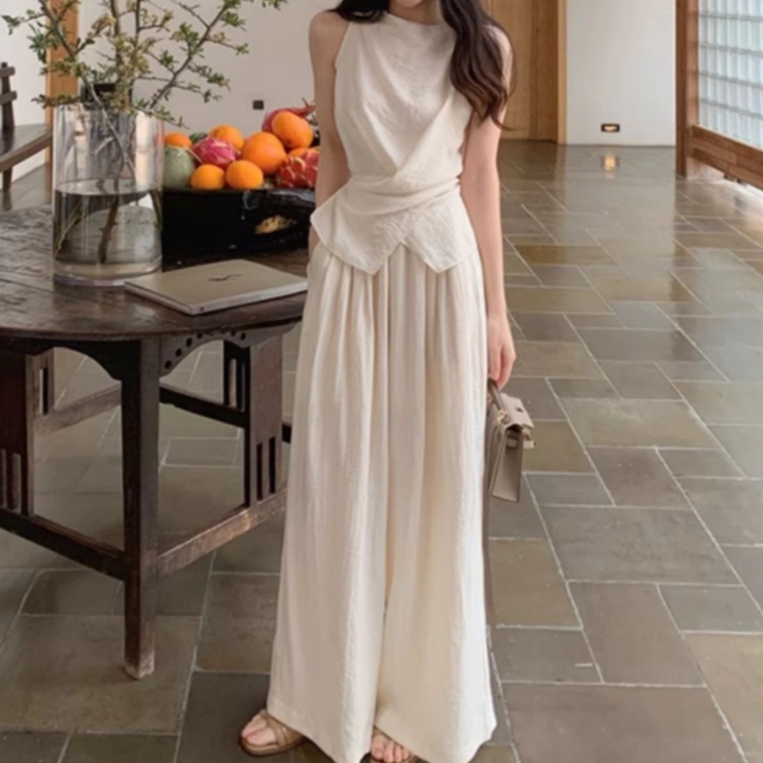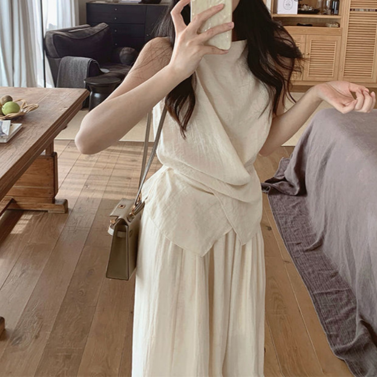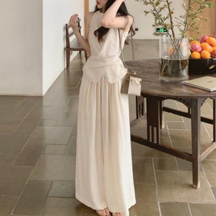 여성을위한 프랑스 스타일 민소매 조끼 허리 스트랩 탑 여름 인기 새로운 탄성 허리 루즈 캐주얼 바지 스커트 정장