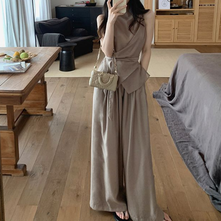 여성을위한 프랑스 스타일 민소매 조끼 허리 스트랩 탑 여름 인기 새로운 탄성 허리 루즈 캐주얼 바지 스커트 정장스토어 가기