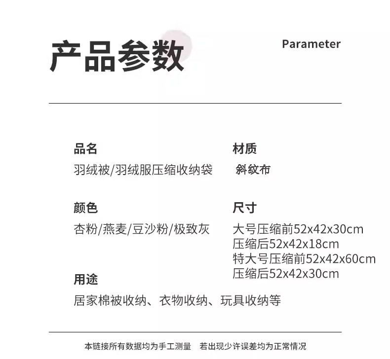 • 오트밀 M&Medium [52*42*30cm] 침대 1개와 이불 3kg개를 수용할 수 있으며, 다운을 보호하기 위해 압축하지 않고 압축합니다.