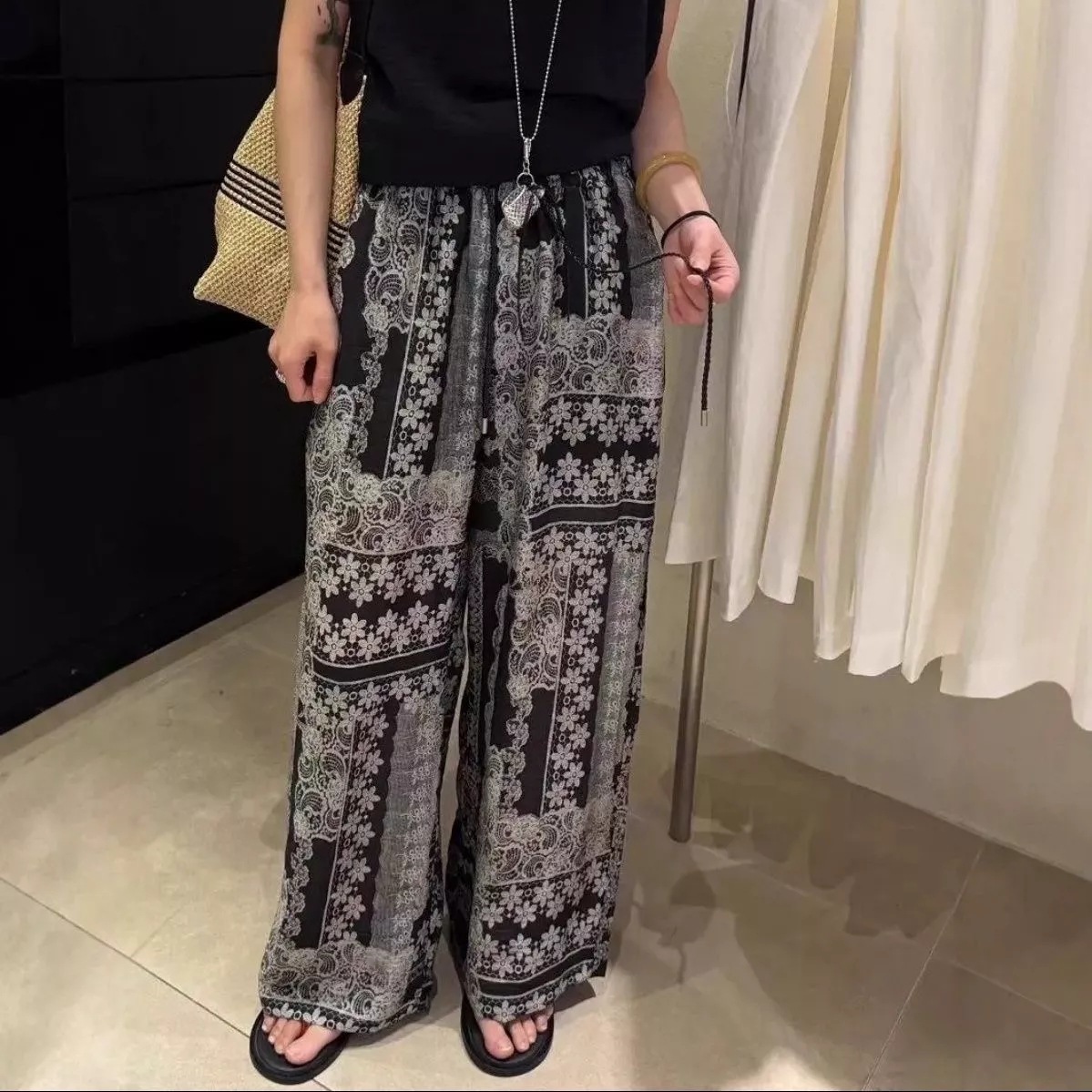 2025 새로운 여름 스타일 느슨한 기질 얼음 실크 스트레이트 바지 캐주얼 복고풍 인쇄 Drawstring 탄성 허리 와이드 레그 바지 여성을위한스토어 가기