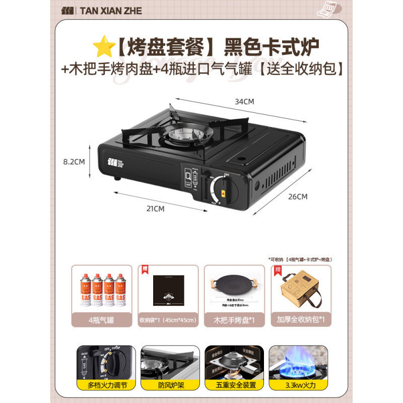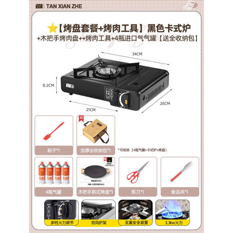 • ️[베이킹 팬 세트 + 바베큐 도구] 블랙 카세트 스토브 + 가스 탱크 4병 + 나무 손잡이
