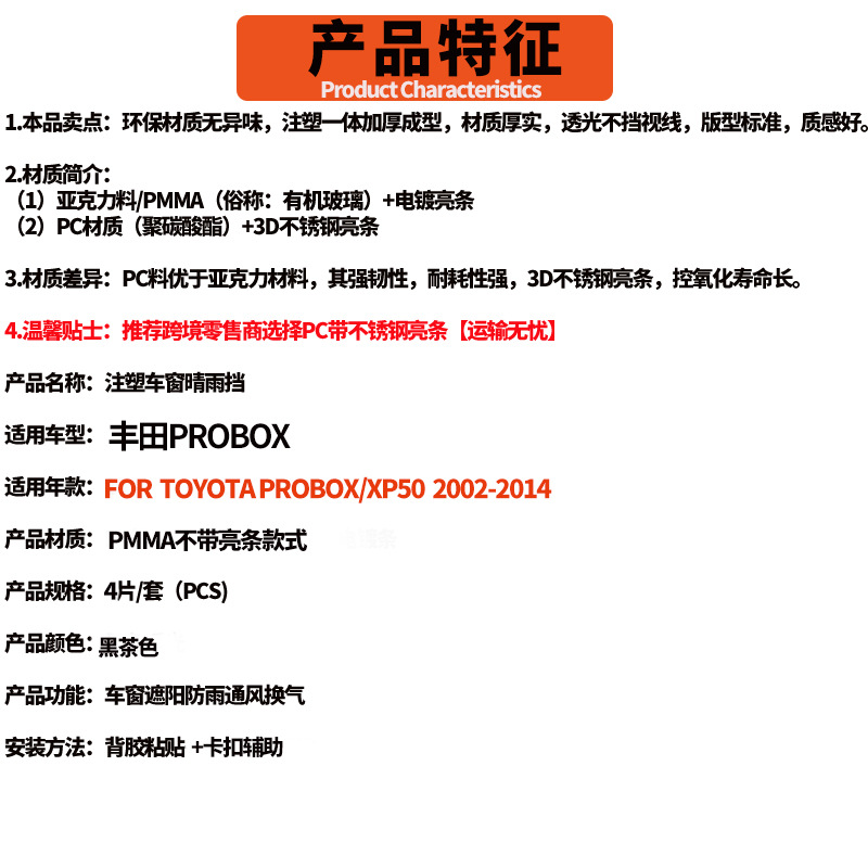 • Toyota PROBOX XP50 2002-2014 PS 사출 성형 위치 정확도 두께 3.0 레인 쉴드 4개
