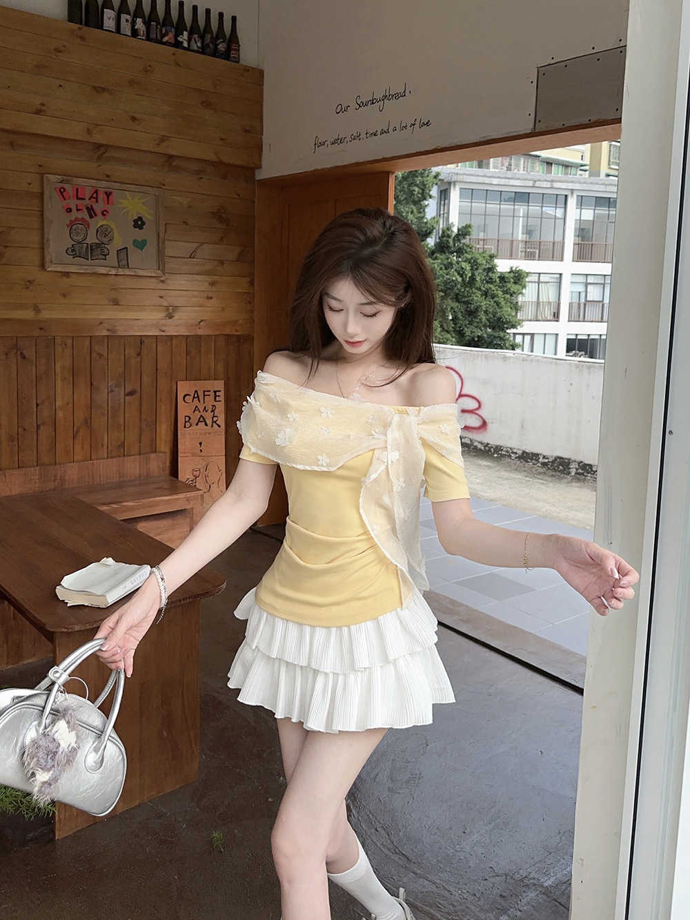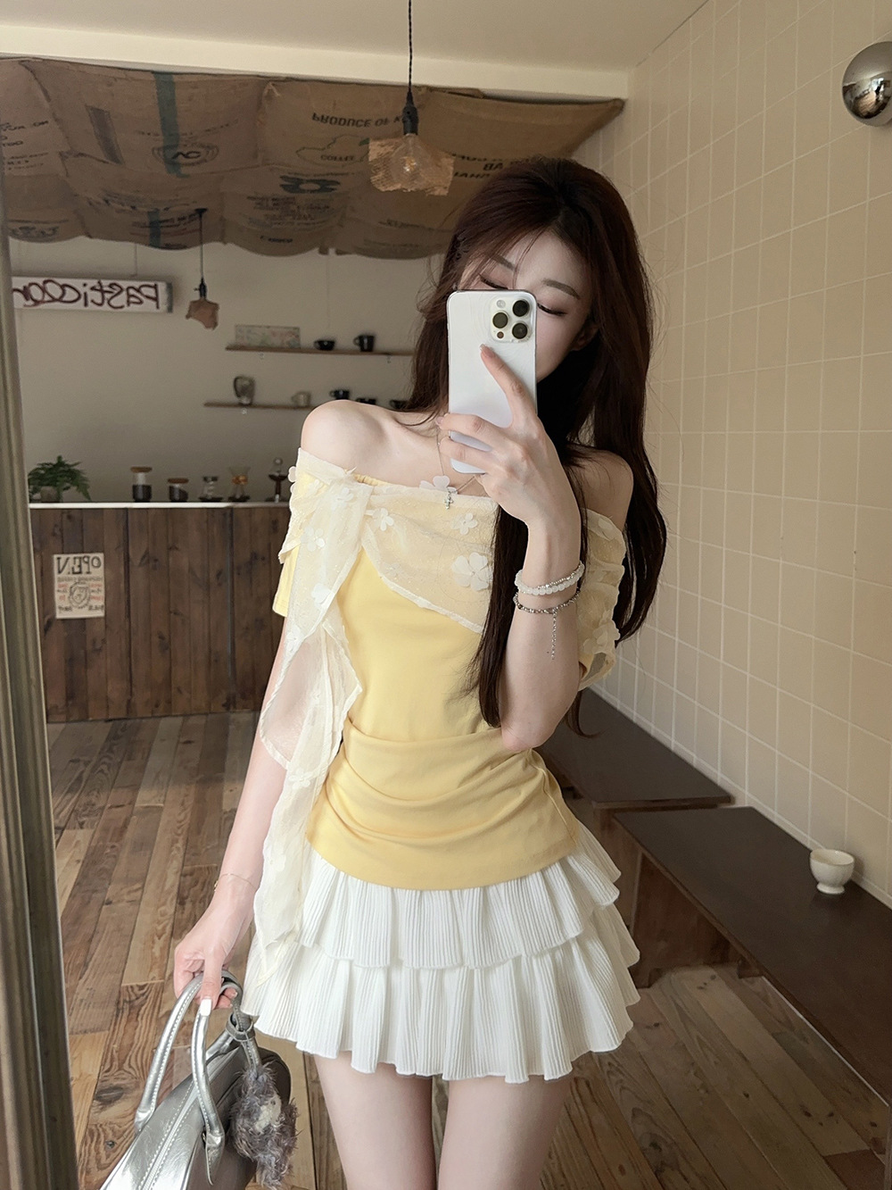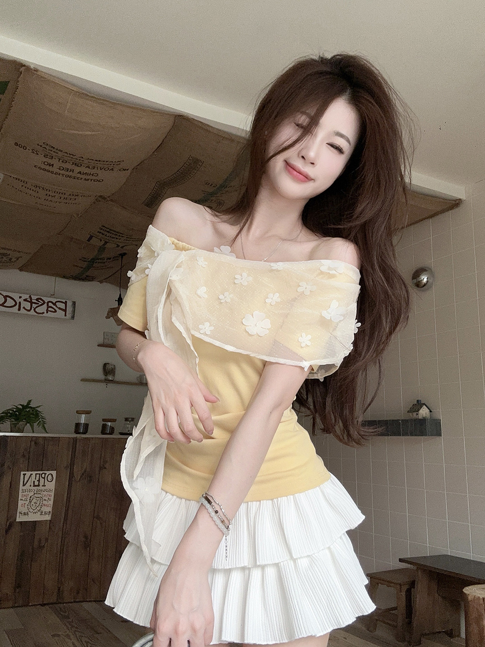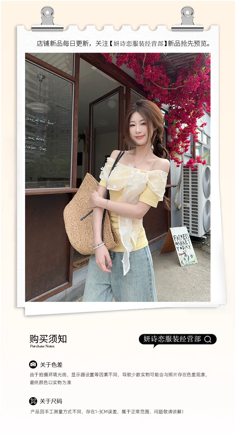 여성을위한 프렌치 레이스 스플 라이스 원 숄더 반팔 티셔츠 2025 여름 신작 슬림 피트 퓨어 디자이어 쇼트 탑스토어 가기