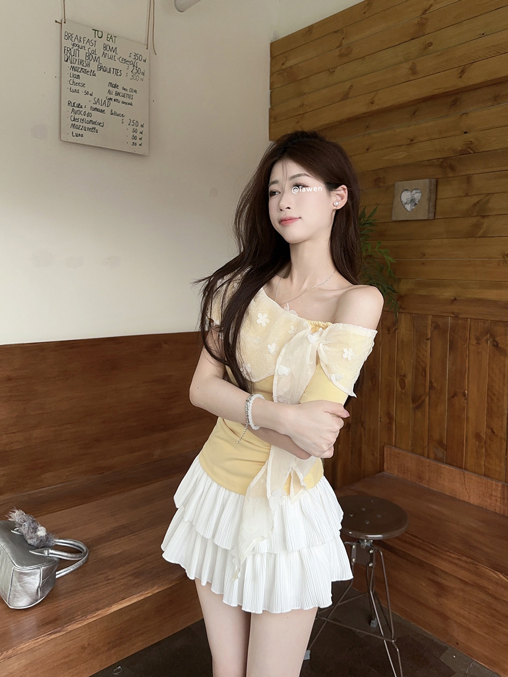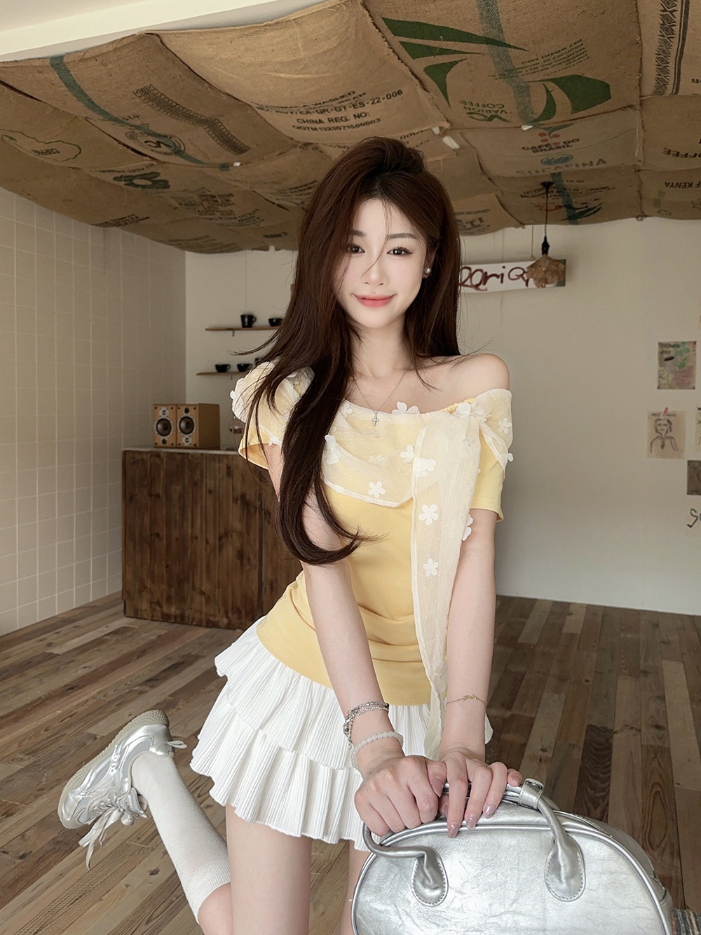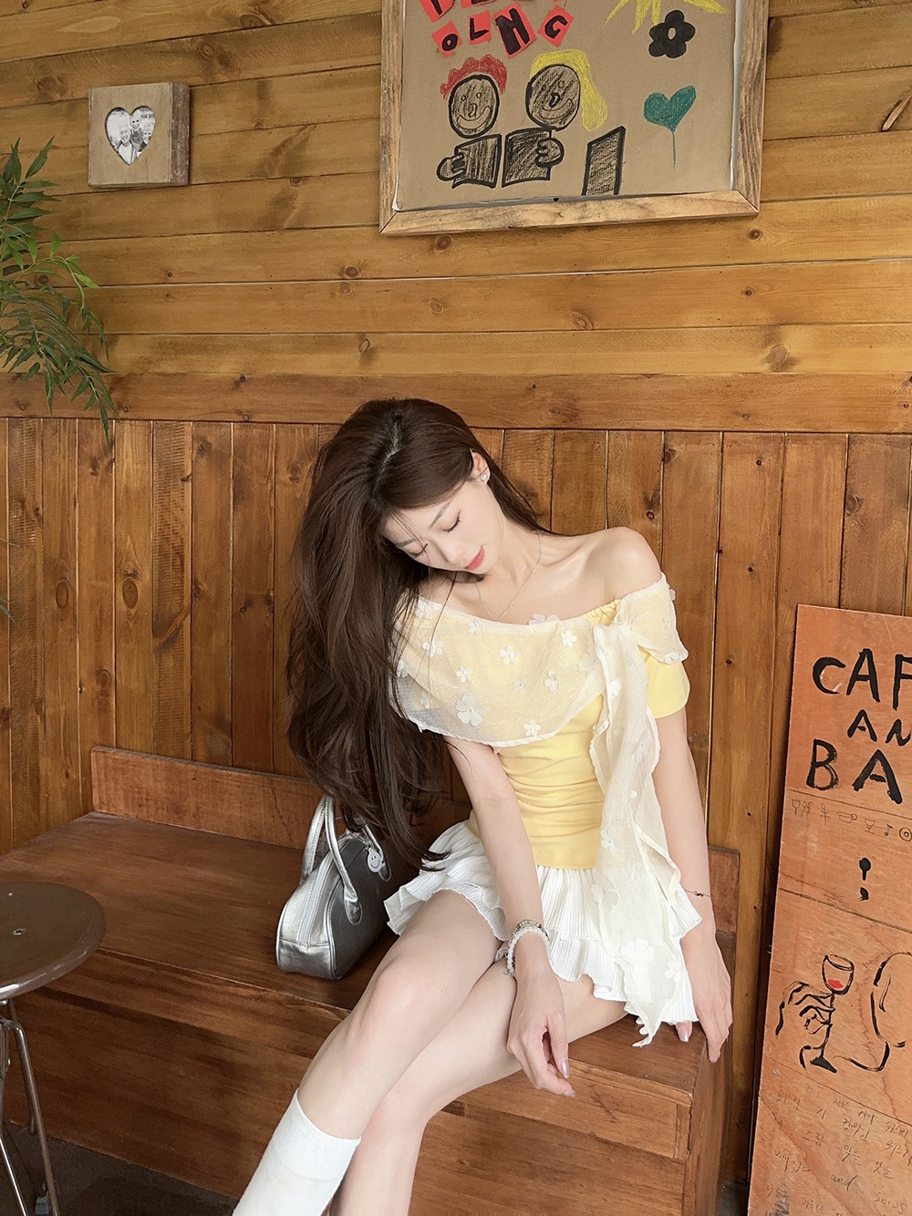 여성을위한 프렌치 레이스 스플 라이스 원 숄더 반팔 티셔츠 2025 여름 신작 슬림 피트 퓨어 디자이어 쇼트 탑스토어 가기