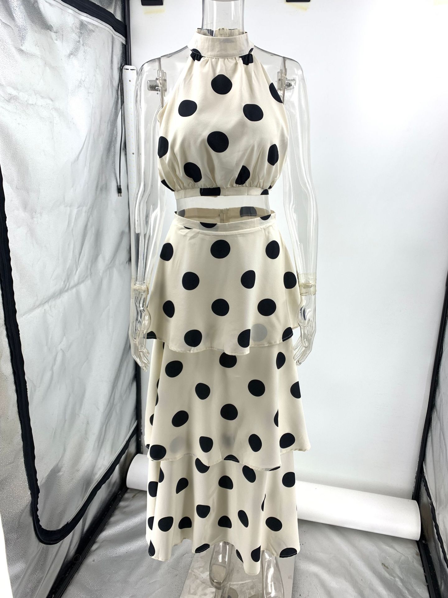 유럽과 미국의 국경 간 대외 무역 독립 스테이션 2025 새로운 폴카 도트 프린트 홀터넥 민소매 탑 케이크 스커트 슈트스토어 가기