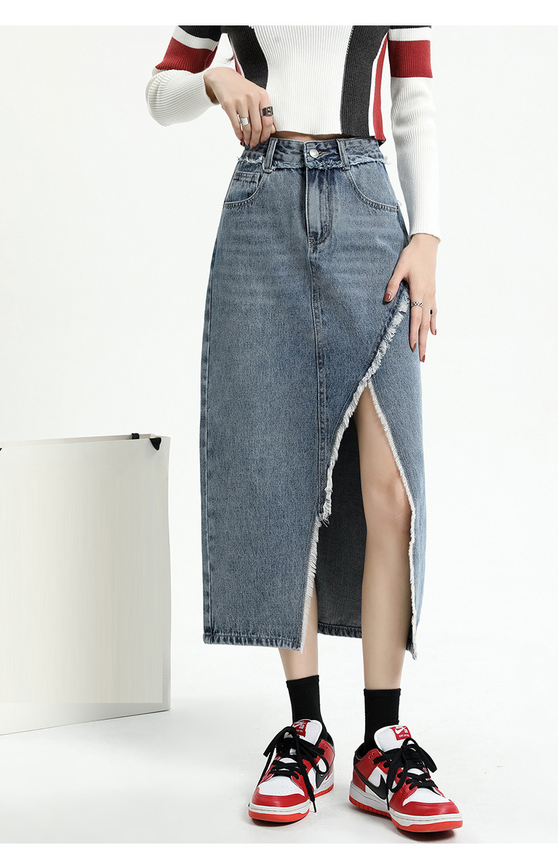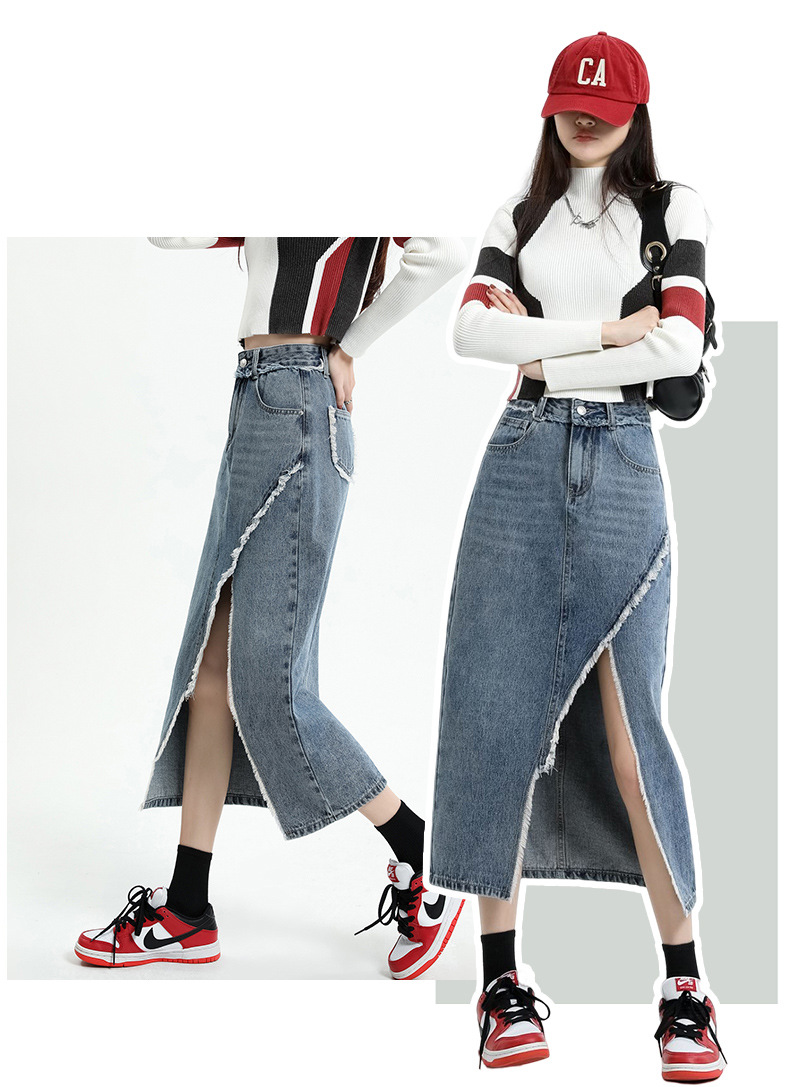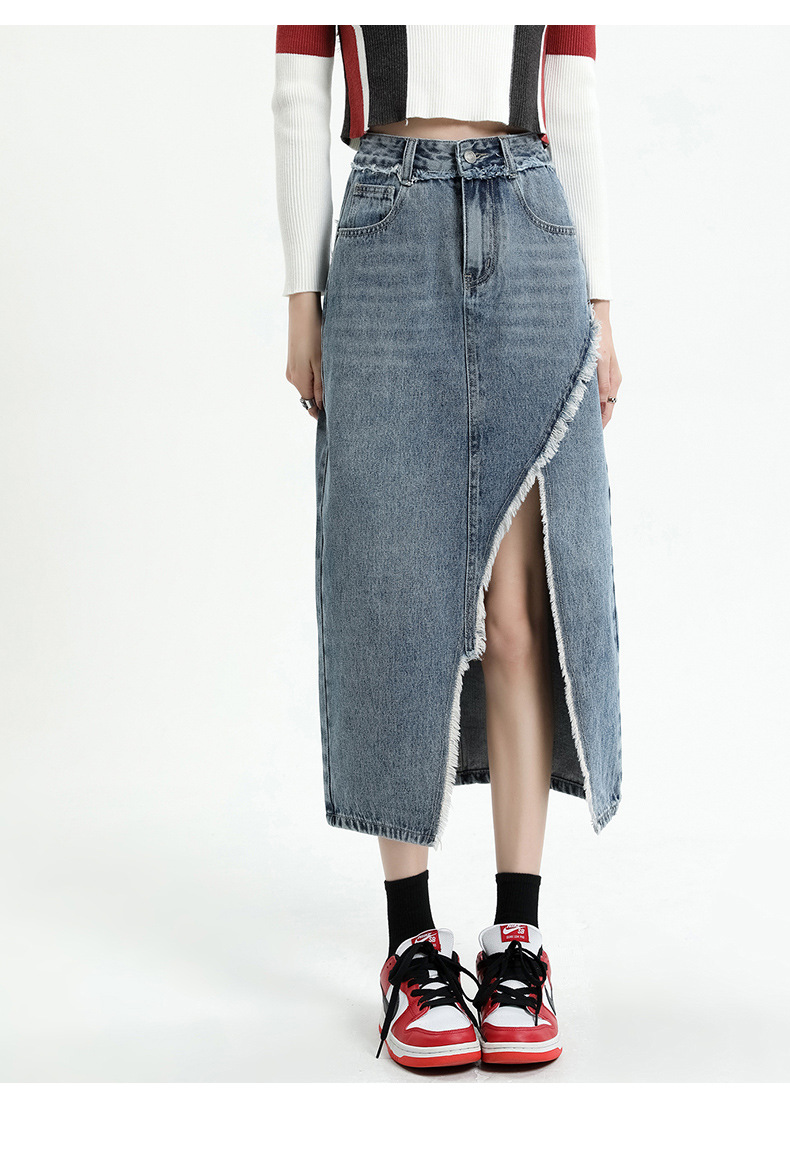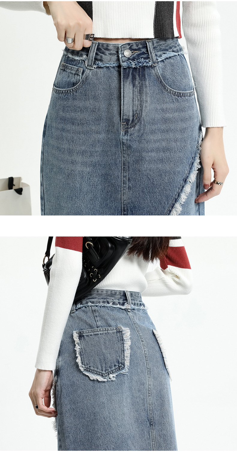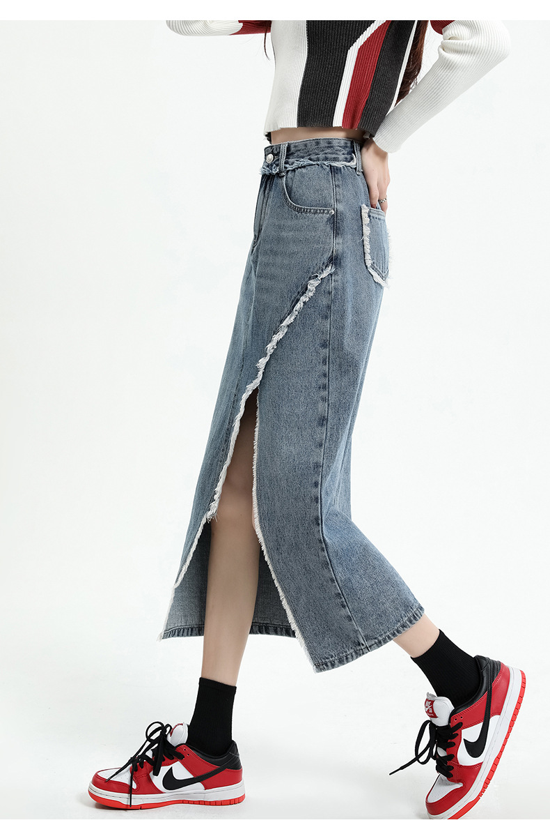 봄 여름 신상 하이웨이스트 슬림 불규칙 슬릿 데님 스커트 레트로 로우 엣지 디자인 A라인 미드기장…스토어 가기