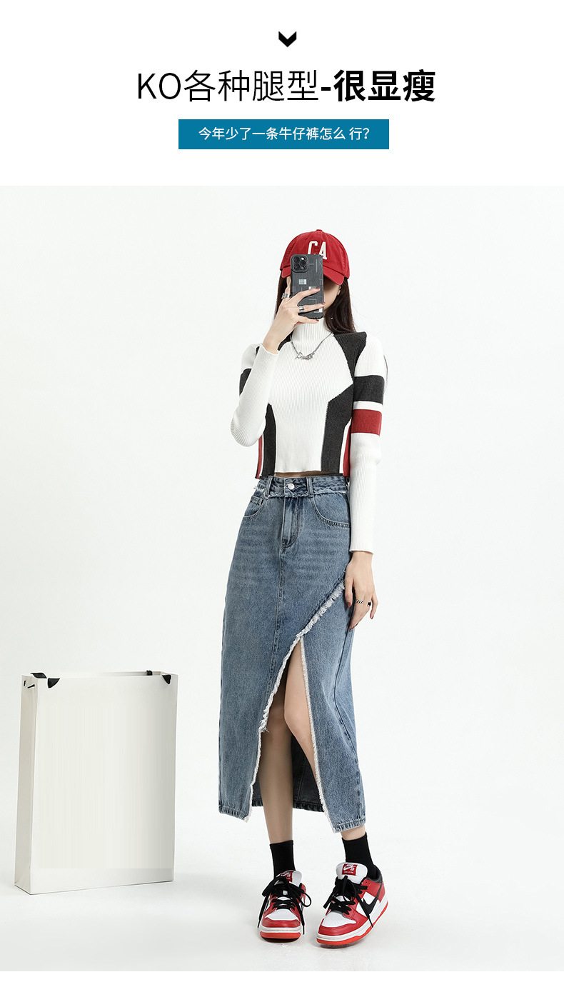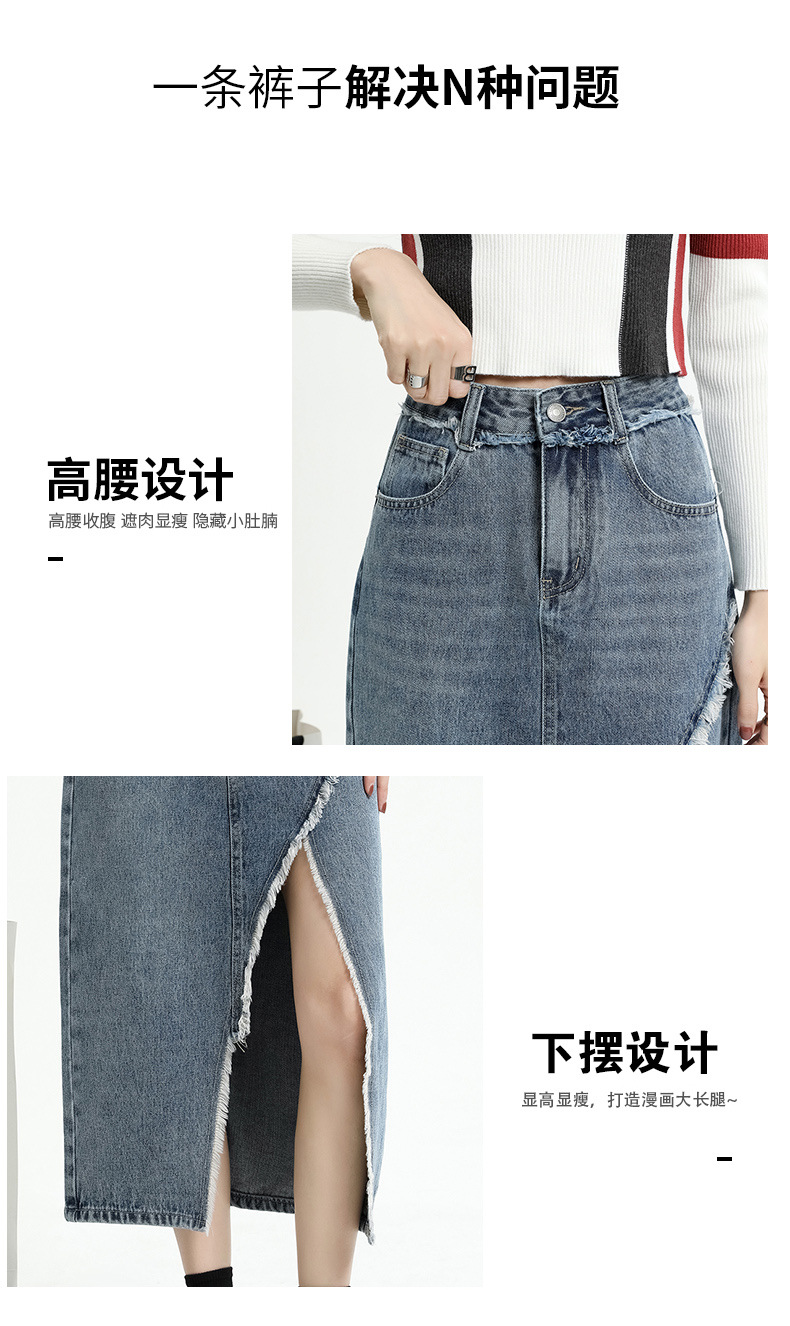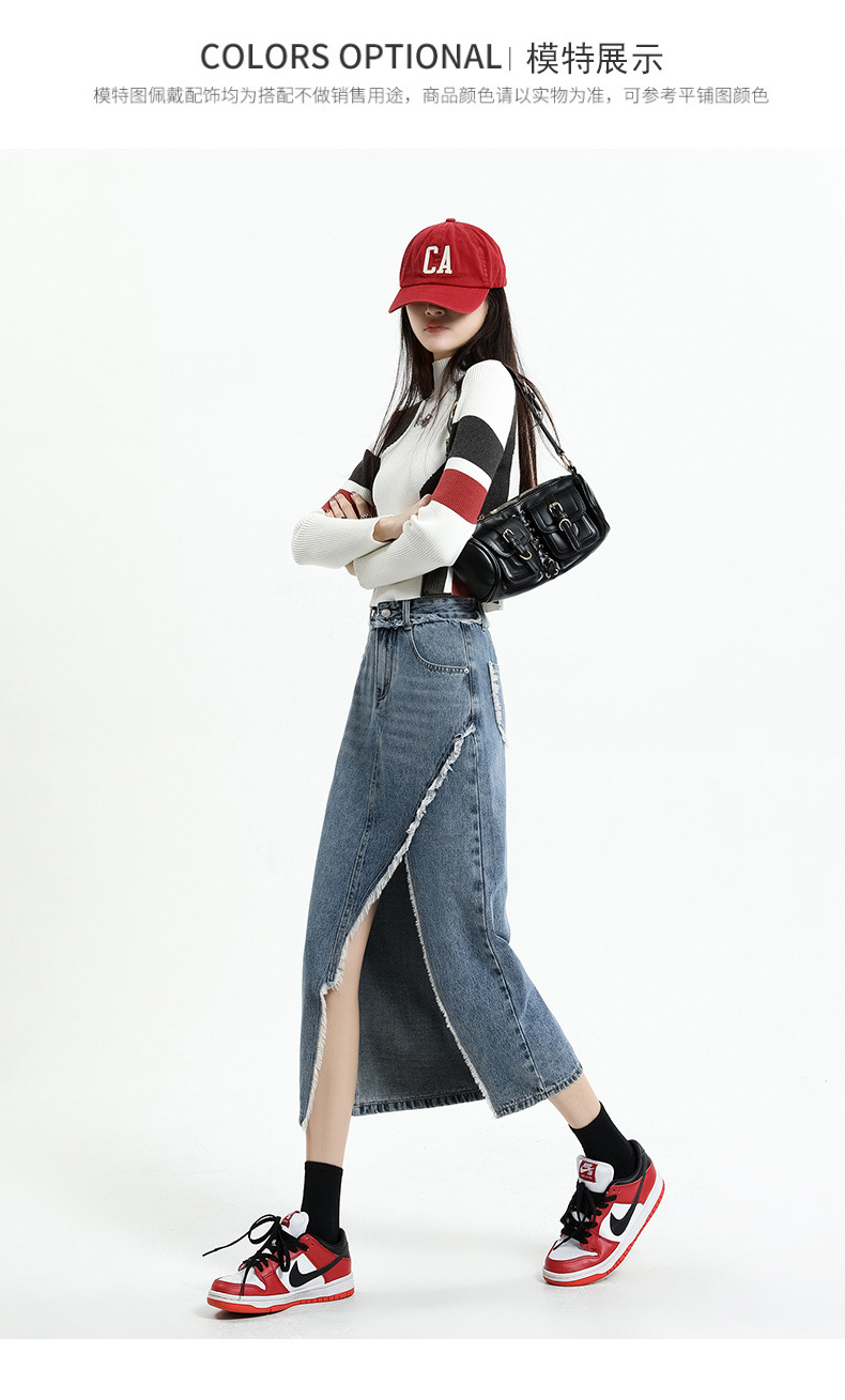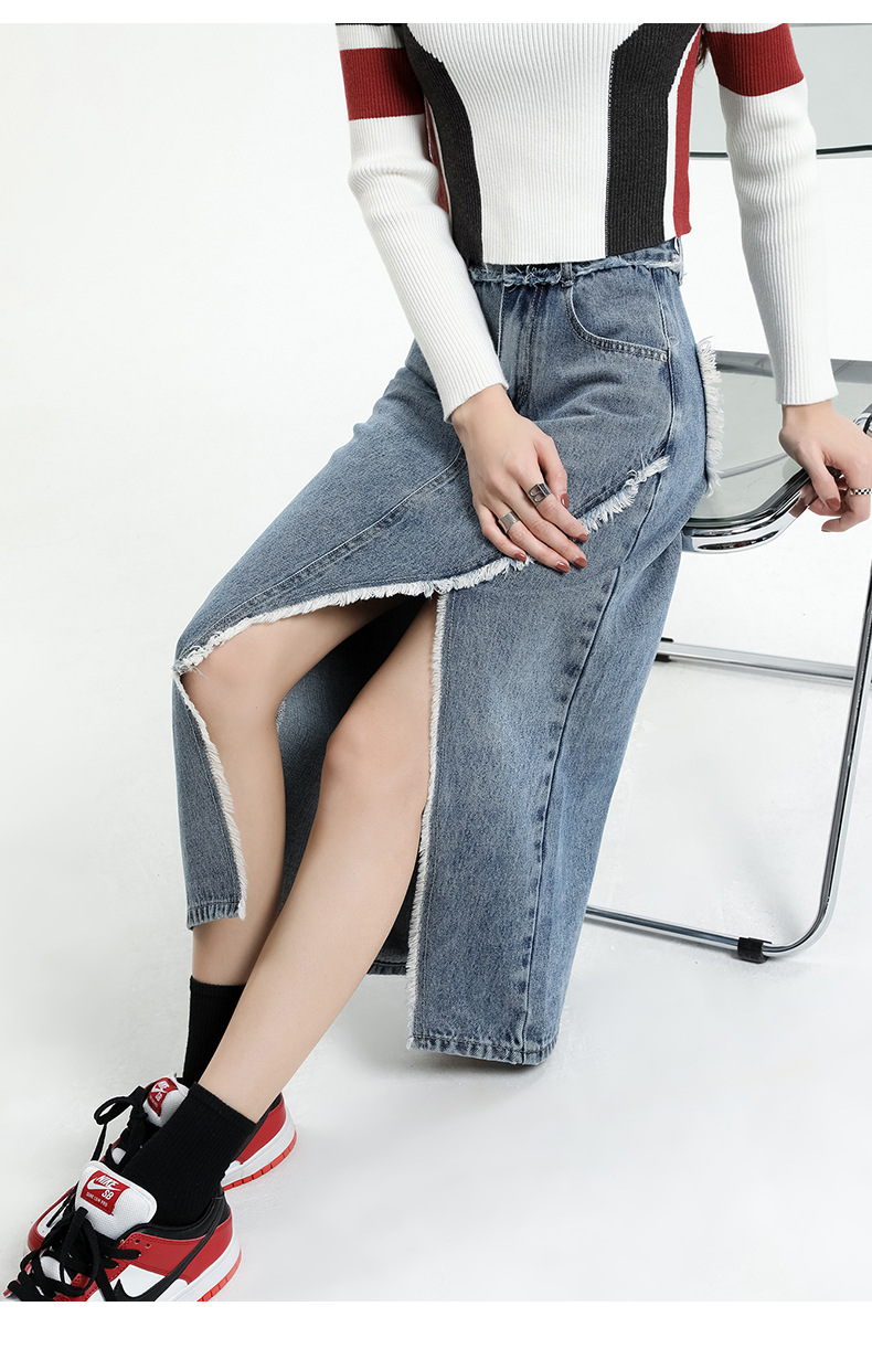 봄 여름 신상 하이웨이스트 슬림 불규칙 슬릿 데님 스커트 레트로 로우 엣지 디자인 A라인 미드기장…스토어 가기