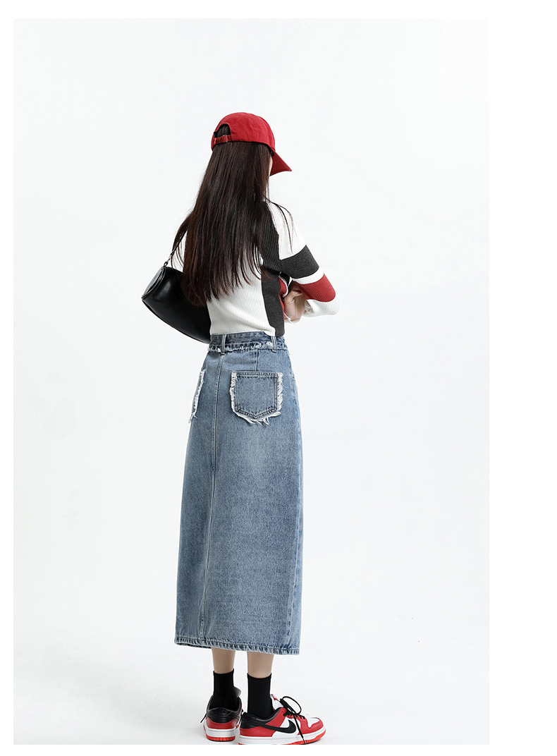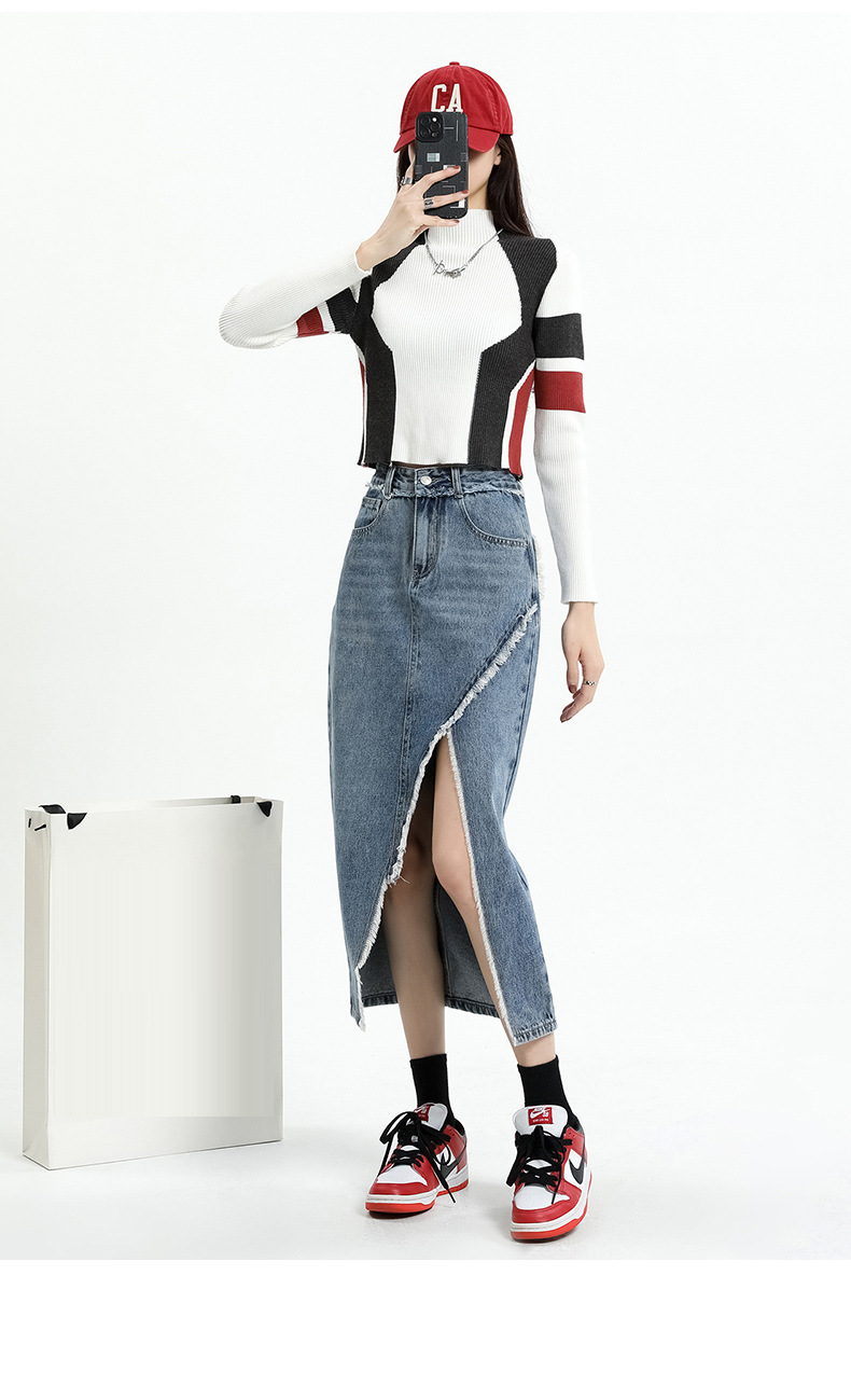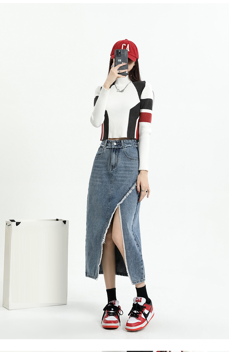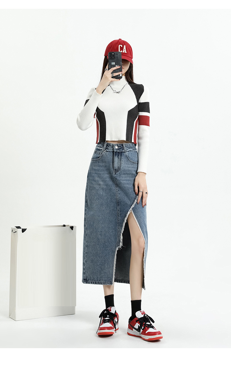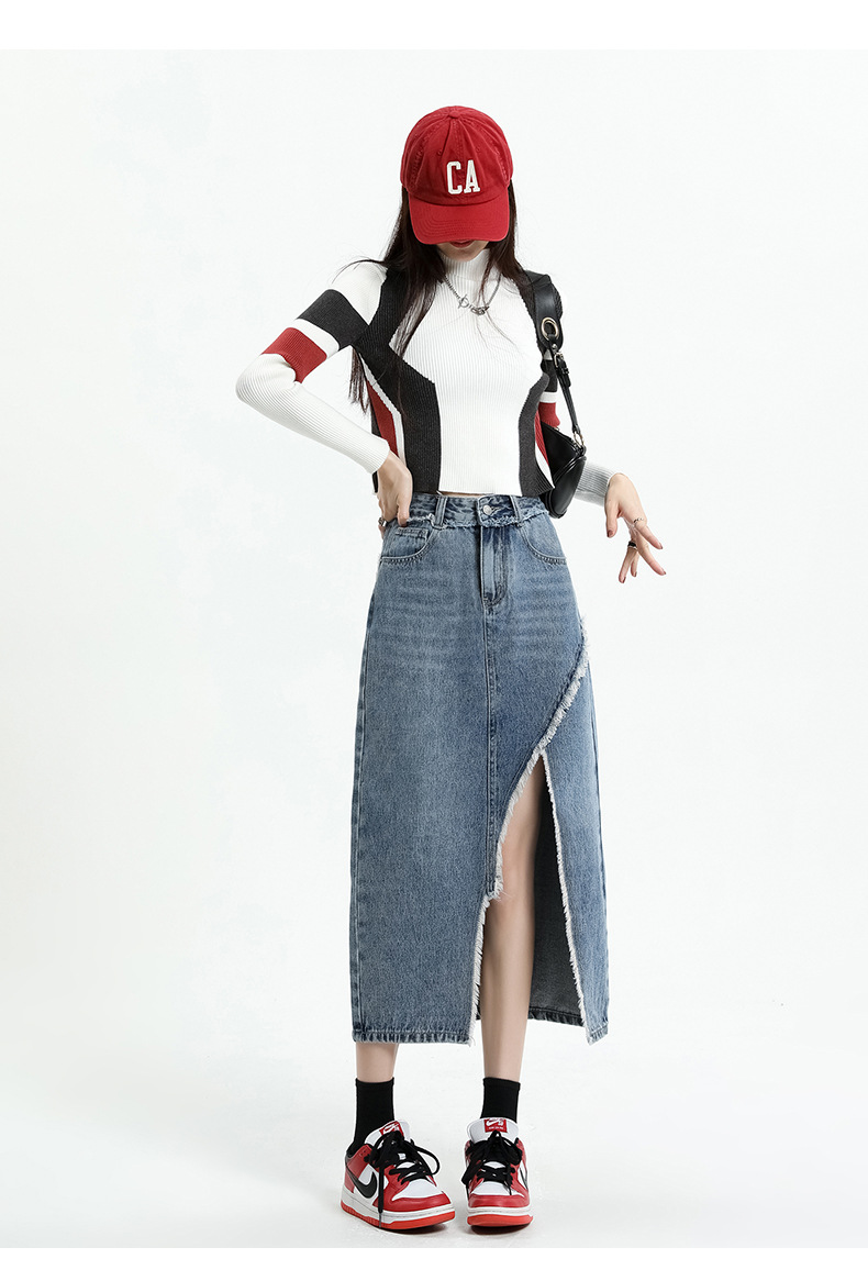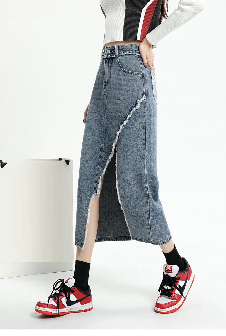 봄 여름 신상 하이웨이스트 슬림 불규칙 슬릿 데님 스커트 레트로 로우 엣지 디자인 A라인 미드기장…
