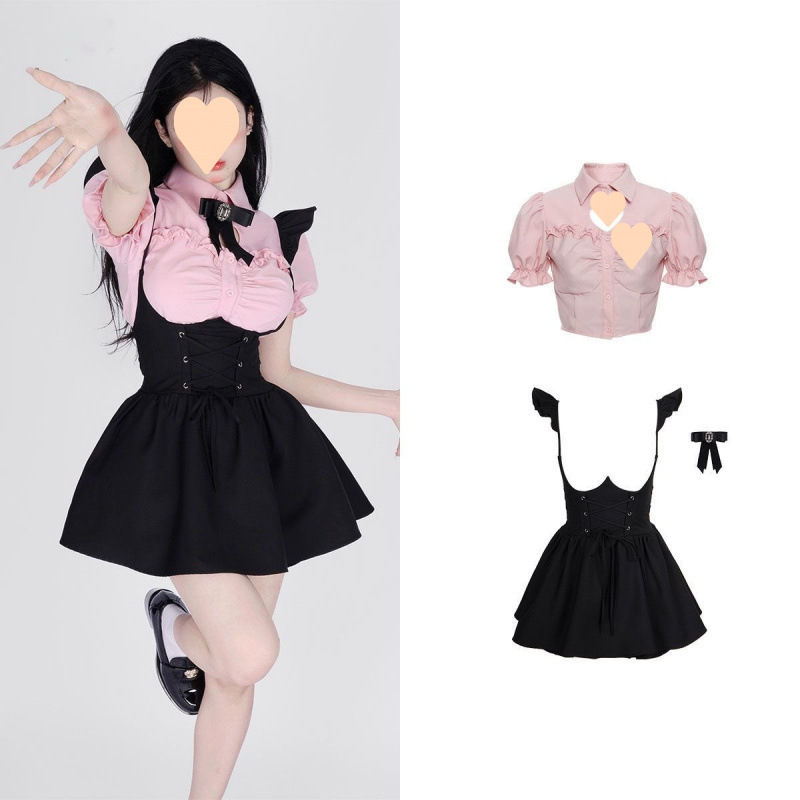 2025 새로운 여름 스타일 귀여운 소녀 핑크 플라잉 슬리브 셔츠 스트랩 블랙 서스펜더 스커트 드레스