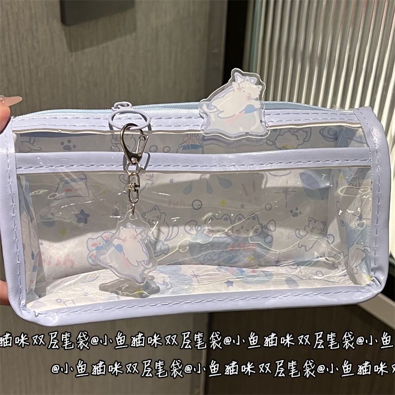 만화 작은 물고기 고양이 더블 레이어 연필 가방 스타일 고가치 소녀 하트 학생 문구 투명 저장 가방 재고 있음