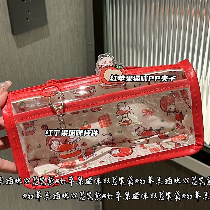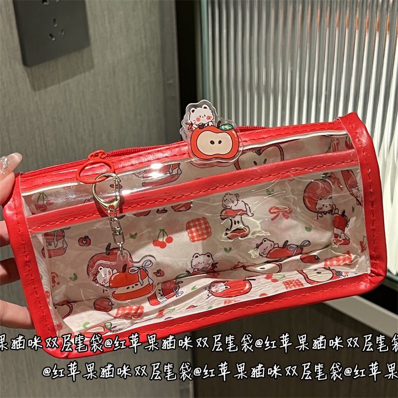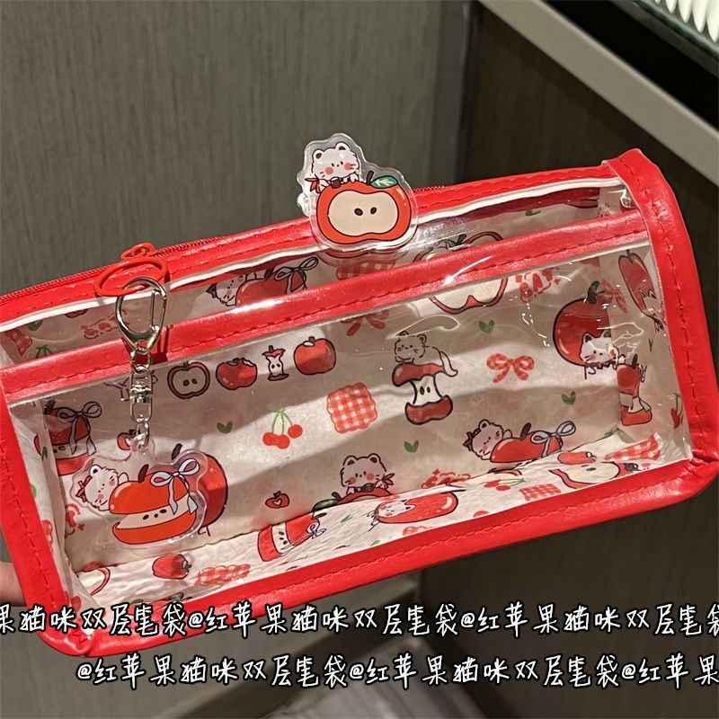 만화 빨간 사과 고양이 더블 레이어 연필 가방 스타일 고가치 소녀 하트 학생 문구 투명 보관 가방스토어 가기