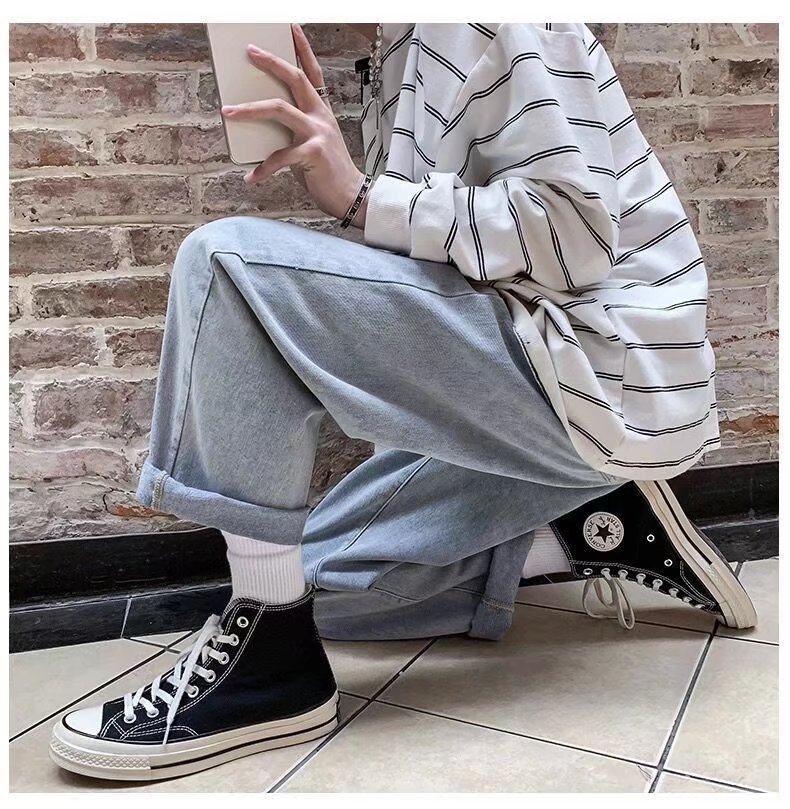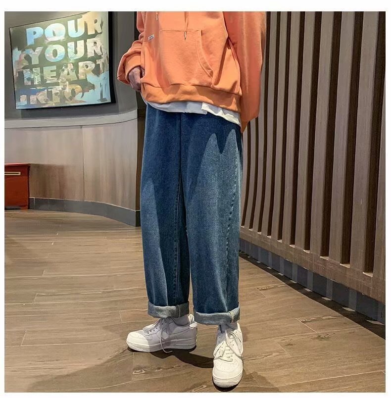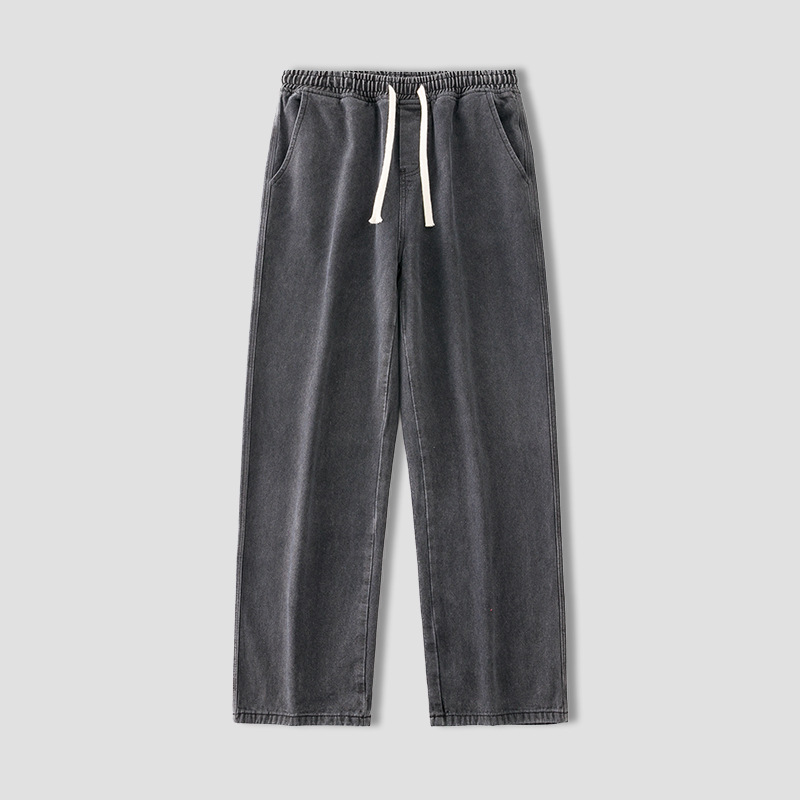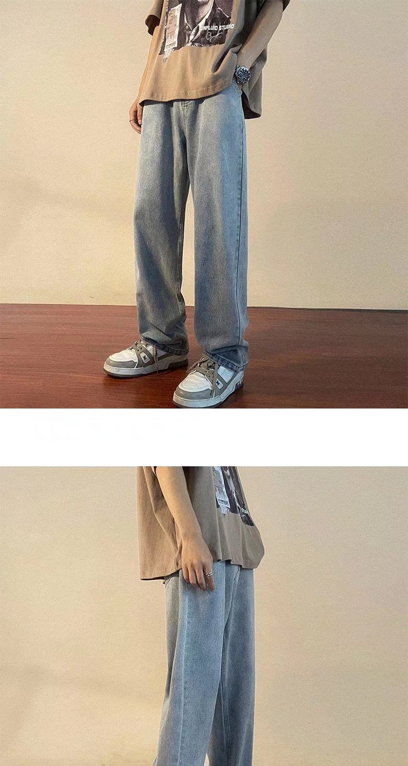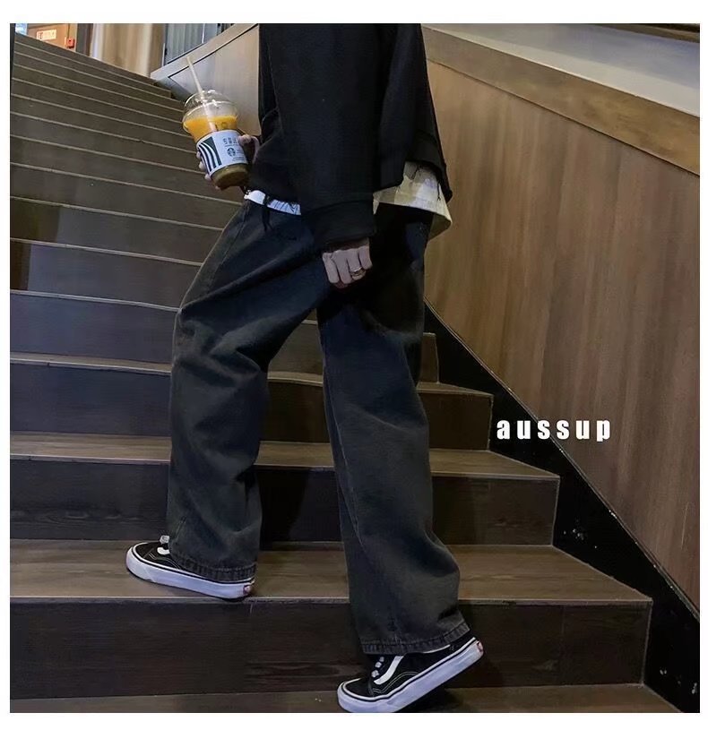 홍콩 스타일 일본 복고풍 드로스트링 청바지 남성용 루즈 스트레이트 레그 와이드 레그 아빠 바지 트렌디 하이 스트리트 롱 팬츠스토어 가기