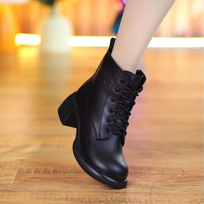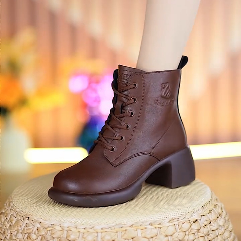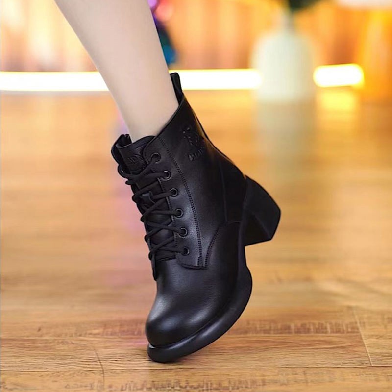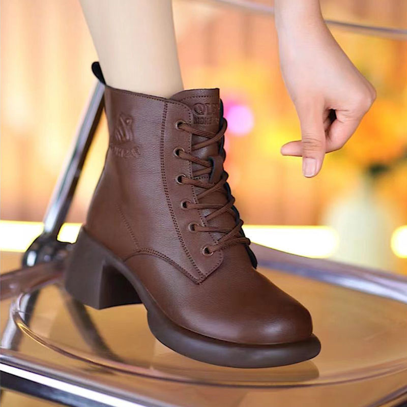2025 새로운 가을 겨울 1층 소가죽 플러스 미드 힐 영국식 소프트 솔 숏부츠 두꺼운 힐 대형 사이드 지퍼 여성용 마틴 부츠