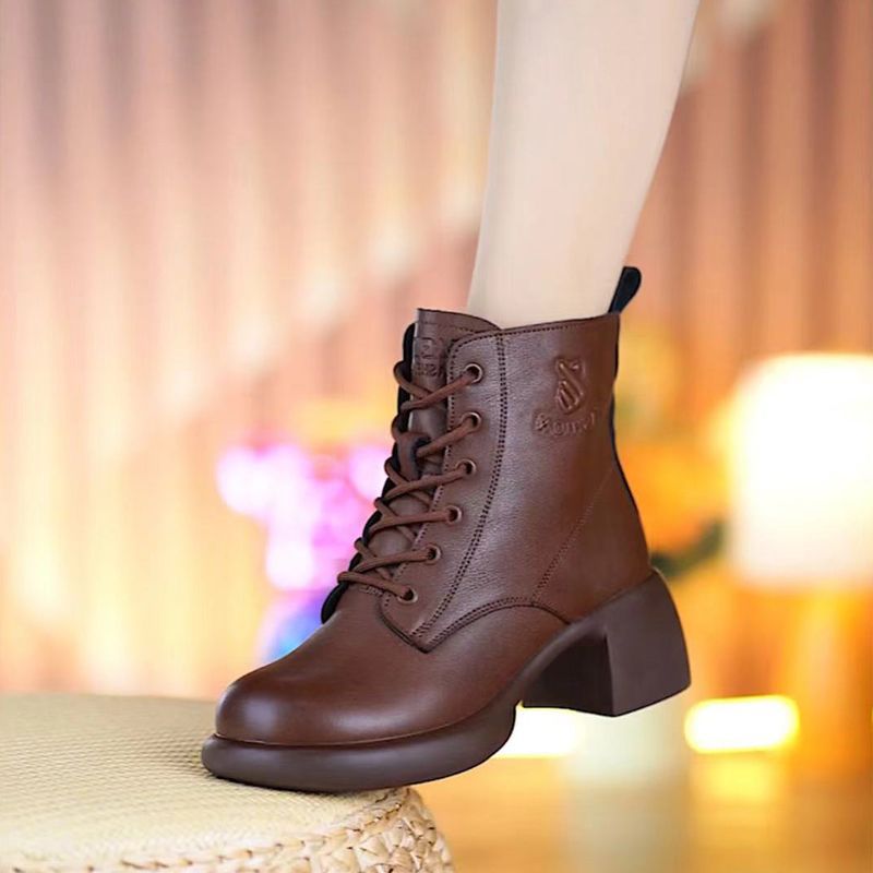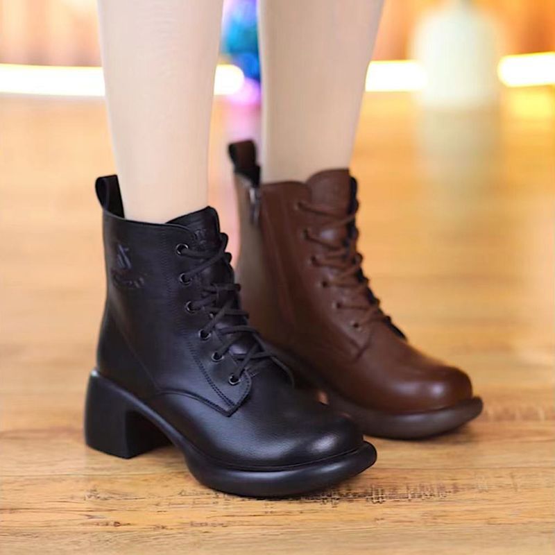 2025 새로운 가을 겨울 1층 소가죽 플러스 미드 힐 영국식 소프트 솔 숏부츠 두꺼운 힐 대형 사이드 지퍼 여성용 마틴 부츠스토어 가기
