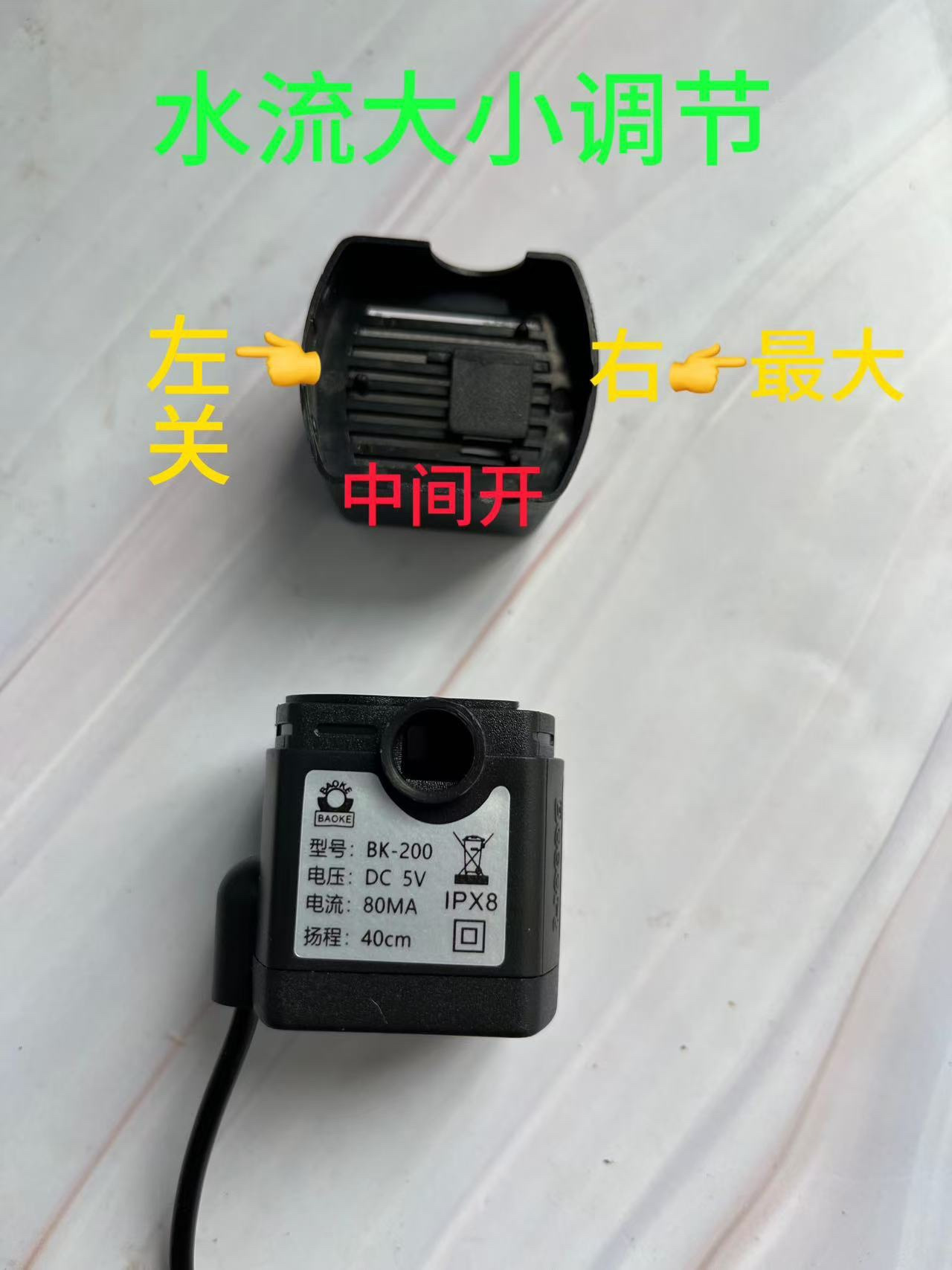 请注意:水泵的注意事项“水泵不要用快充插头 20瓦以下  插头电流太高会导致线发热损坏”