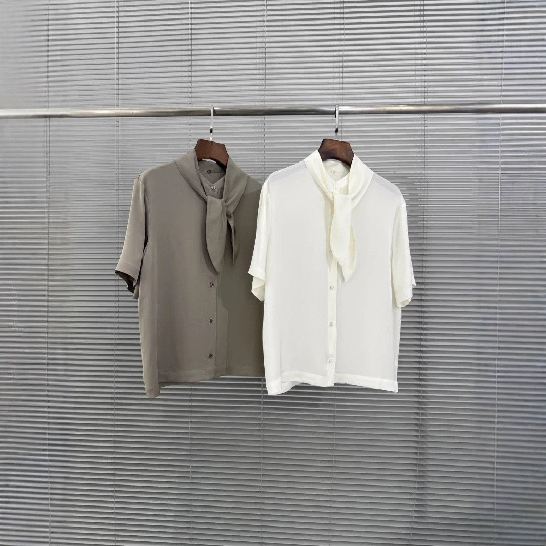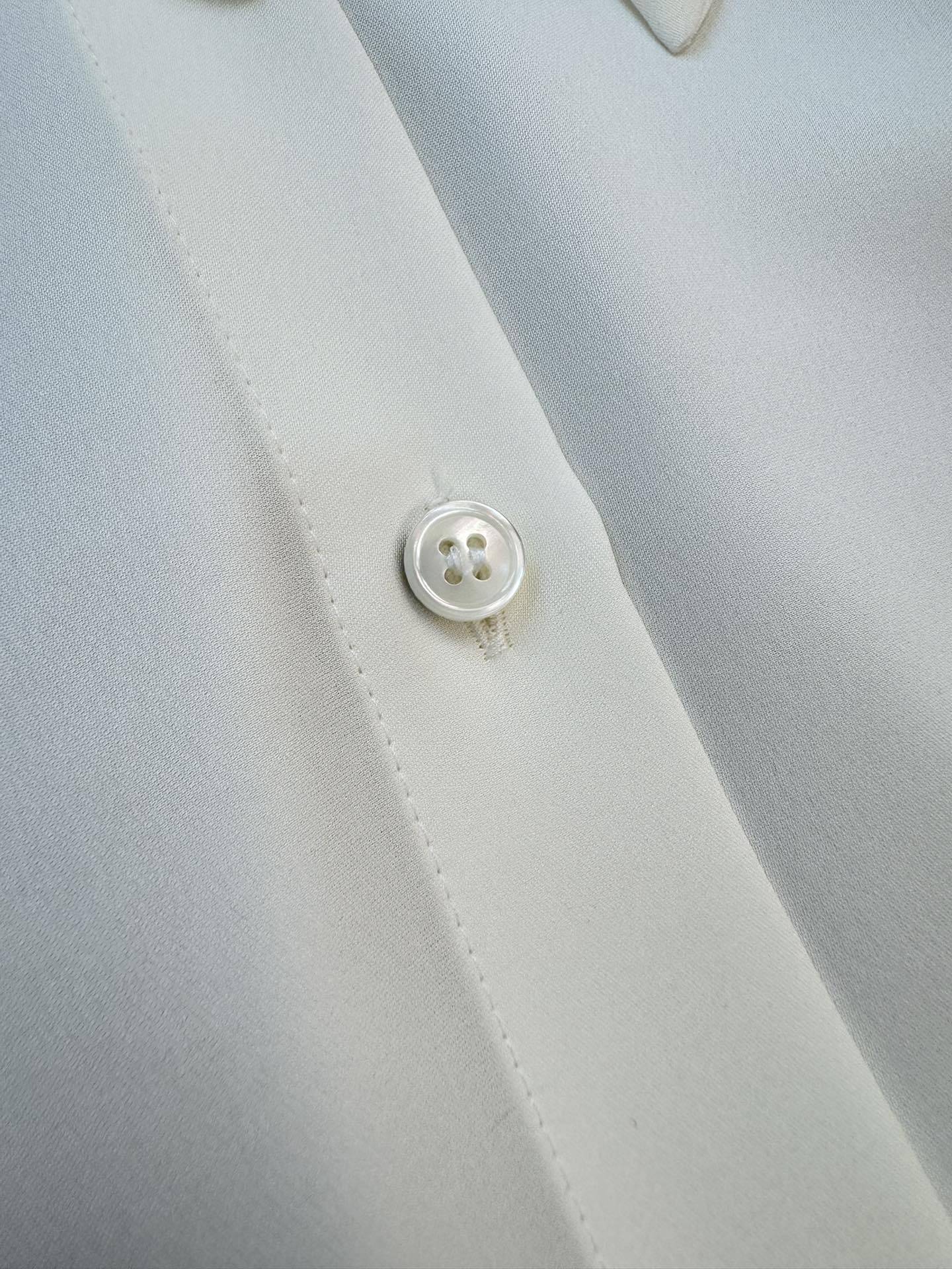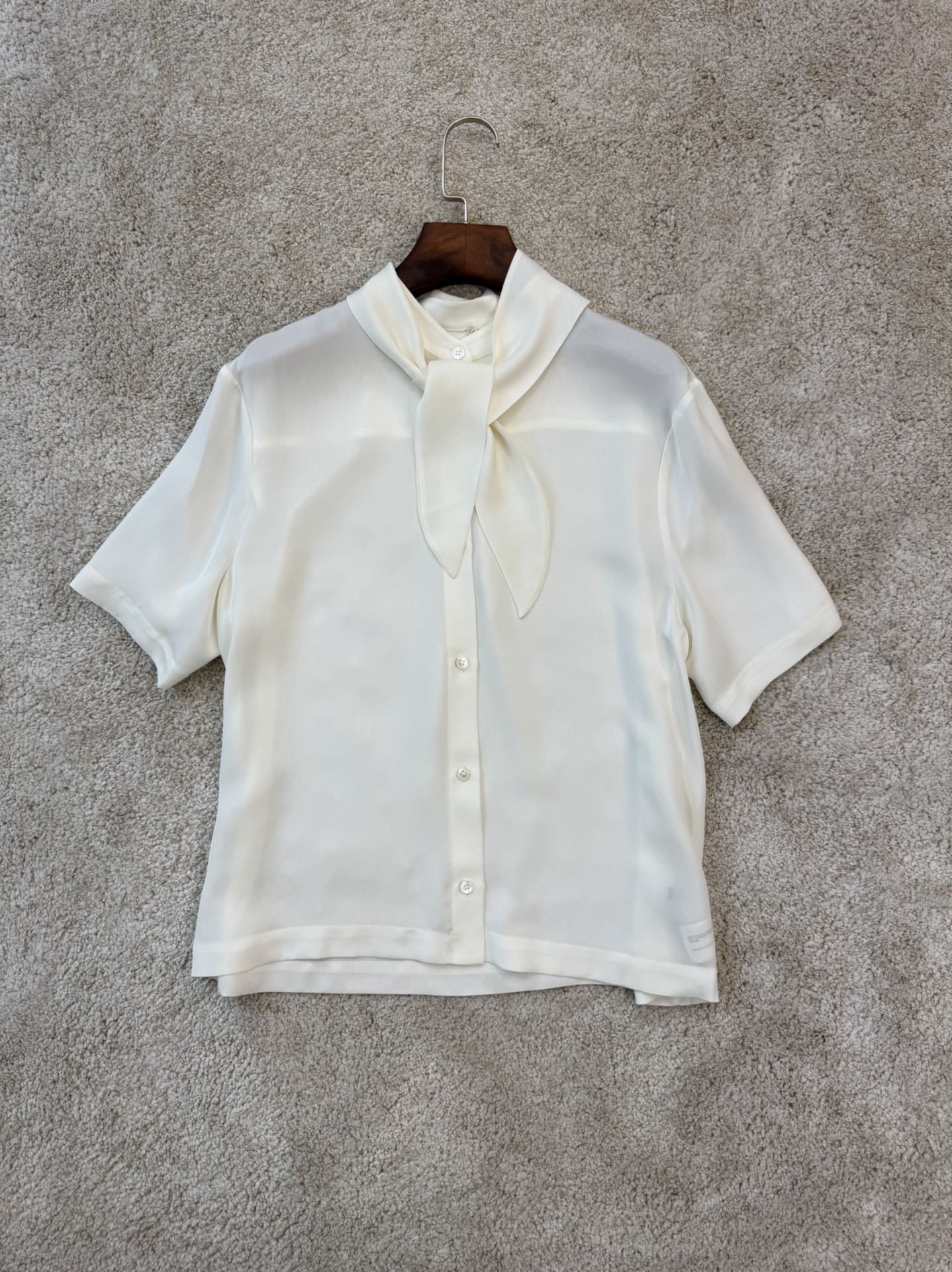 保Z,th家23姆米云朵真丝飘带短袖衬衫,杭州达.利集团专用客供原装面料扣子,非市面上的盗版面料哦,注意区分!!这个面料160一米😬😬飘带可以解,变装圆领穿也可以,可是th家核心面料之一,出自th面料研发中心,这批货是准纯正原厂,这种触感是F货无法比拟的,因为市场上所谓的双乔透露着不和谐的光泽,而纯正面料那种暗光泽是极具质感的. ⭐️飘带可拆卸⭐️,夏季搭配休闲长裤半裙都非常棒,透气休闲舒适,优雅知性美女范儿!两色: 象牙白,浅卡其,SML码。