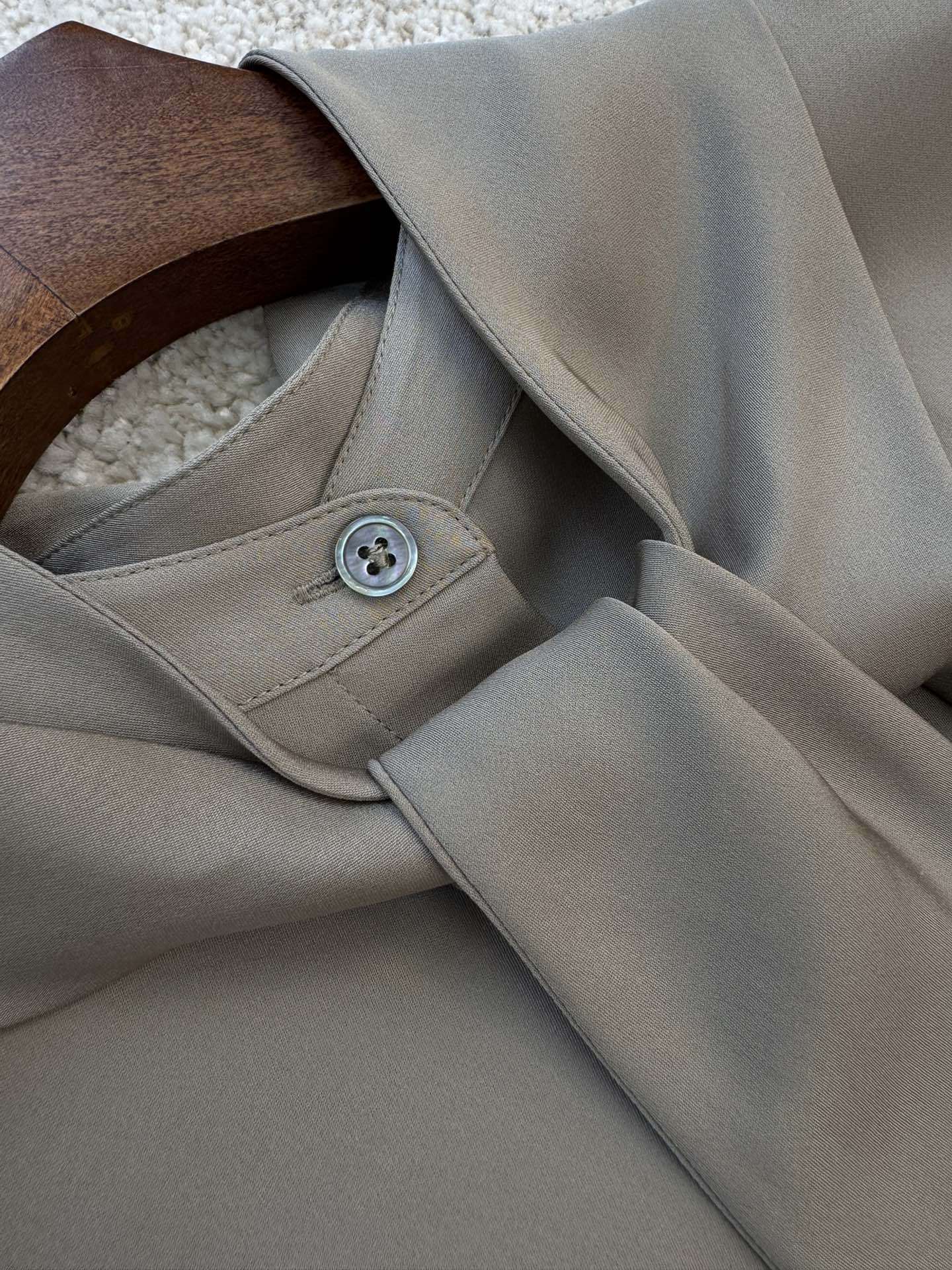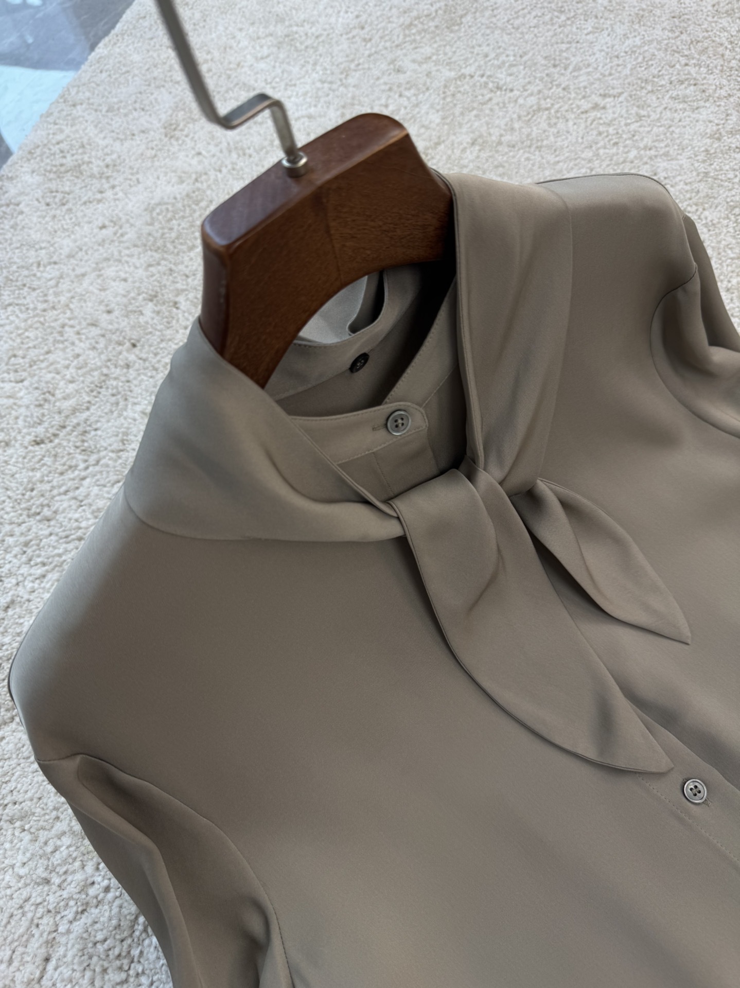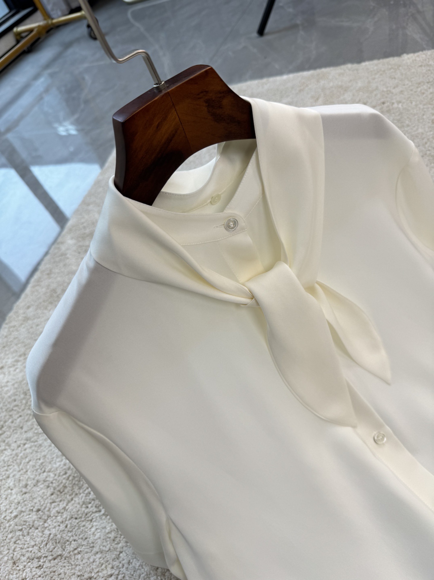 保Z,th家23姆米云朵真丝飘带短袖衬衫,杭州达.利集团专用客供原装面料扣子,非市面上的盗版面料哦,注意区分!!这个面料160一米😬😬飘带可以解,变装圆领穿也可以,可是th家核心面料之一,出自th面料研发中心,这批货是准纯正原厂,这种触感是F货无法比拟的,因为市场上所谓的双乔透露着不和谐的光泽,而纯正面料那种暗光泽是极具质感的. ⭐️飘带可拆卸⭐️,夏季搭配休闲长裤半裙都非常棒,透气休闲舒适,优雅知性美女范儿!两色: 象牙白,浅卡其,SML码。