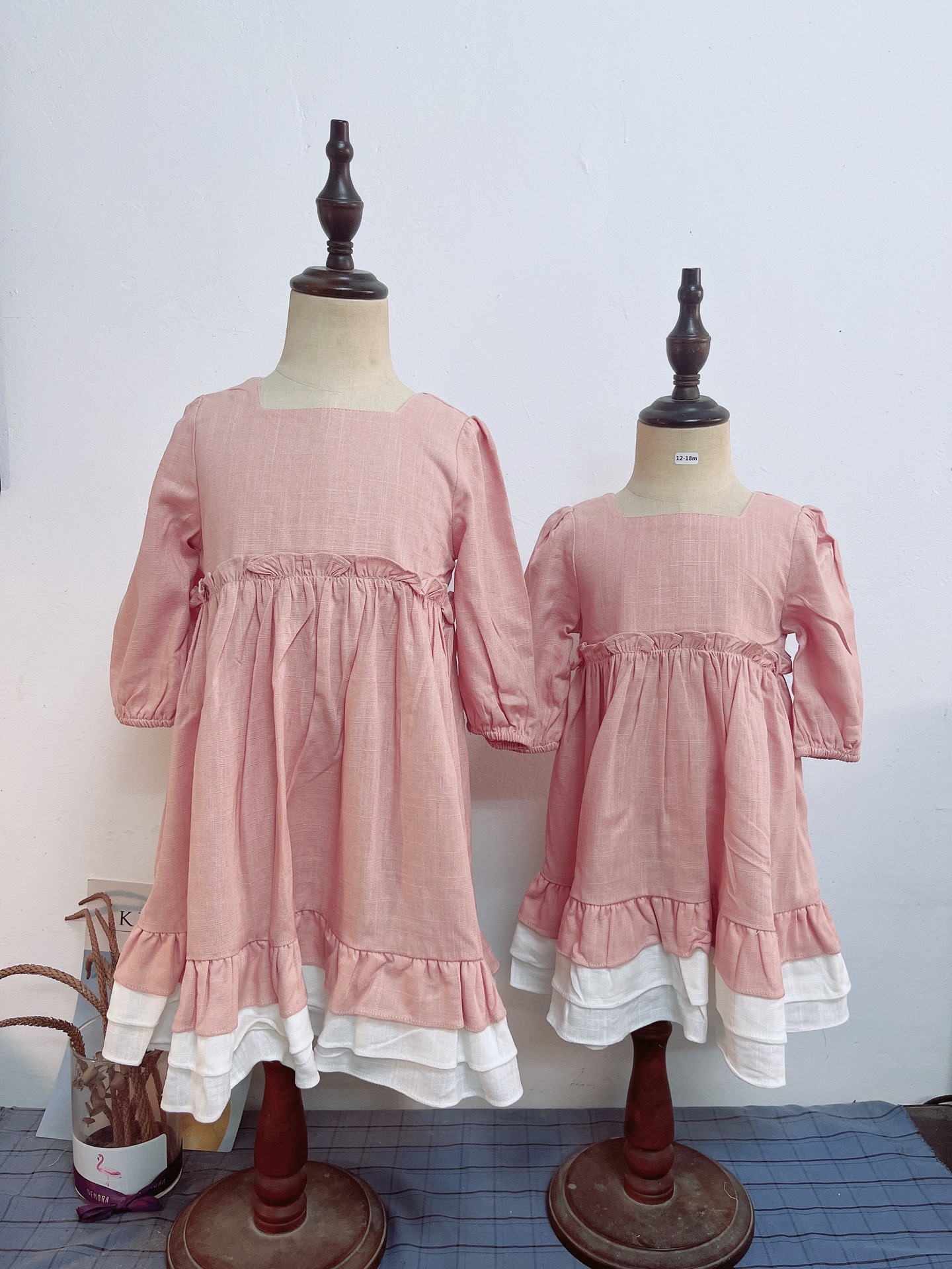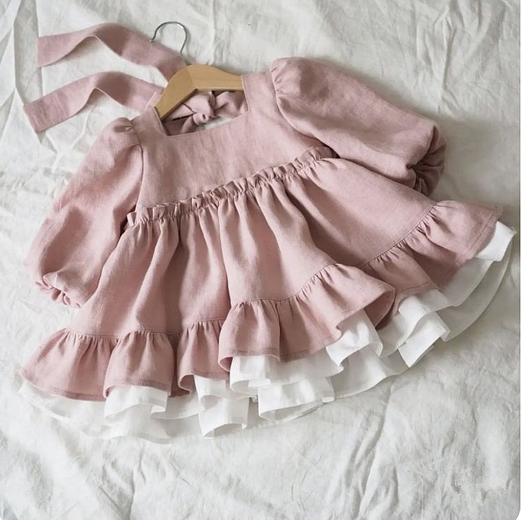 2025 가을, 겨울 소녀와 아동 의류 면화 및 린넨 긴팔 프릴 드레스와 대비 색상 드레스 레이스 업 공주 드레스 ins 크로스 보더스토어 가기