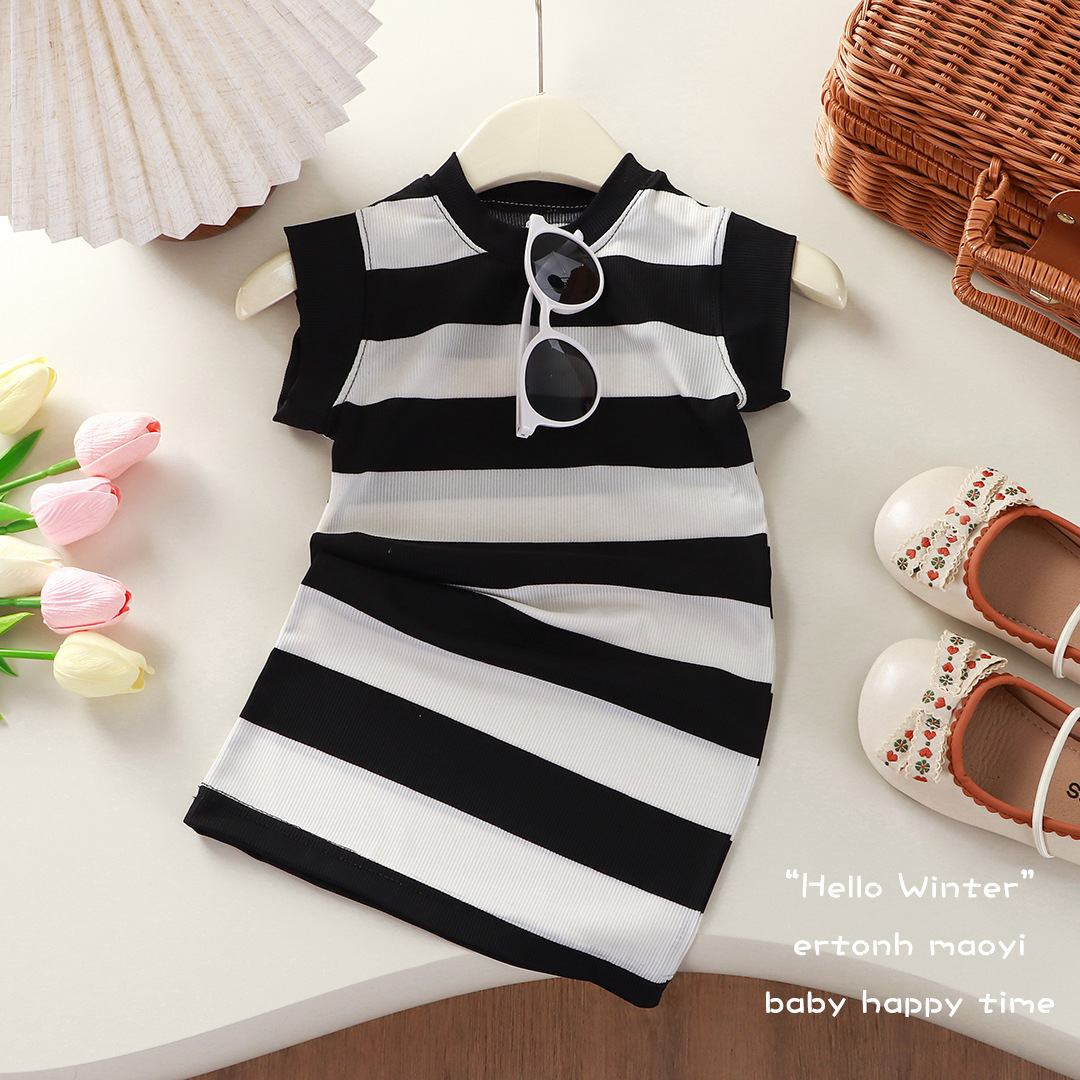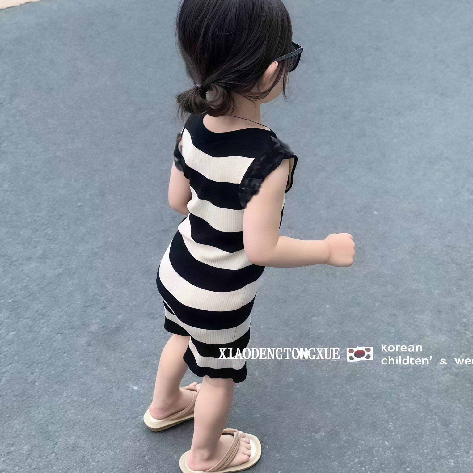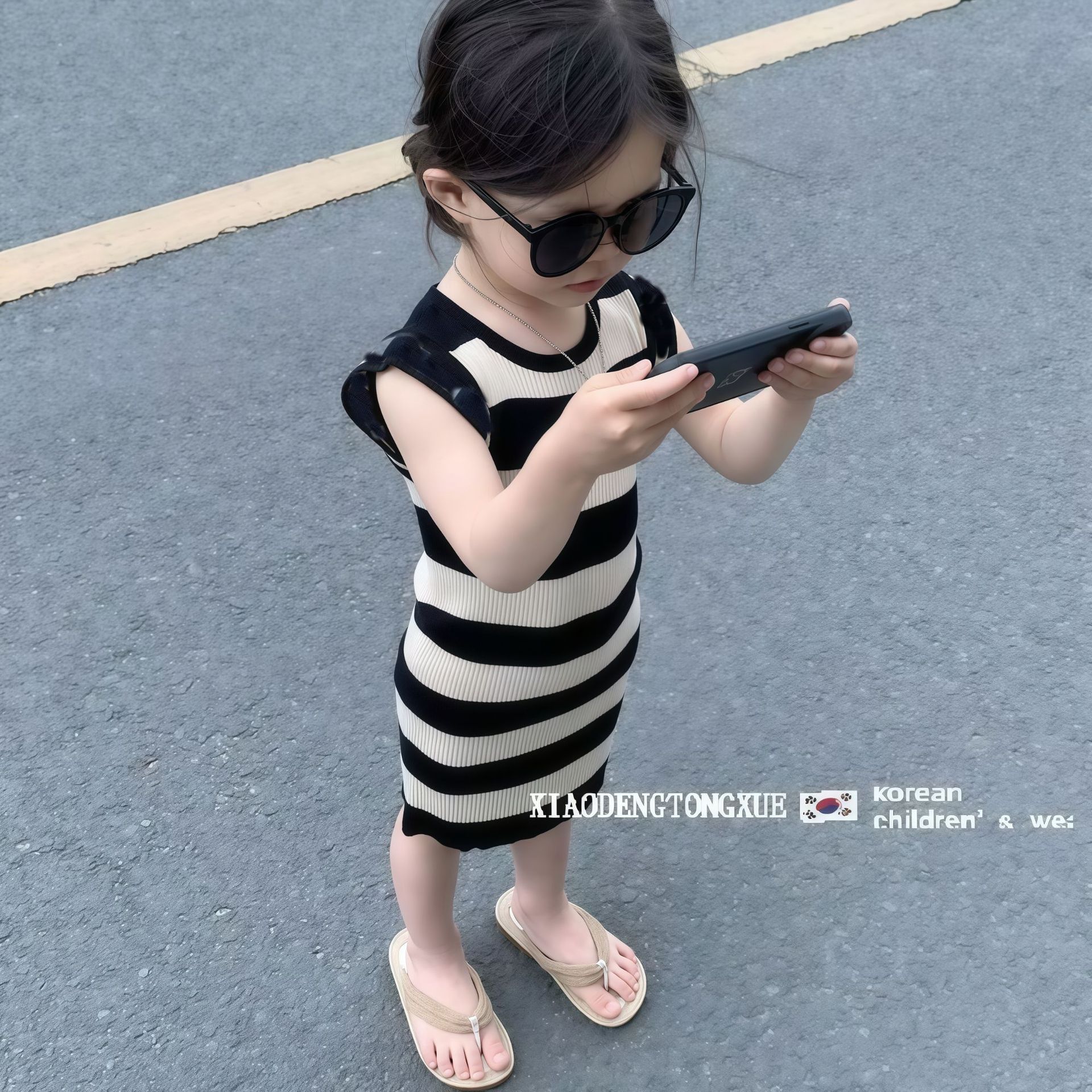 여름 민소매 롱 드레스, 새로운 스타일의 여아 베이비 드레스, 세련된 아이스 실크 얇은 스트라이프 무늬 중소형 아동용 힙커버 드레스
