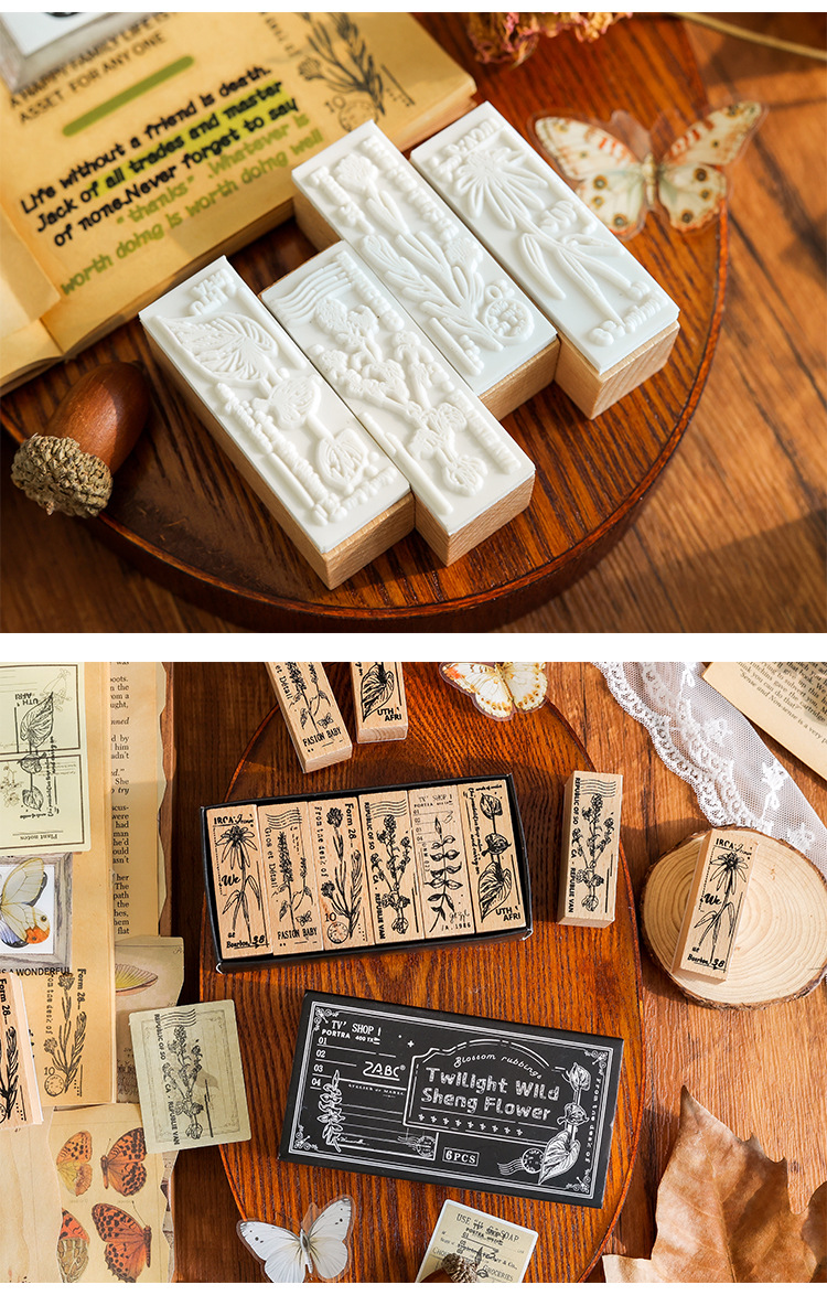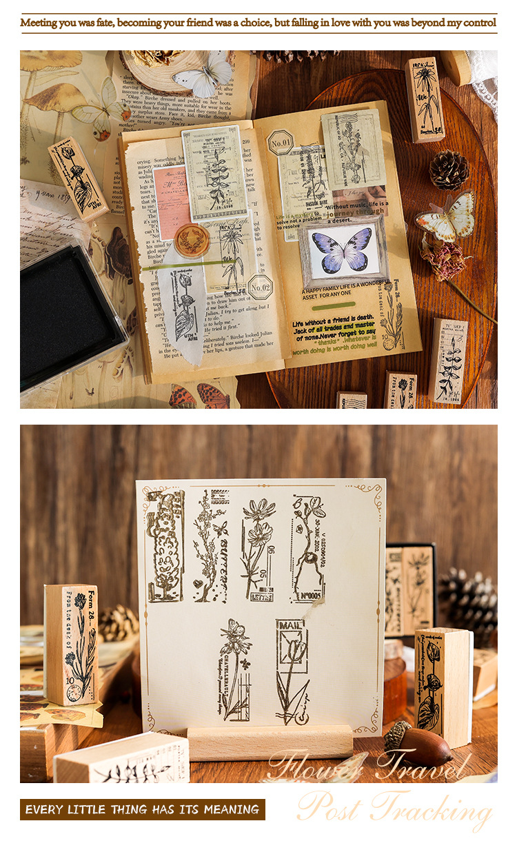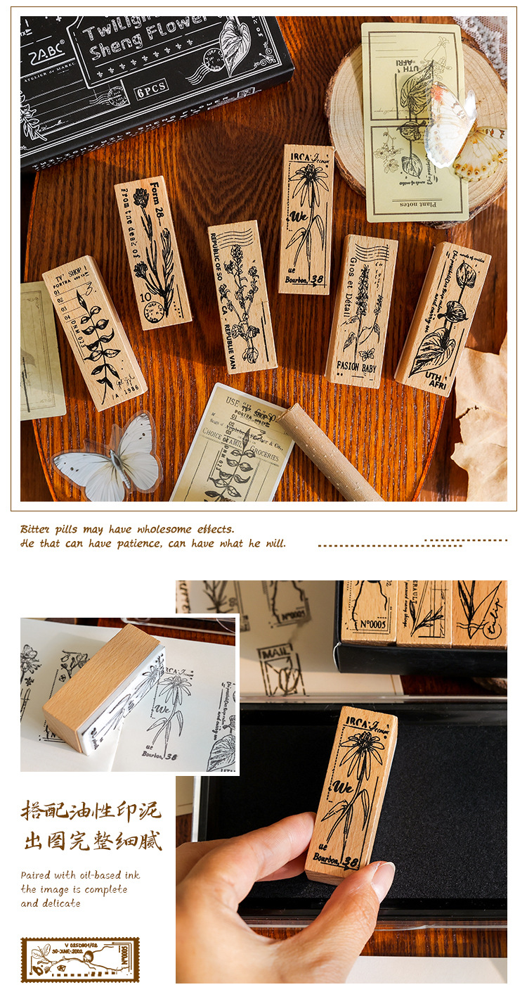 Yuezhen 꽃 인쇄 나무 스탬프 핸드북 스탬프 국경 간 식물 영어 diy 스탬프 나무 핸드북 스탬프