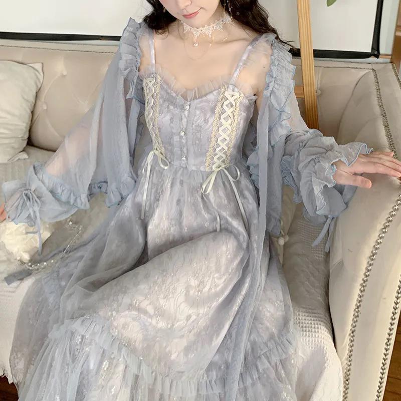 • 글레이즈드 블루 [아우터 원피스] 고급 쉬폰 주름 원단