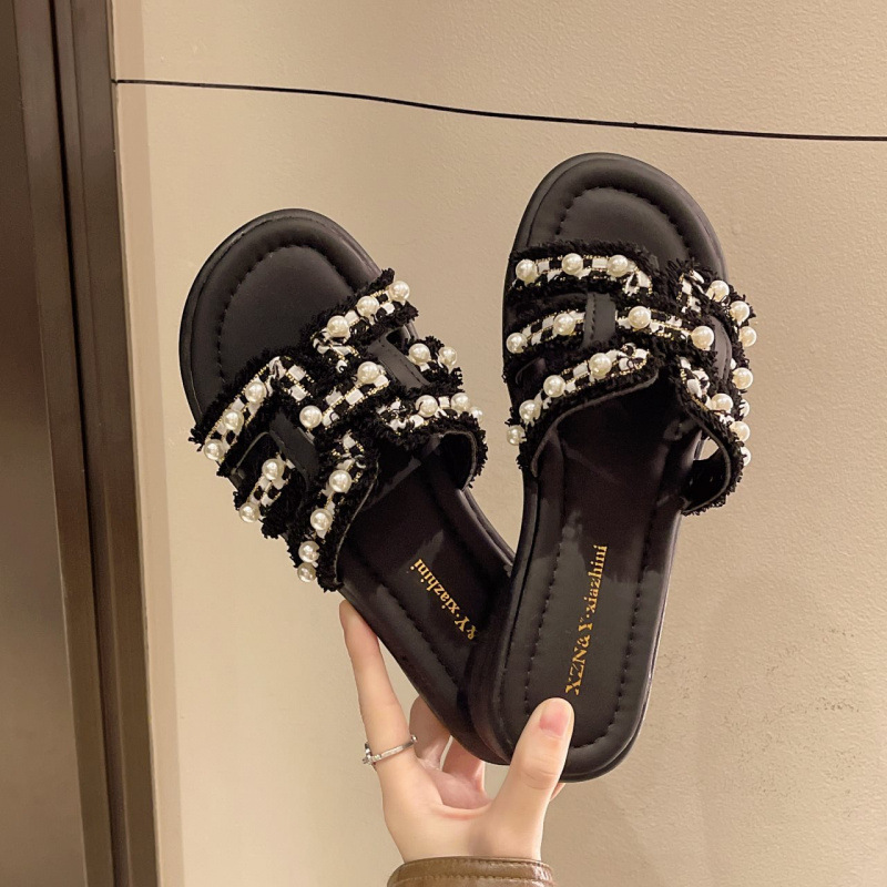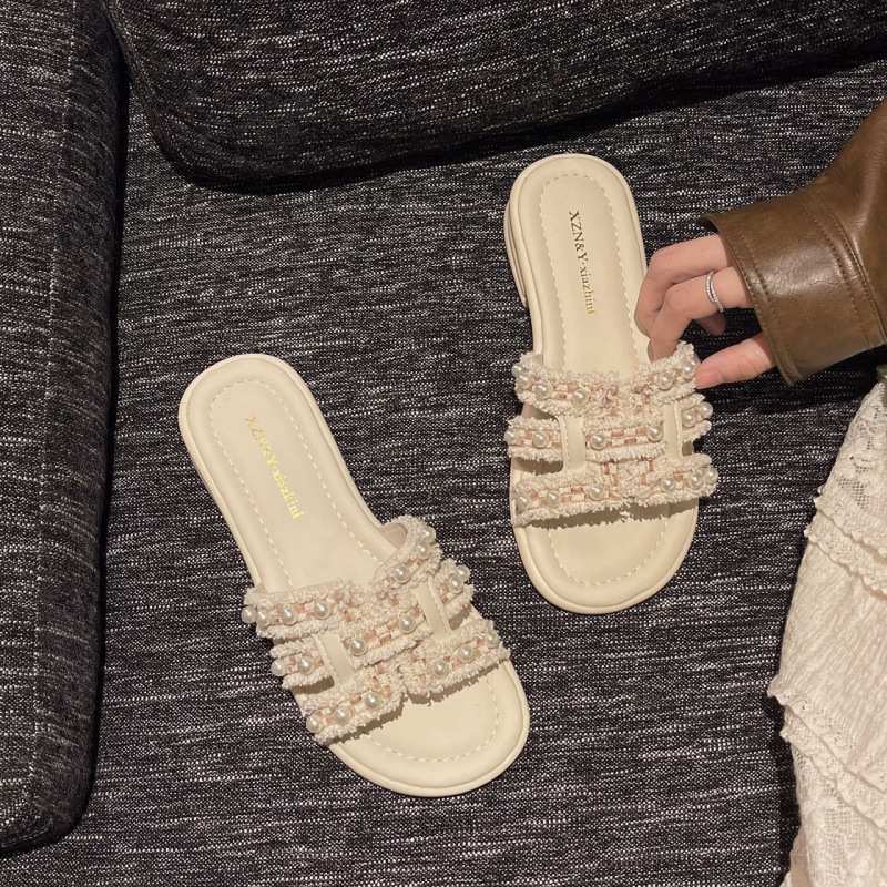 2025년 여름 신상 스타일 여성용 플랫 슬리퍼, 봄용 부드러운 밑창의 요정 다용도 진주 비치 샌들