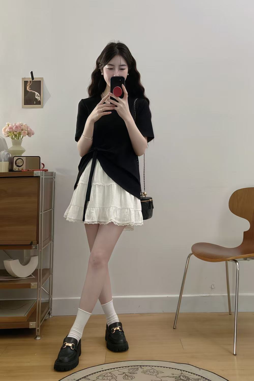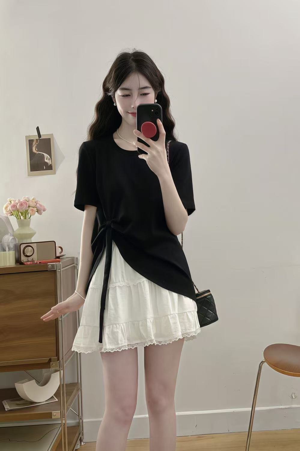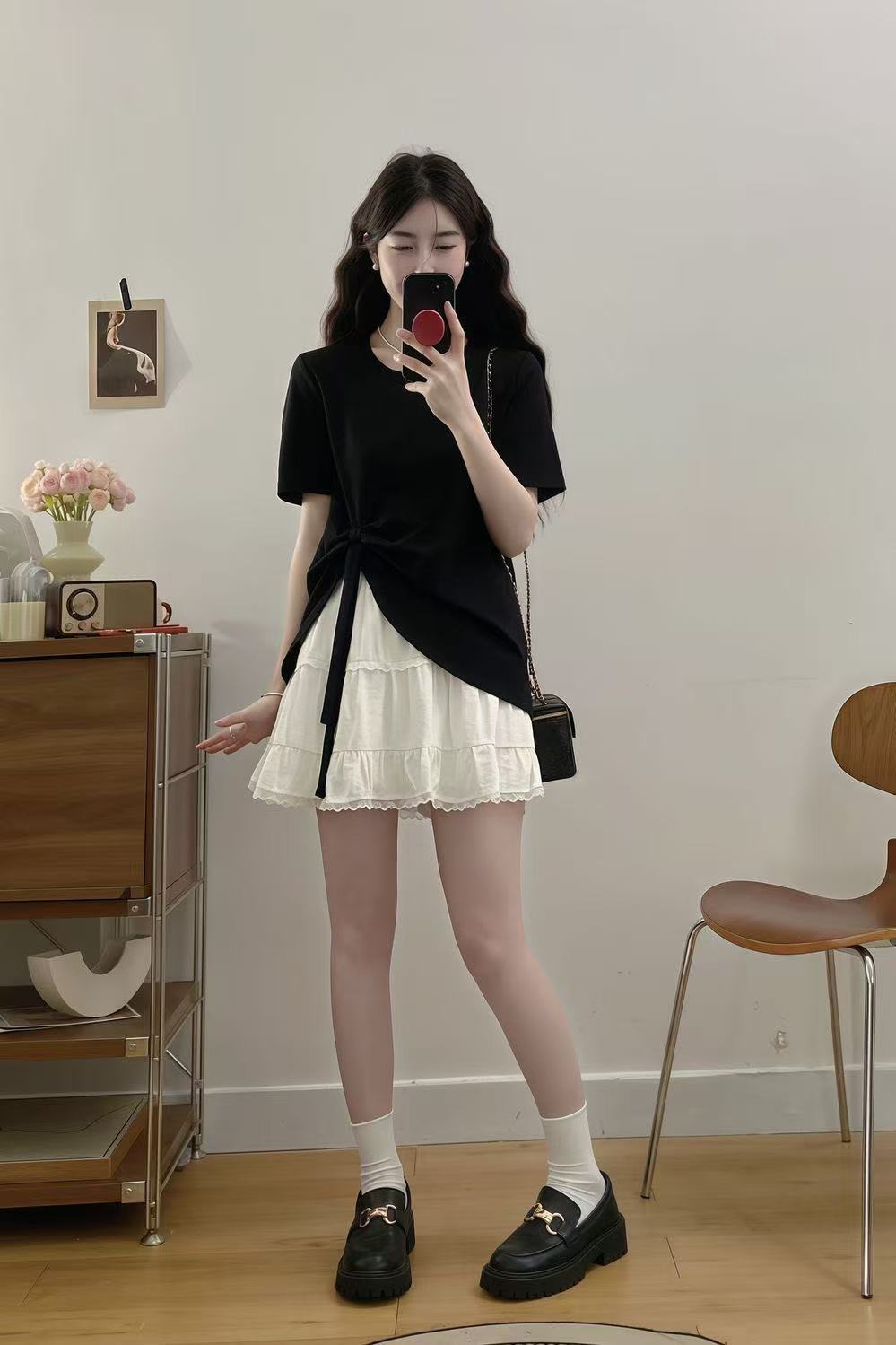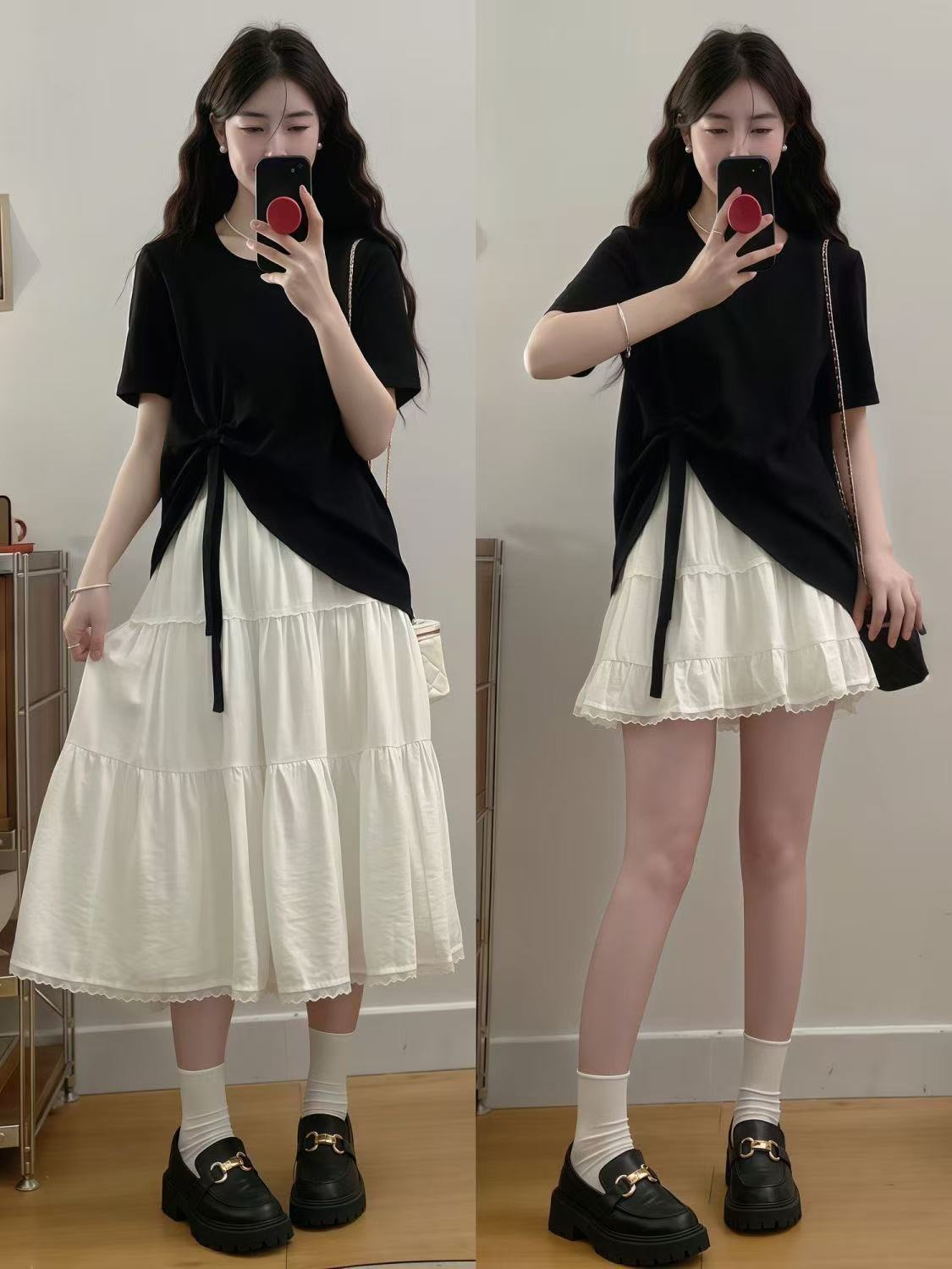 플러스 사이즈 여성 한국 드라마 의상 여름 나비넥타이 탑 뚱뚱한 여자 배를 커버하고 슬리밍 케이크 스커트 투피스 세트스토어 가기