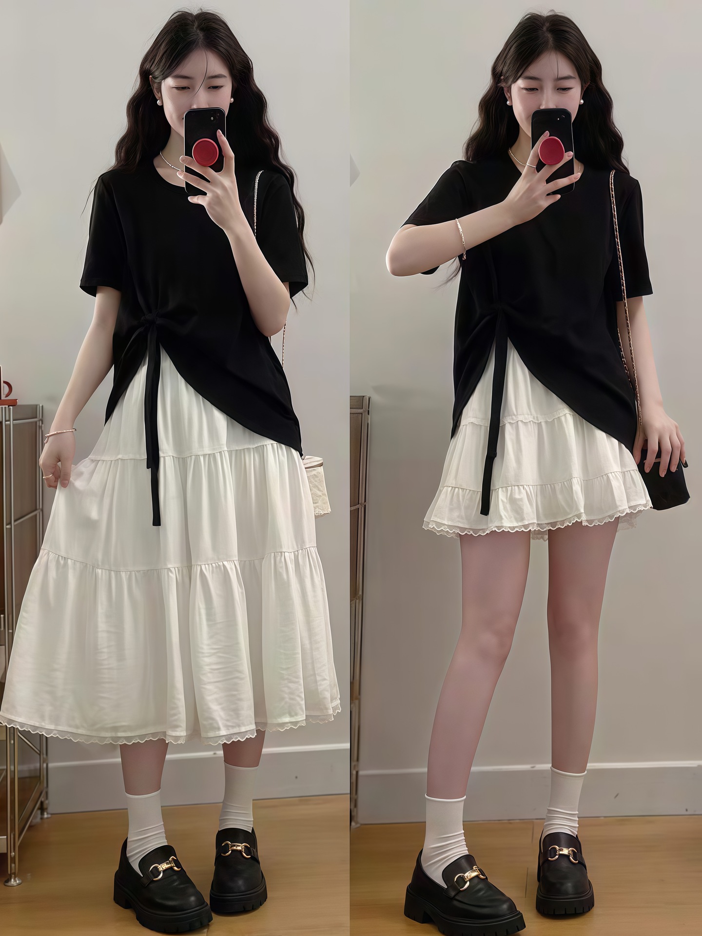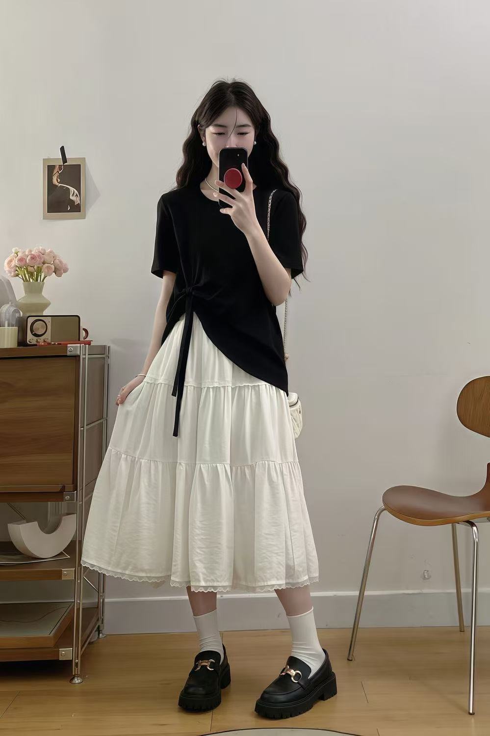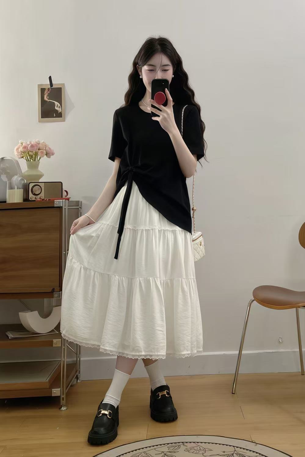플러스 사이즈 여성 한국 드라마 의상 여름 나비넥타이 탑 뚱뚱한 여자 배를 커버하고 슬리밍 케이크 스커트 투피스 세트