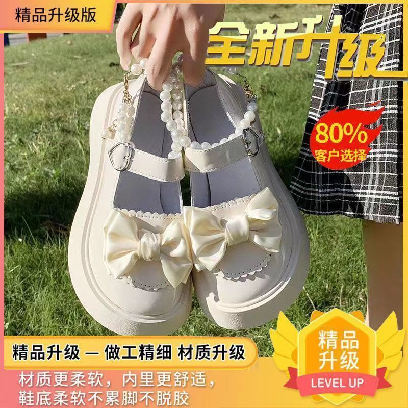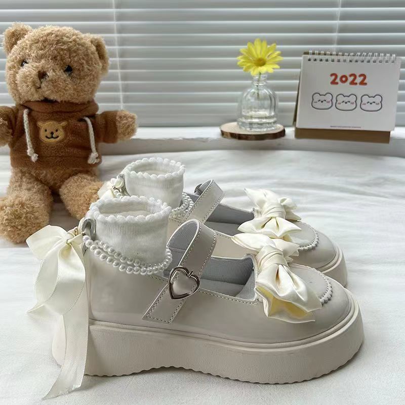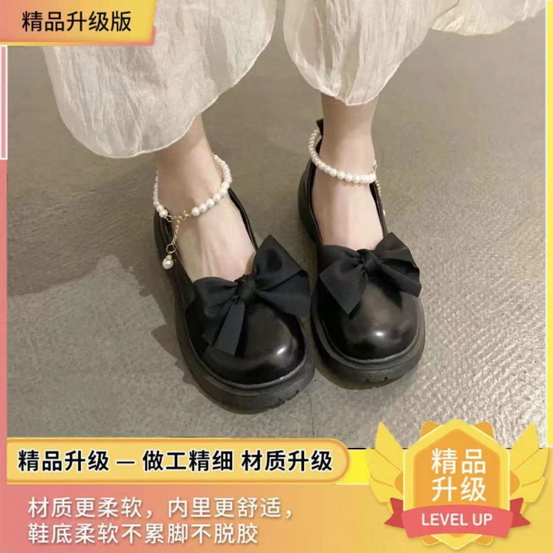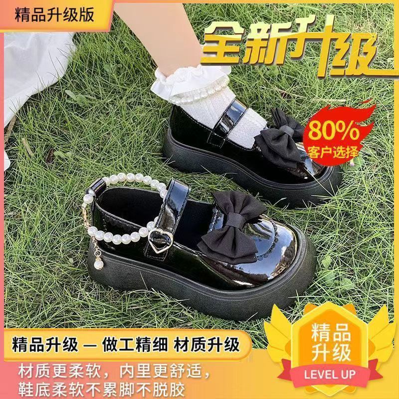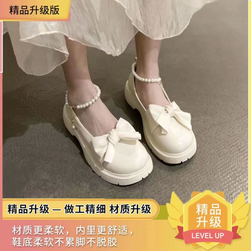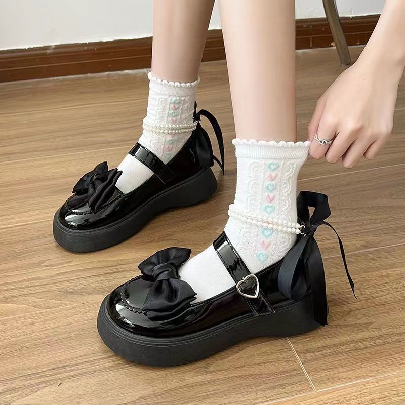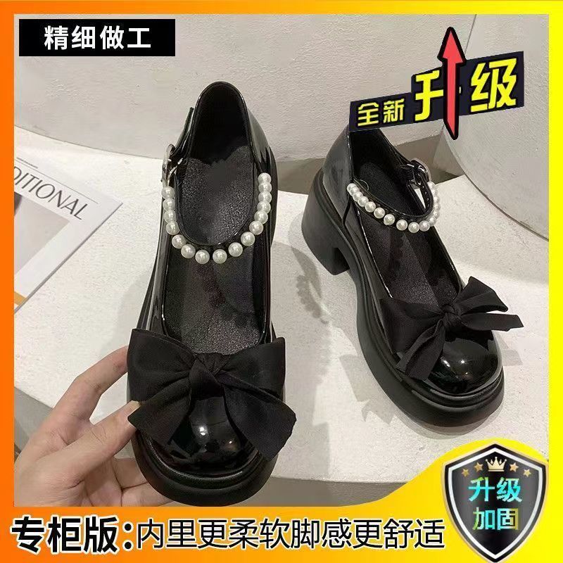 여성을위한 프랑스 메리 제인 작은 가죽 신발 2023 봄 새로운 두꺼운 밑창 스커트와 나비 매듭이있는 두꺼운 굽 하이힐