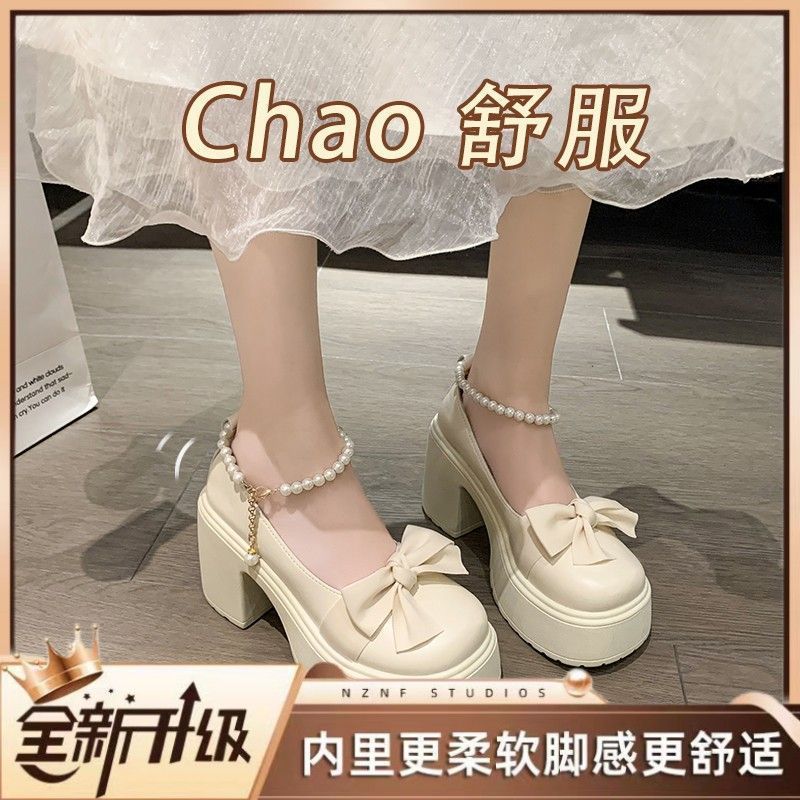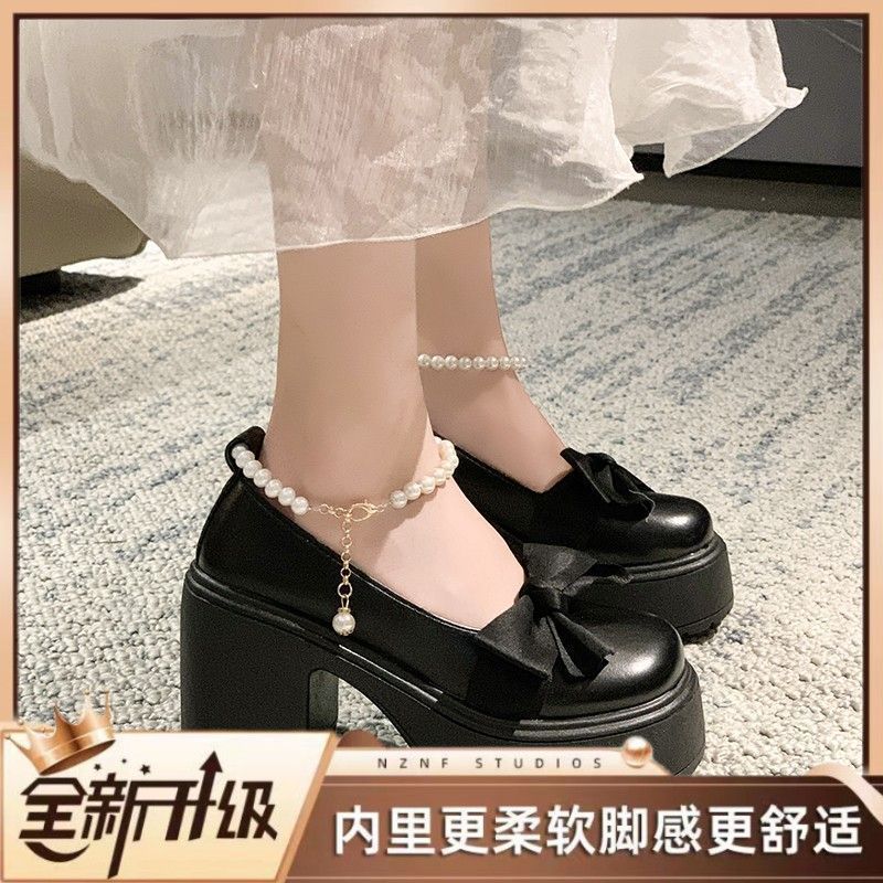 여성을위한 프랑스 메리 제인 작은 가죽 신발 2023 봄 새로운 두꺼운 밑창 스커트와 나비 매듭이있는 두꺼운 굽 하이힐스토어 가기